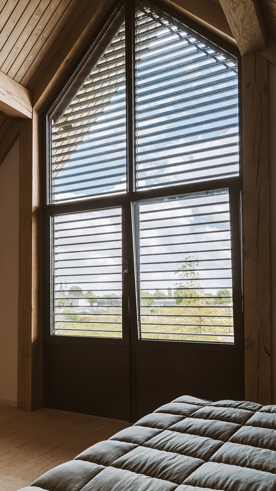 Das Fenster des Hauptschlafzimmers befindet sich an der rechten Seitenwand. Diese nach Südosten ausgerichtete Fassade lässt von Sonnenaufgang bis zum späten Nachmittag Sonne herein. Die Lamellen sind praktischerweise verstellbar.