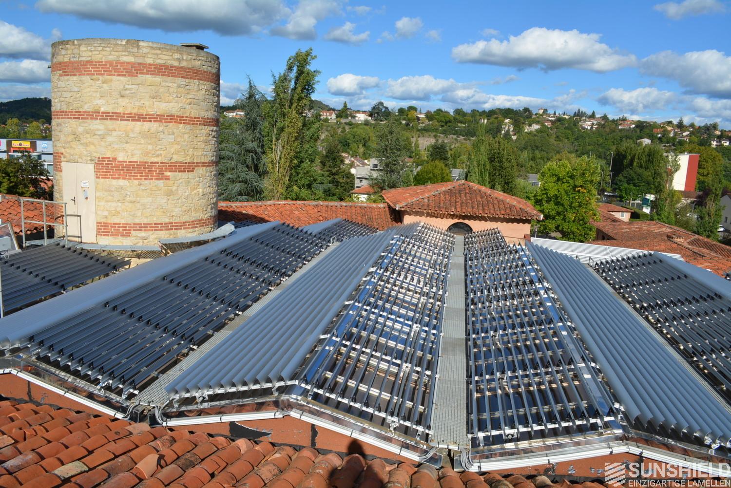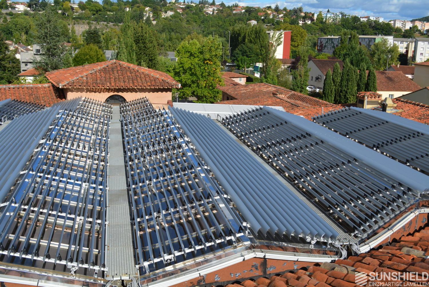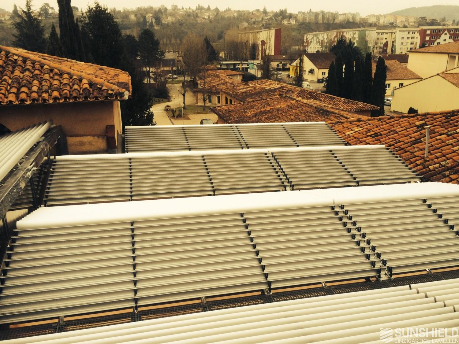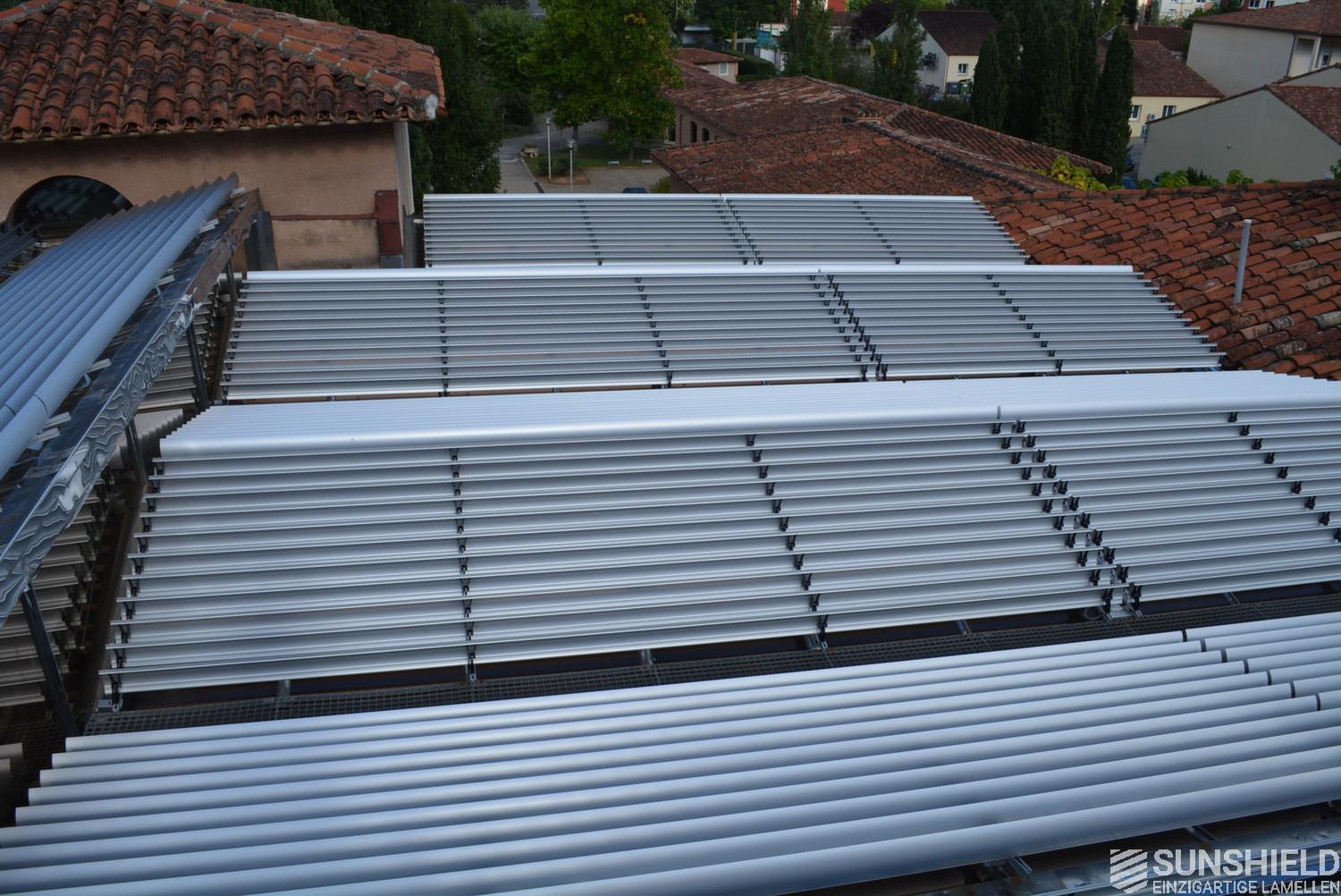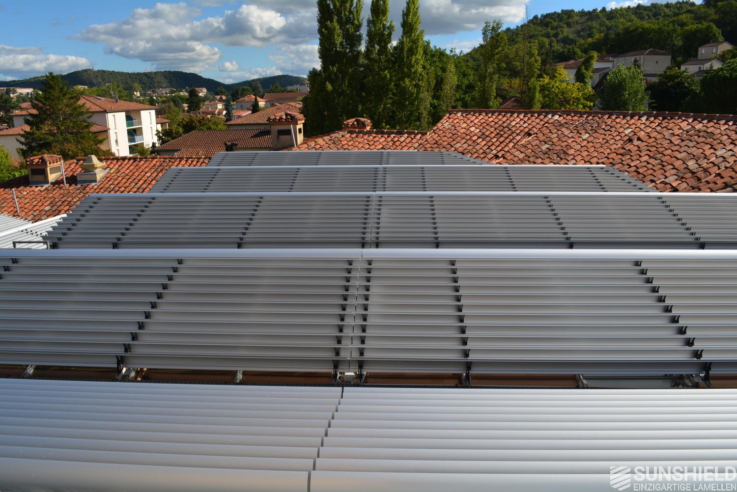 The solution has been designed and installed by Sunshield's business partner Selves in Montauban, with direct support of Somfy France for the automatic control and steering of the tilting louvers. The end result is a very robust and easy to operate system.