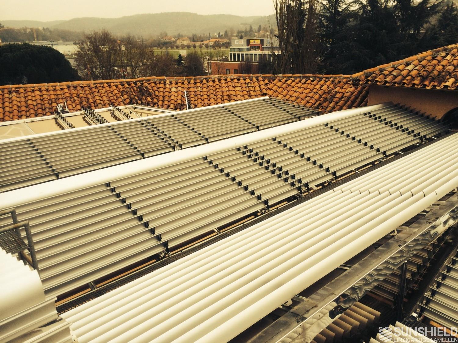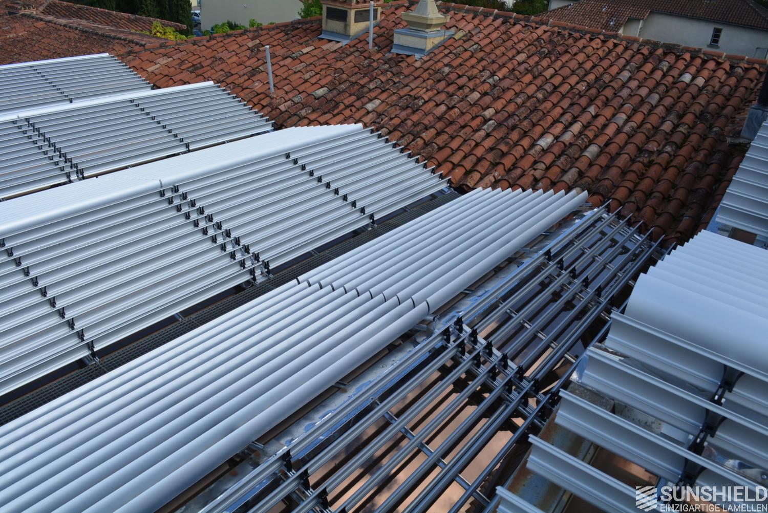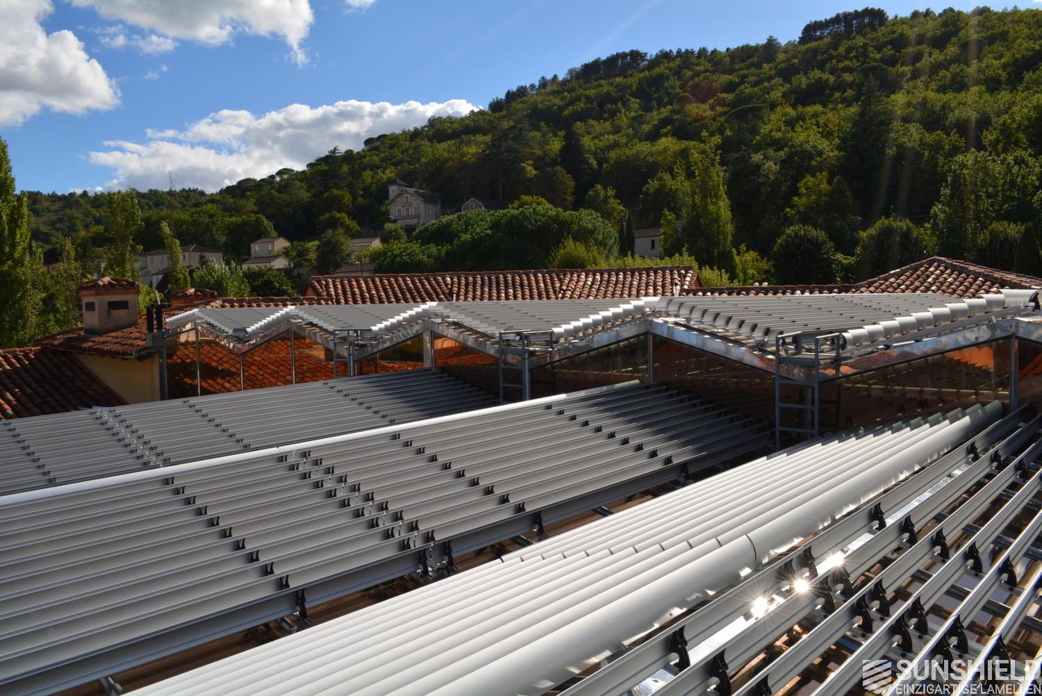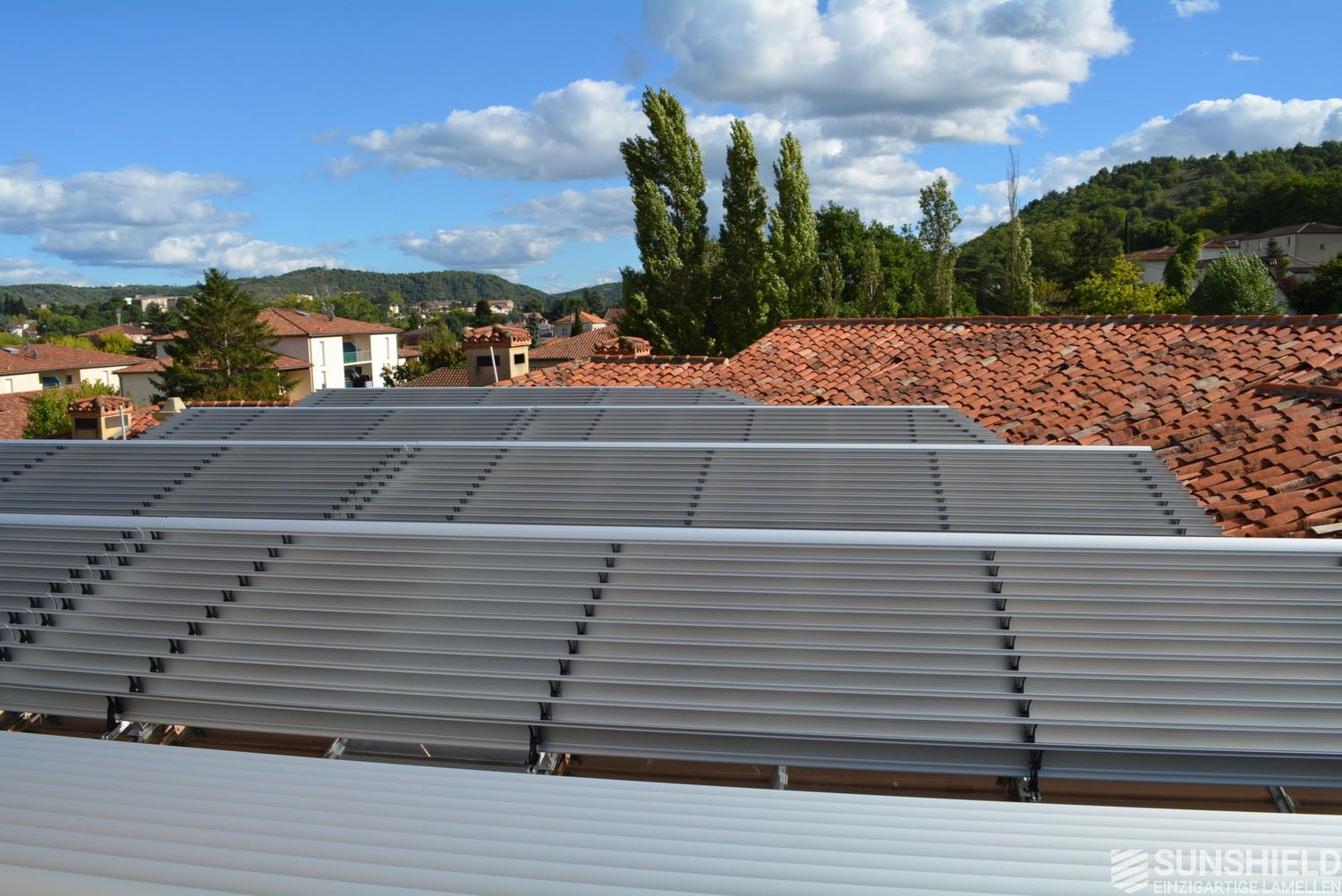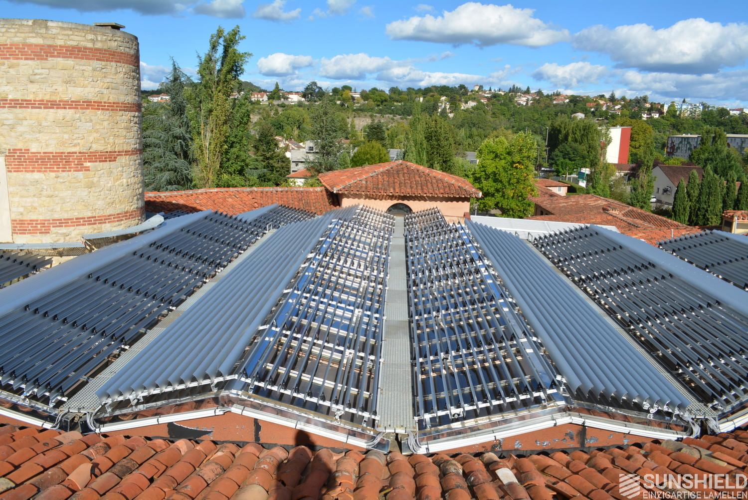 The solution has been designed and installed by Sunshield's business partner Selves in Montauban, with direct support of Somfy France for the automatic control and steering of the tilting louvers. The end result is a very robust and easy to operate system.