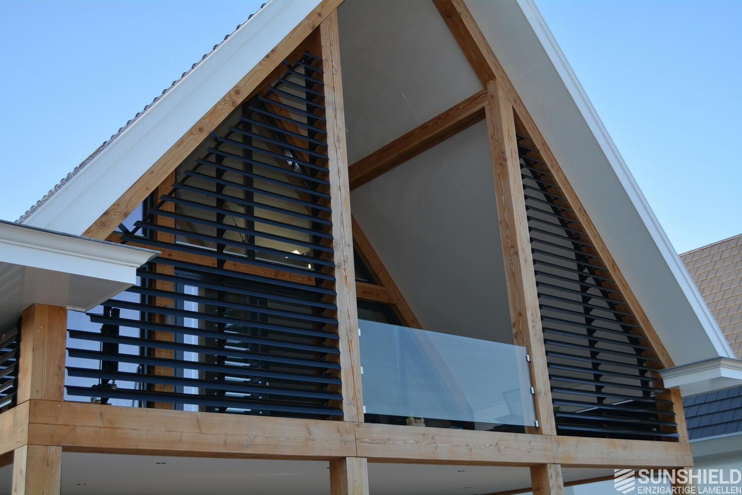 Here, in this region that is as green as it is water-rich, a detached house has been fitted with unique louvers. By Sunshield. A veranda has been created with slats, under the spacious overhang on the first floor.