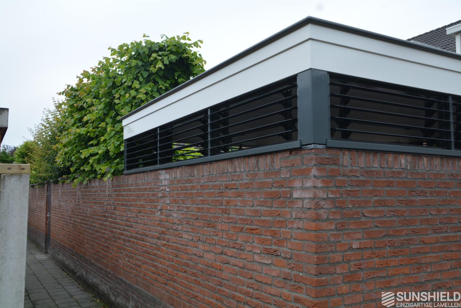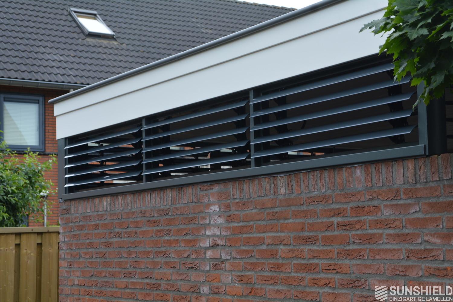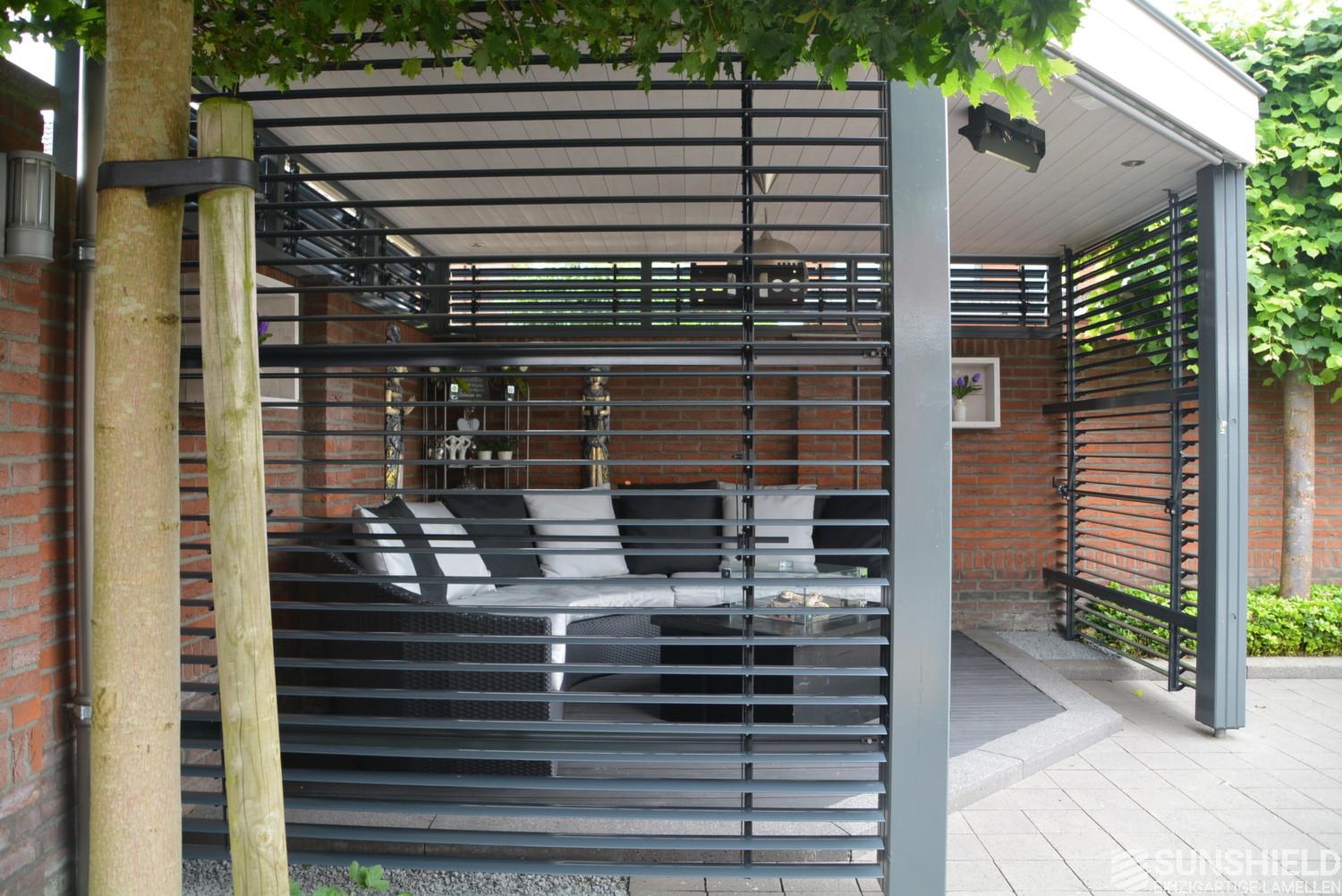 For a residence in Tilburg, a corner in the garden was tranformed into a garden house. With just two louver walls. The other two walls were supplied by the existing brick wall, surrounding the garden. Since a roof, a little higher than the brick wall, was desired six "windows" from blinds were added. The 75-E louver was chosen for this project. The louvers and mounting materials are coated in anthracite grey (RAL 7016).
