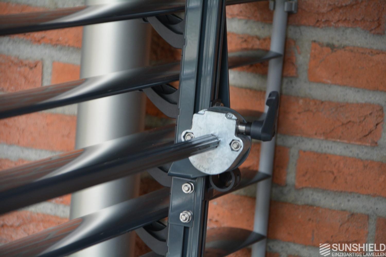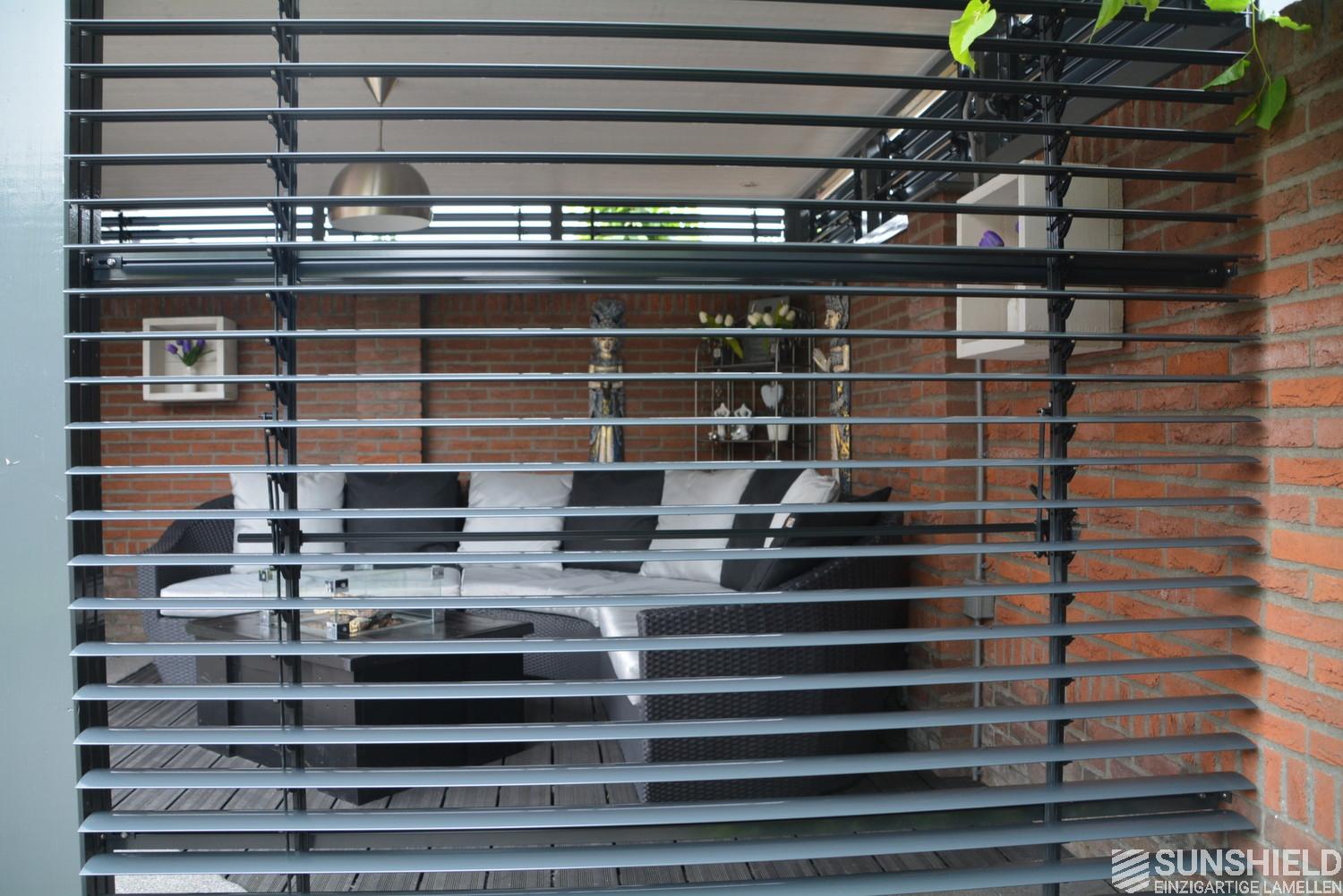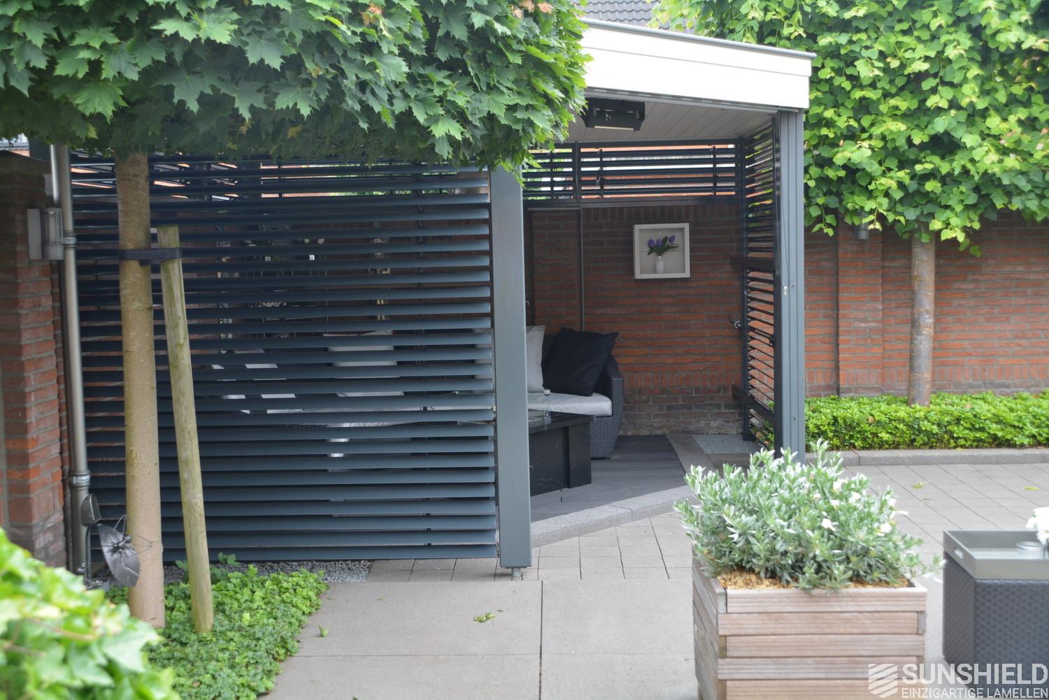 For a residence in Tilburg, a corner in the garden was tranformed into a garden house. With just two louver walls. The other two walls were supplied by the existing brick wall, surrounding the garden. Since a roof, a little higher than the brick wall, was desired six "windows" from blinds were added. The 75-E louver was chosen for this project. The louvers and mounting materials are coated in anthracite grey (RAL 7016).
