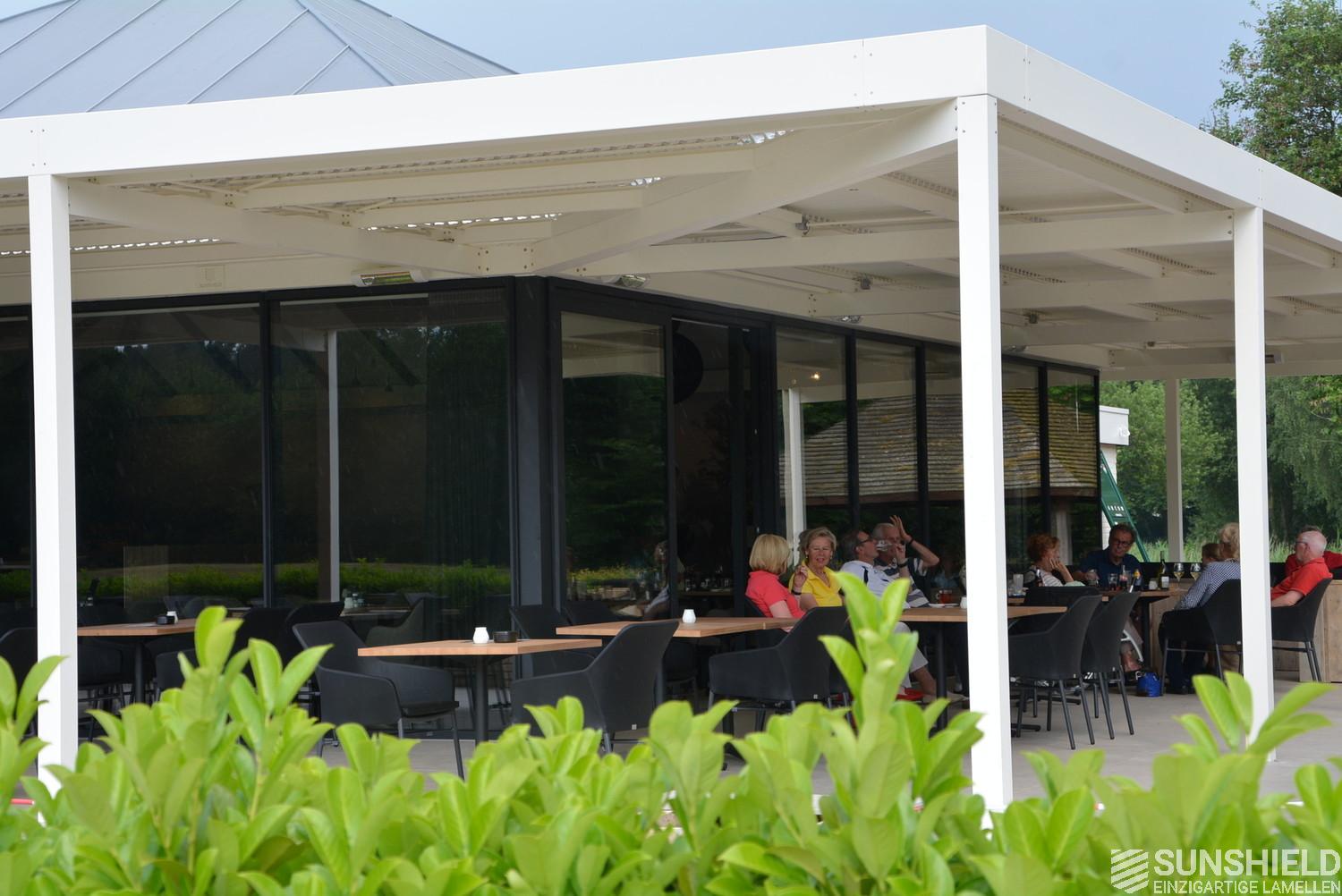 At the Golfclub Overbrug in Helmond, the south and west sides of the renovated clubhouse, have been extended with a beautiful Infinity louver roof with 160 m2 of movable louvers (slats).