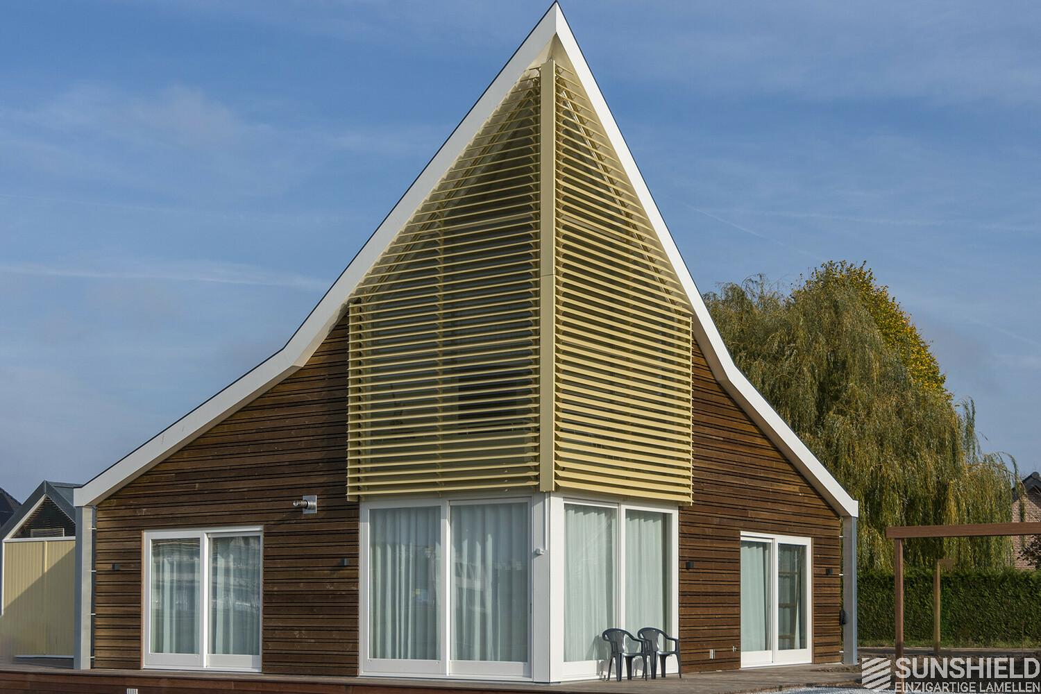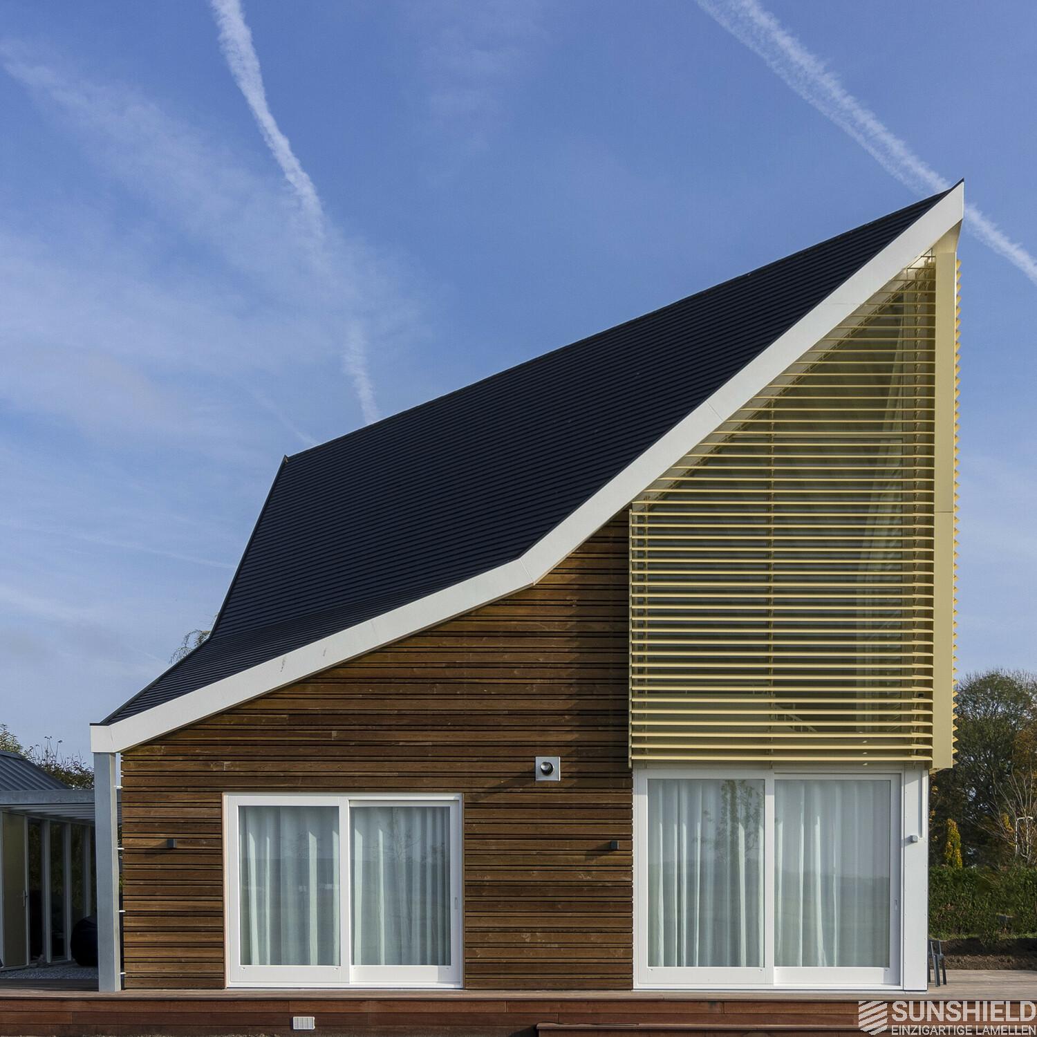 This detached house has wooden cladding in a dark brown colour. For contrast, the louver systems are finished in RAL 1014, ivory-coloured yellow. A particularly successful combination. The plastic parts are white.