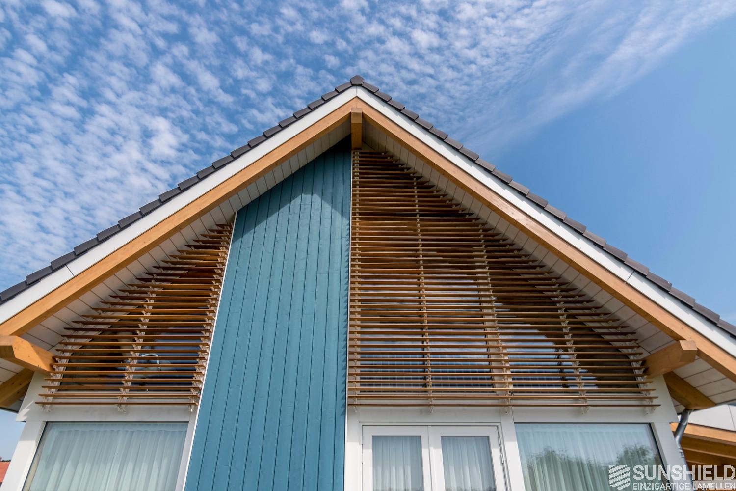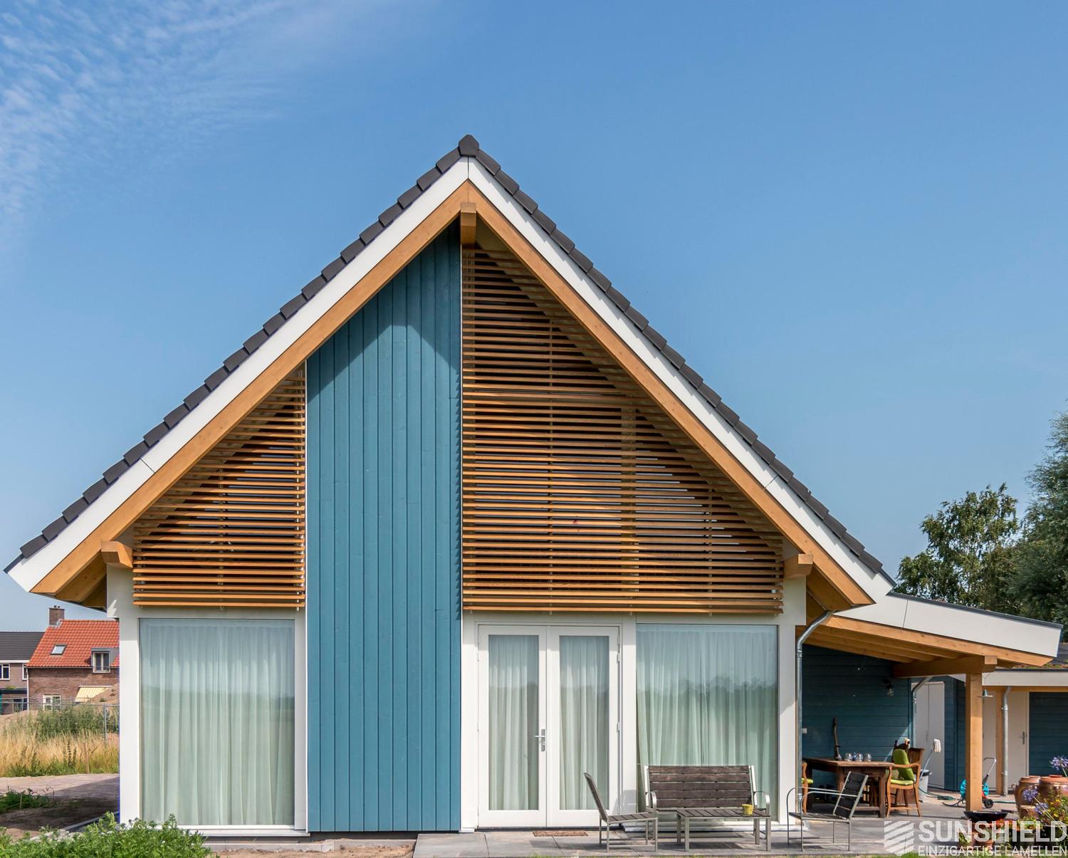 In Leuth in the province of Gelderland (NL), Sunshield has equipped a modern barn house with trapezoidal louvers. The movable outdoor slats are made of wood and fit in perfectly with the Scandinavian style of the timber-framed house.