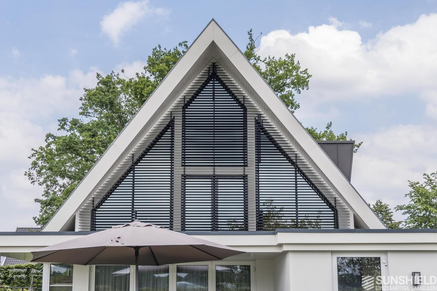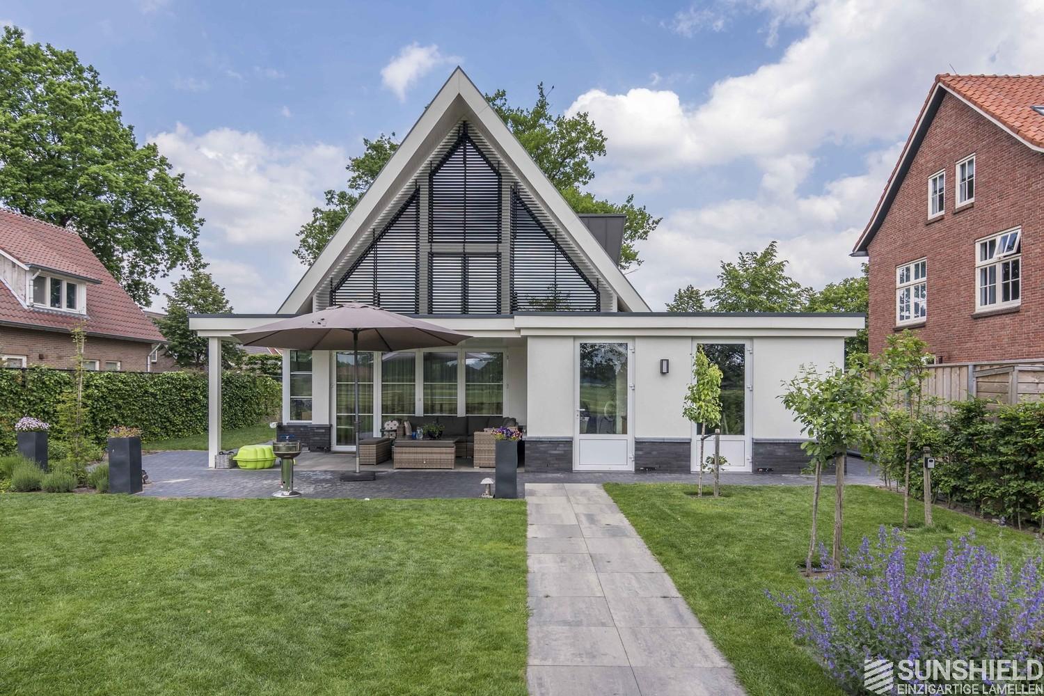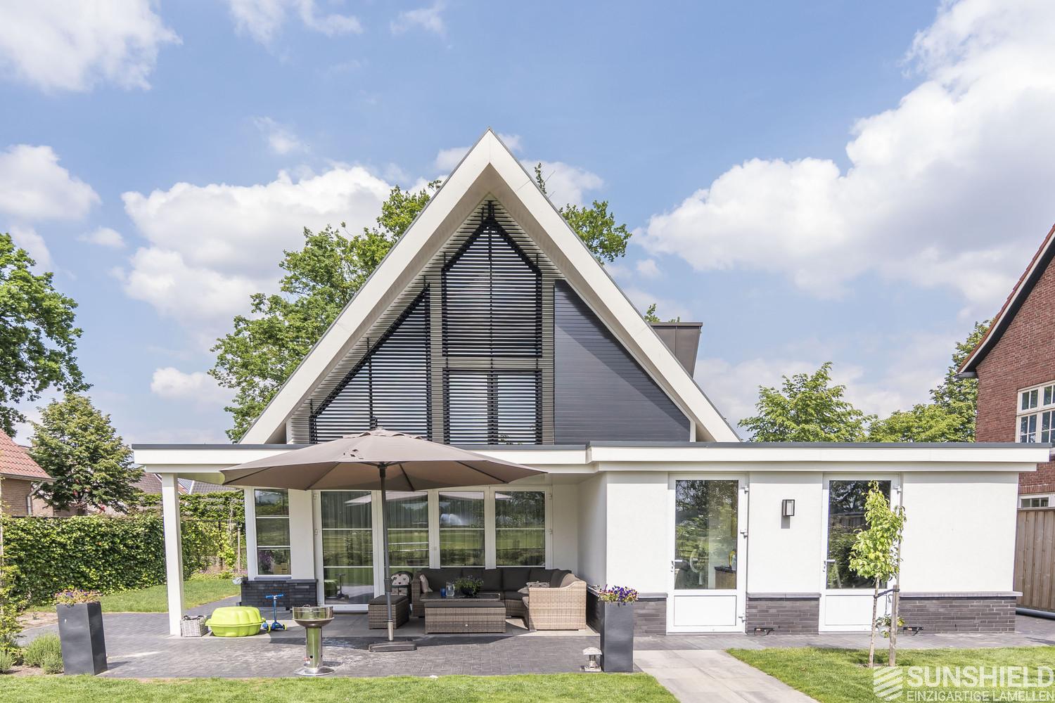 In the picturesque town of Denekamp, ​​in the province of Overijssel (NL), a new house is equipped with two louver systems. Both sunshields are triangular in shape and have a combined surface of almost 16 m2.