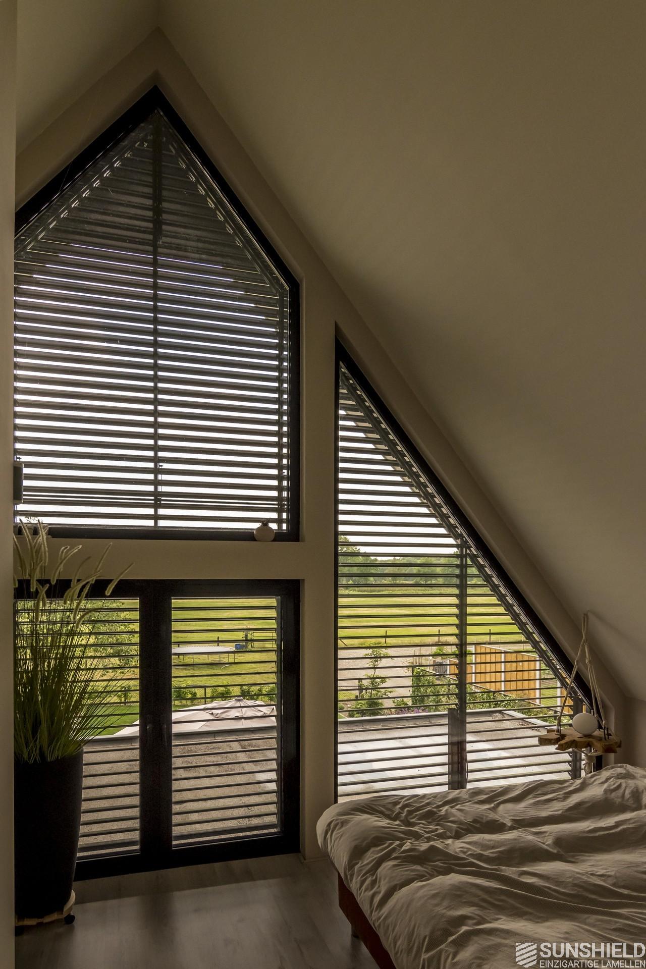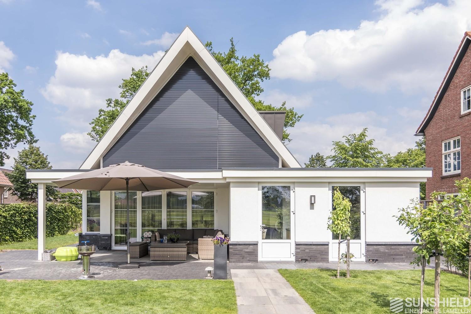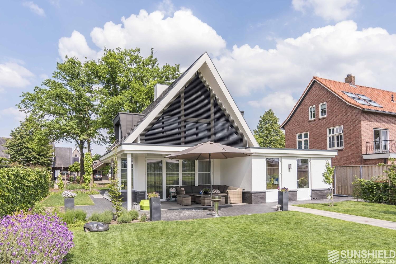 In the picturesque town of Denekamp, ​​in the province of Overijssel (NL), a new house is equipped with two louver systems. Both sunshields are triangular in shape and have a combined surface of almost 16 m2.
