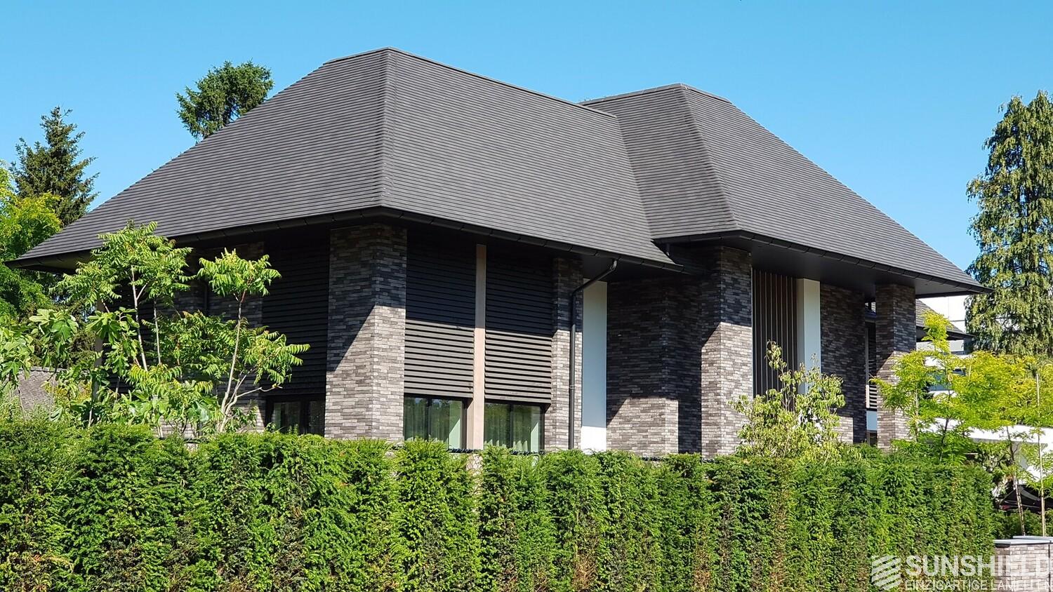 The owners selected the 96-E louver, a blade with a sleek shape. These louvers are first brushed and then anodized in Alubronze 04. The other aluminum parts are coated in RAL 9005. During the coating, a fine structure is added to the RAL powder. This gives the coated parts a fine relief.