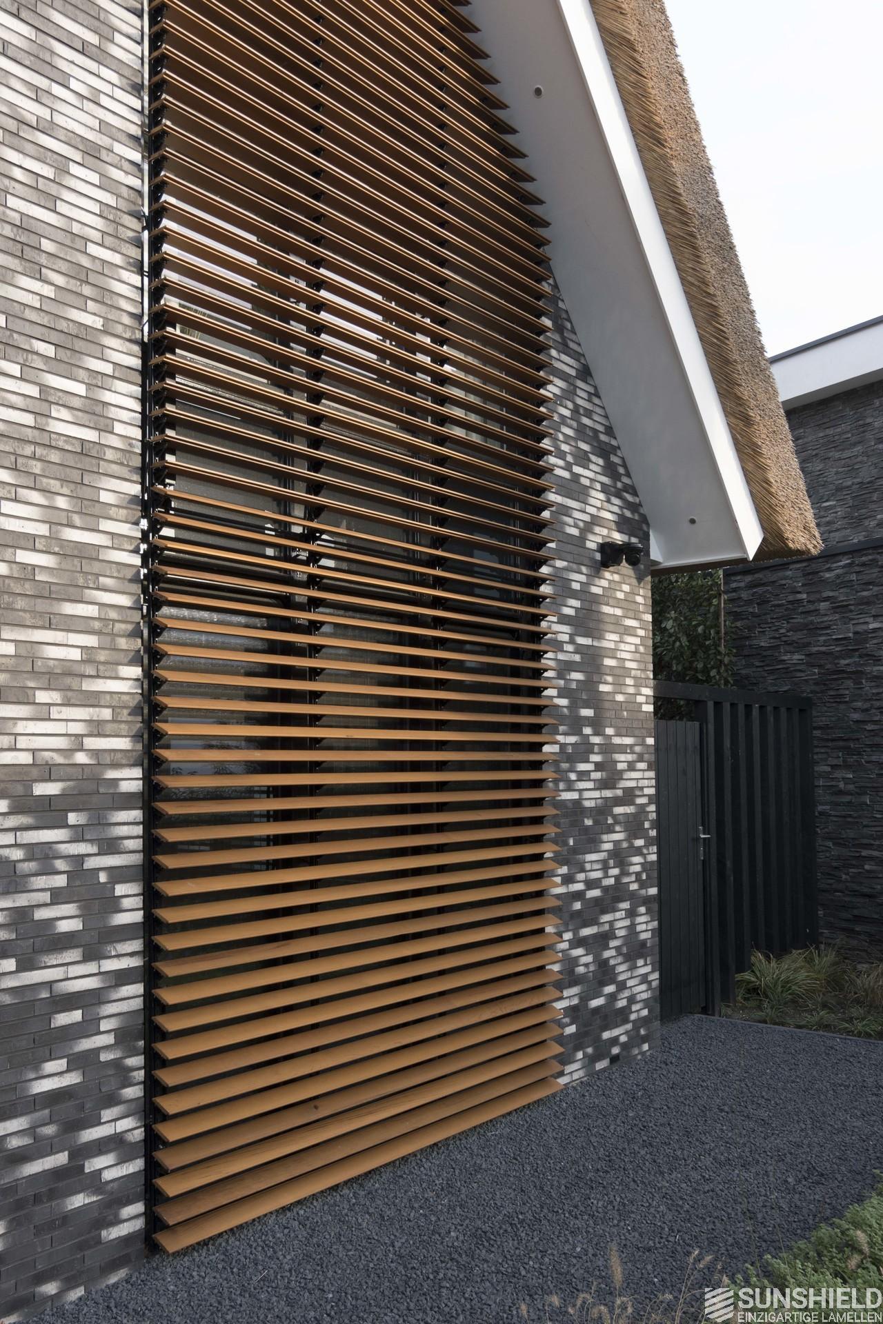 The residents have opted for the 98-W louver. A 98 mm high wooden blade of Western Red Cedar. The Western Red Cedar is treated with Drywood Woodstain which leaves the wood structure clearly visible.