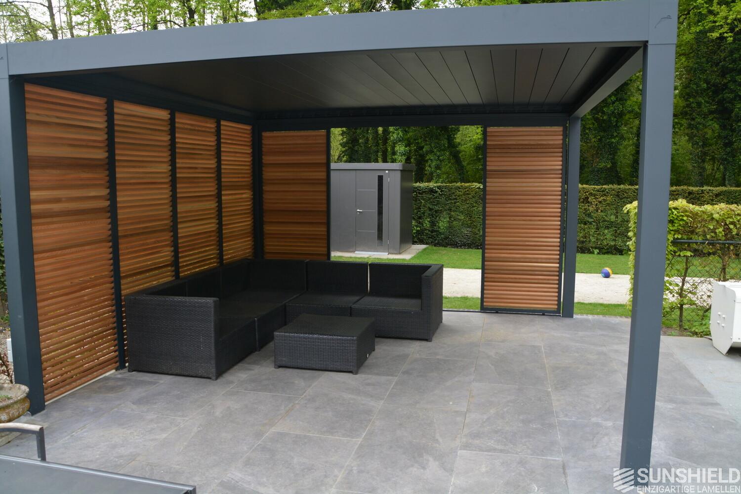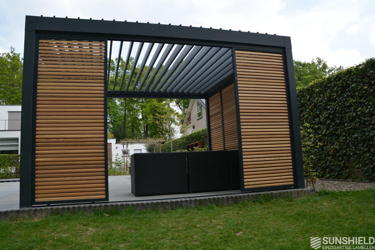 First, Sunshield created a louvered roof measuring 4 by 4 meters. Then, the rear wall was closed with four fixed panels, while two sliding panels are placed in the short wall on the outside.