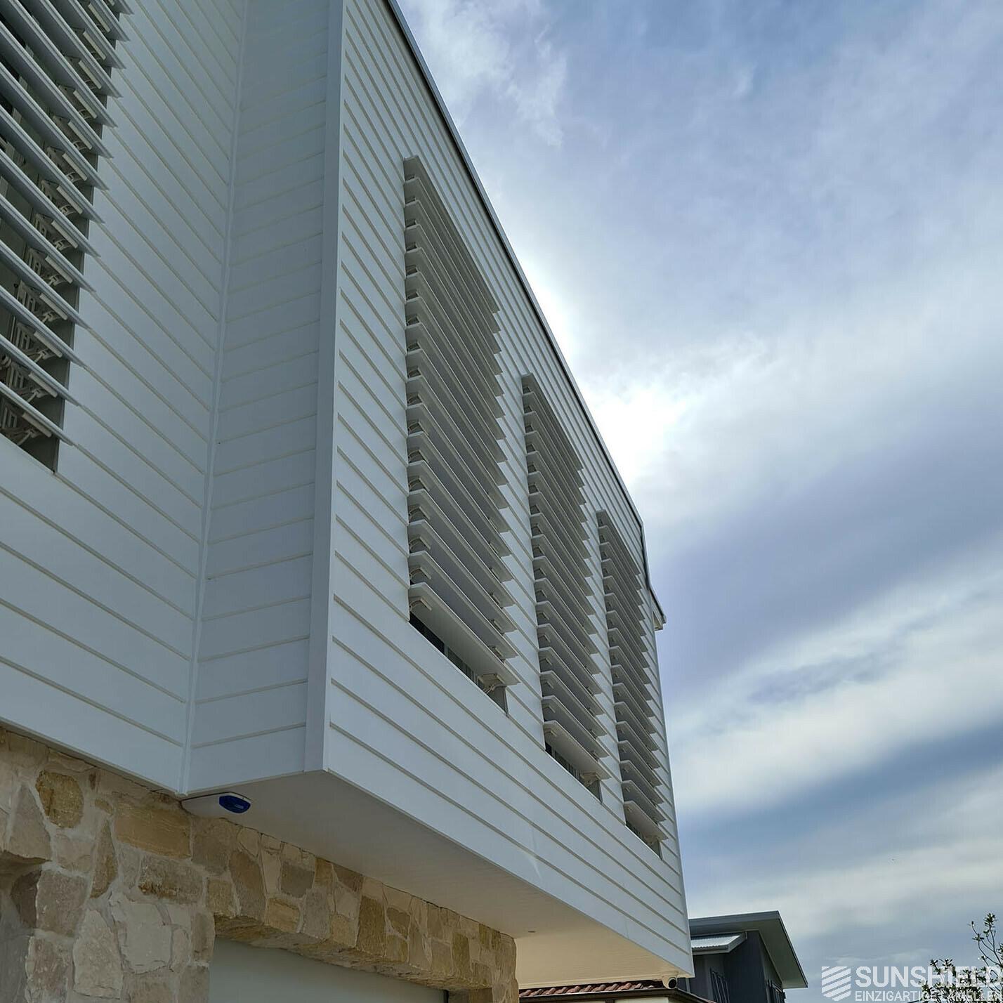 The developer of a new construction project in the south of Sydney is charmed by Sunshield's louver systems. In this case he preferred wooden slats. In fact, he preferred to have blades made of the same wood as the wooden cladding on the first floor.