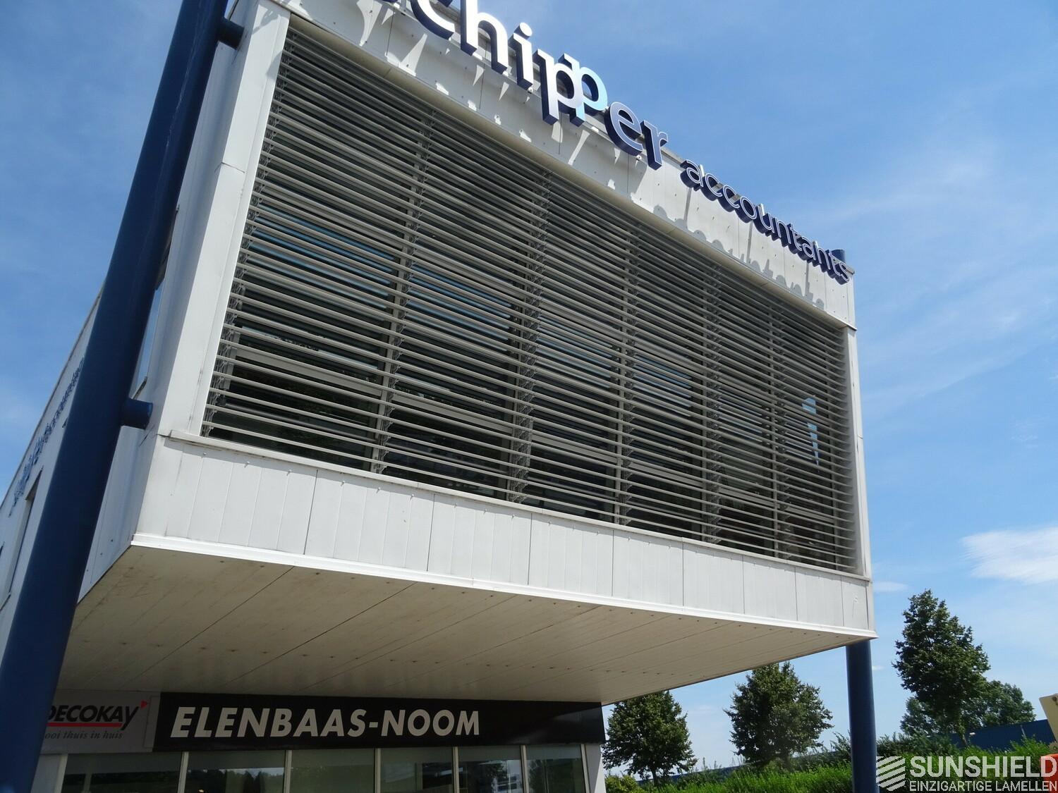 It is here, at the Schipper Accounts office, that a large window is fitted with unique louvers. By Sunshield.