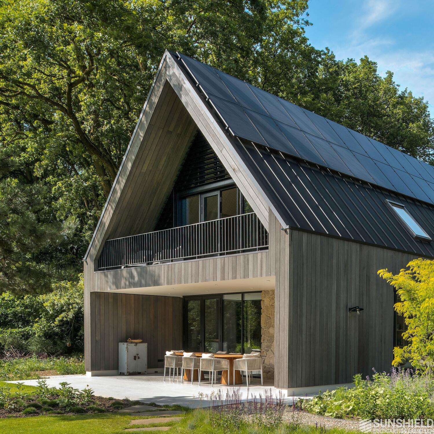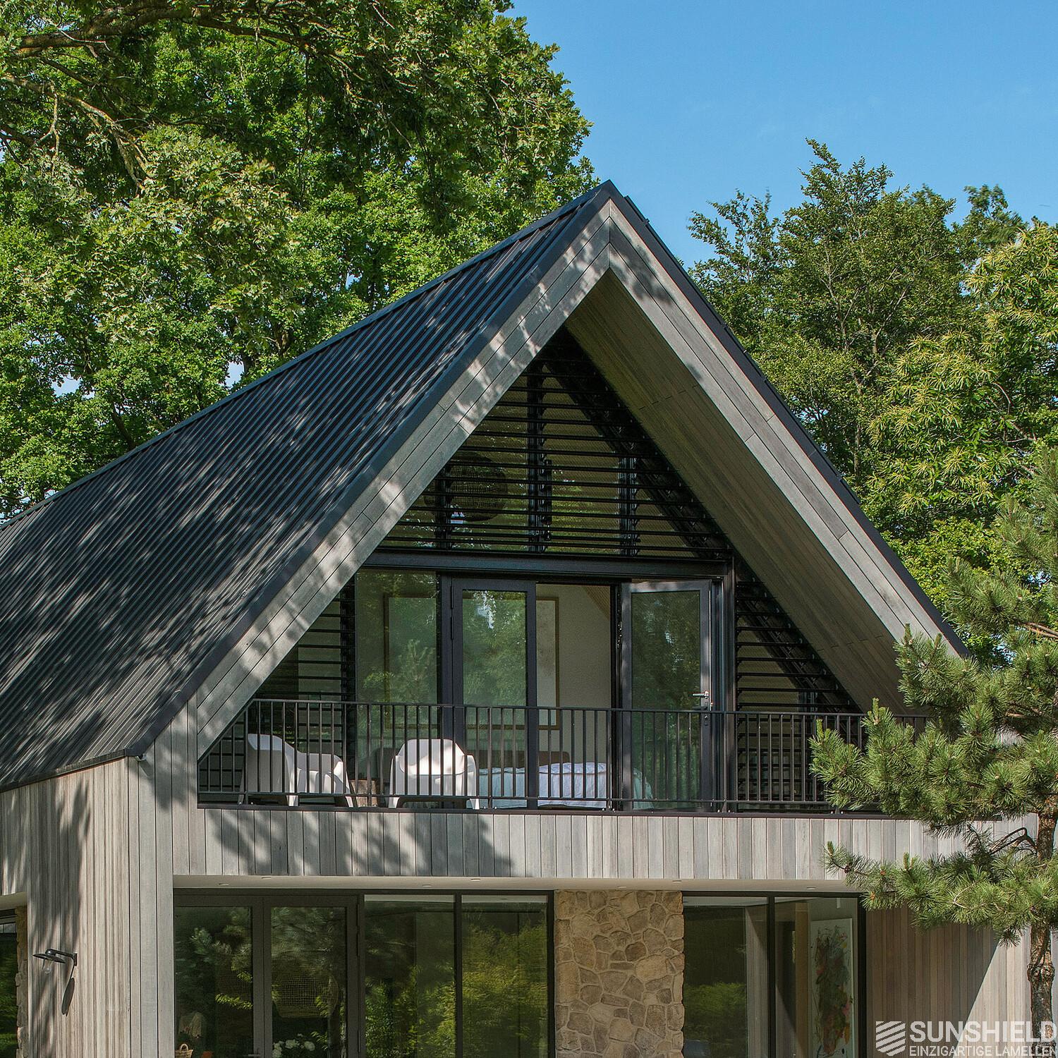 The master bedroom of the residence features unique louvers. Designed, manufactured, and installed by Sunshield, commissioned by contractor Olympa Timber Construction in Veghel (NL).