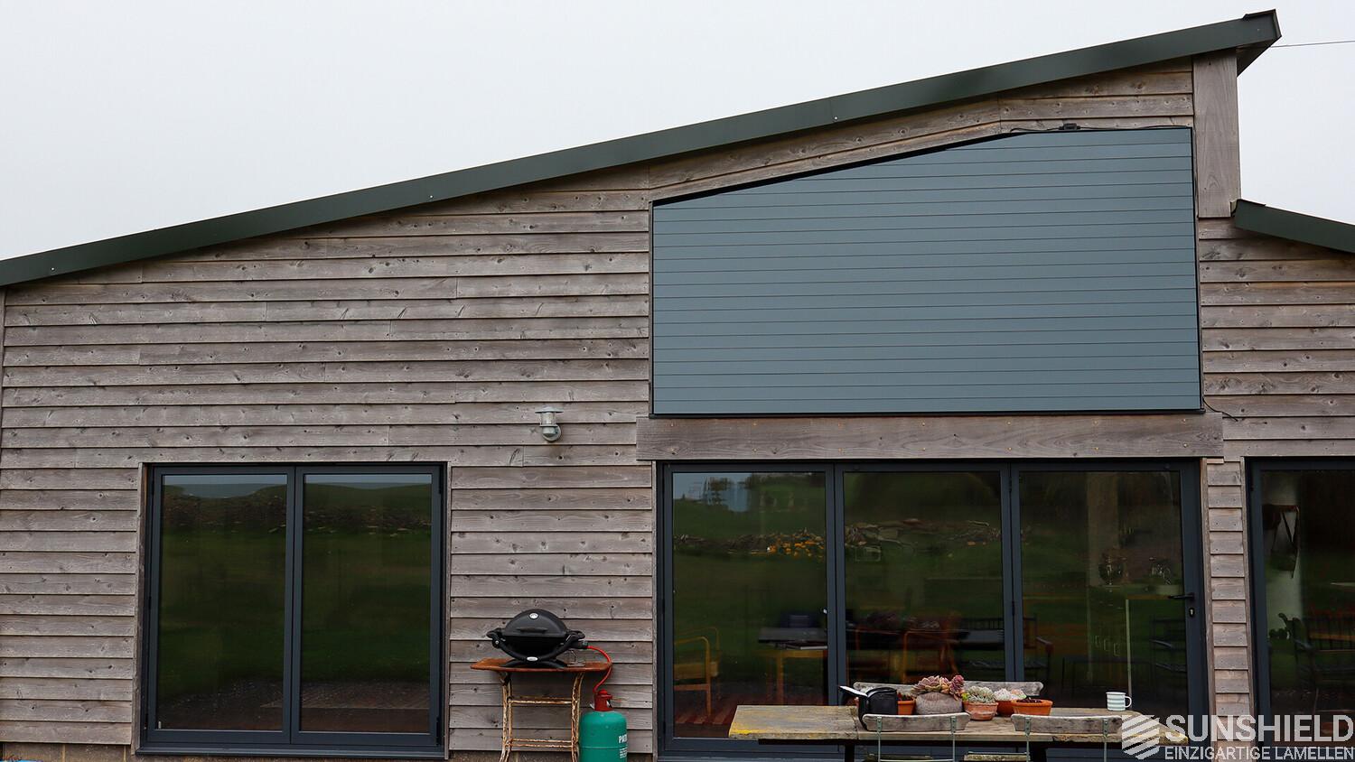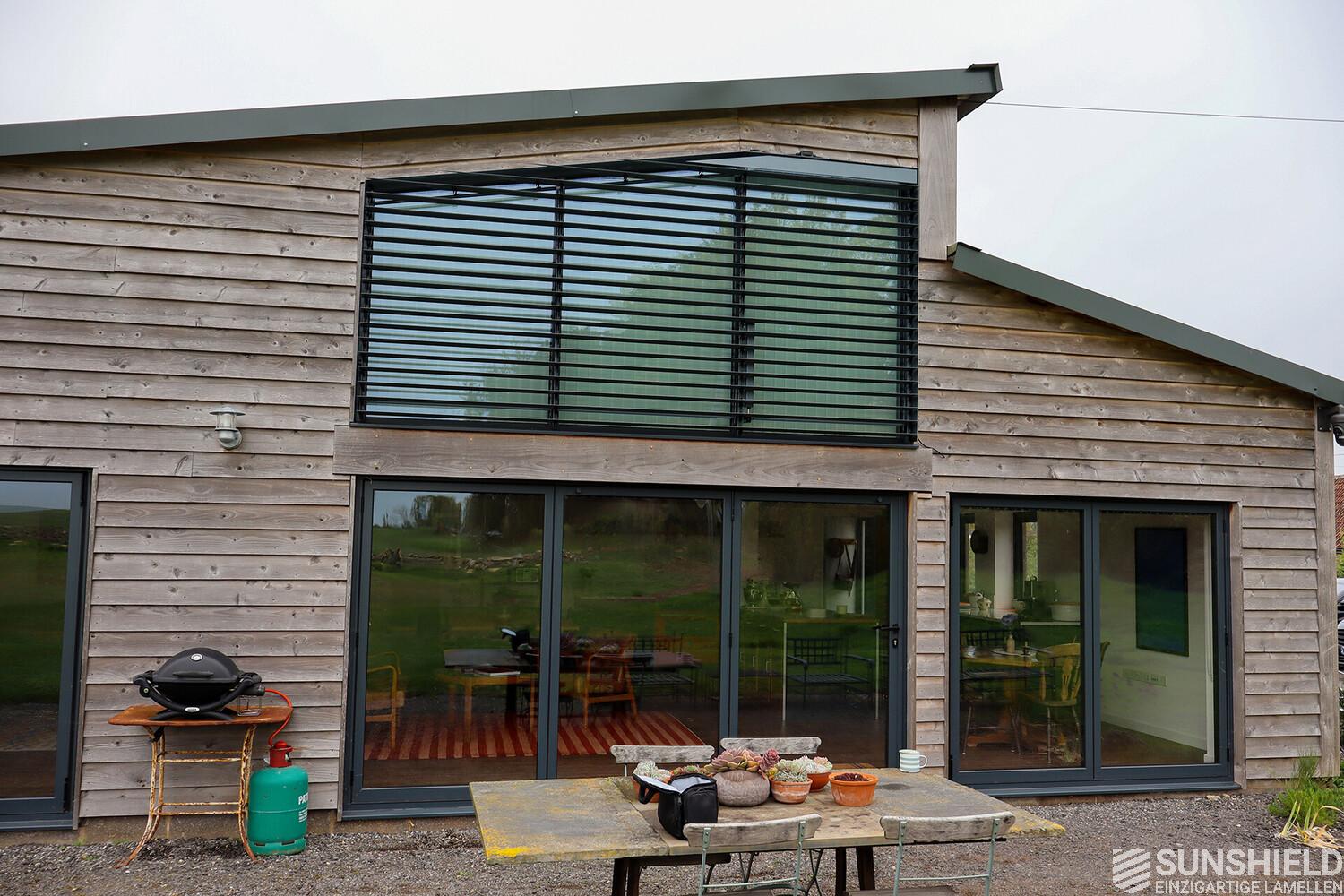 To achieve the right balance between comfort and design, the client approached SUNSHIELD UK for a bespoke sunshade. The objectives were to complement the rustic character of the barn house and, above all, an effective solution against solar gain.