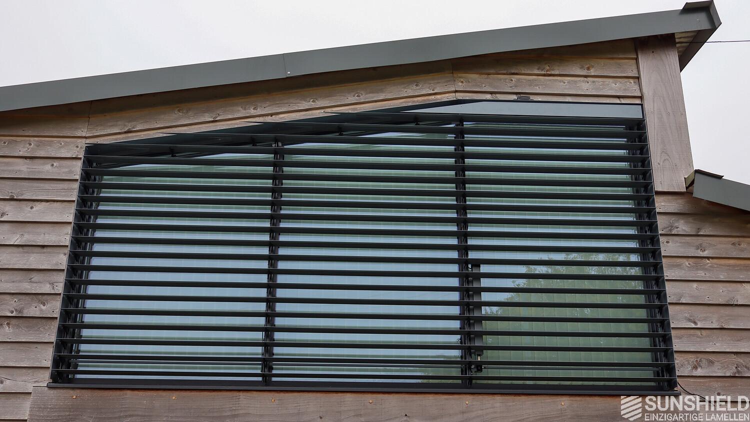 A slat system often blends in with the window recess. Because this window is not very deep, side profiles were added. These primarily prevent light from entering from the side. Furthermore, these profiles provide a sleek, clean finish to the louver system.