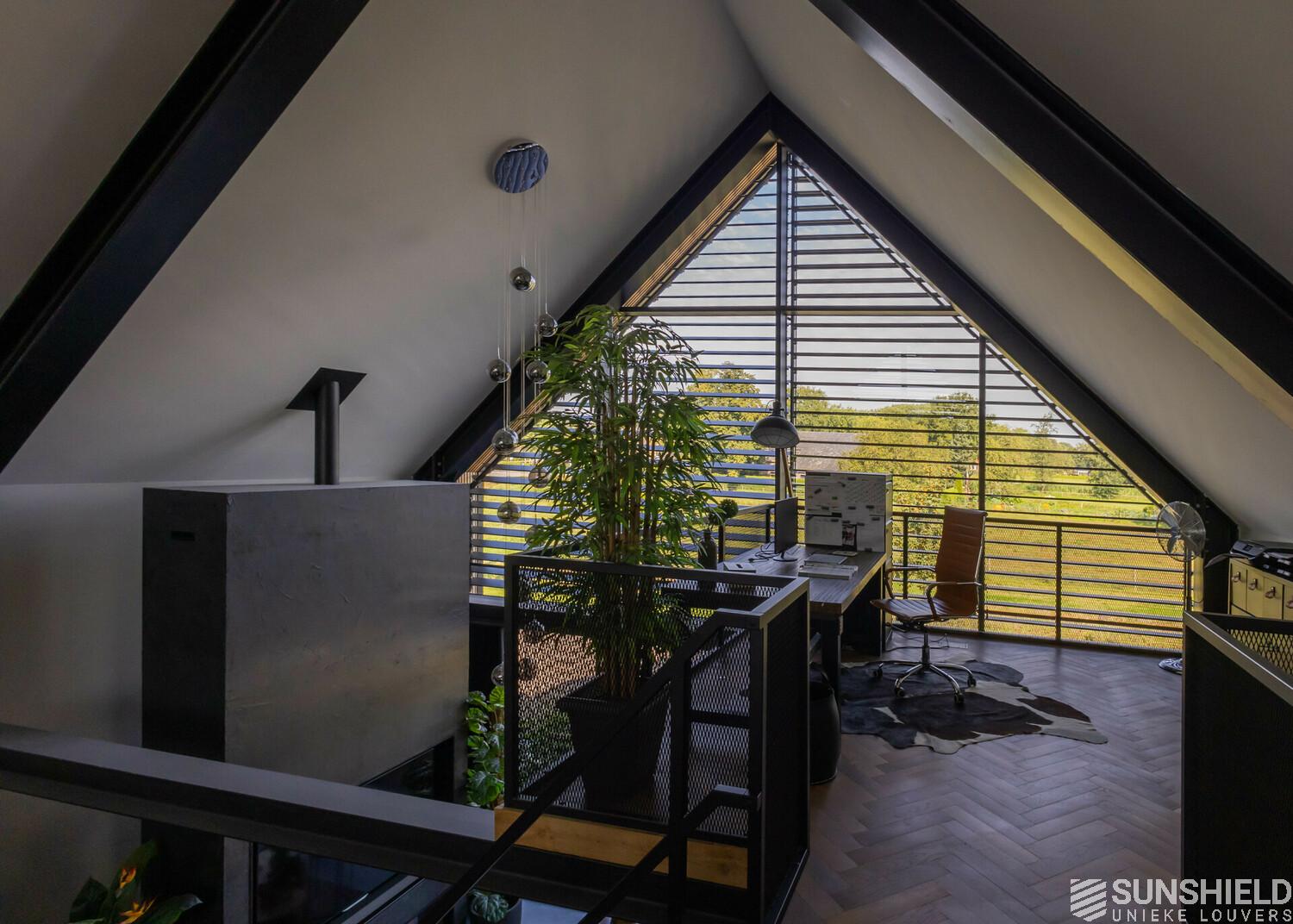 The windows start at the base as a rectangle. After 1.30 meters, the shape changes into a triangle that then continues to the ridge of the roof. The slats follow this design closely.