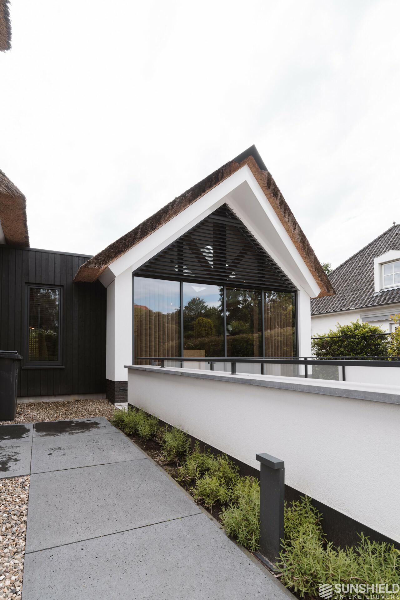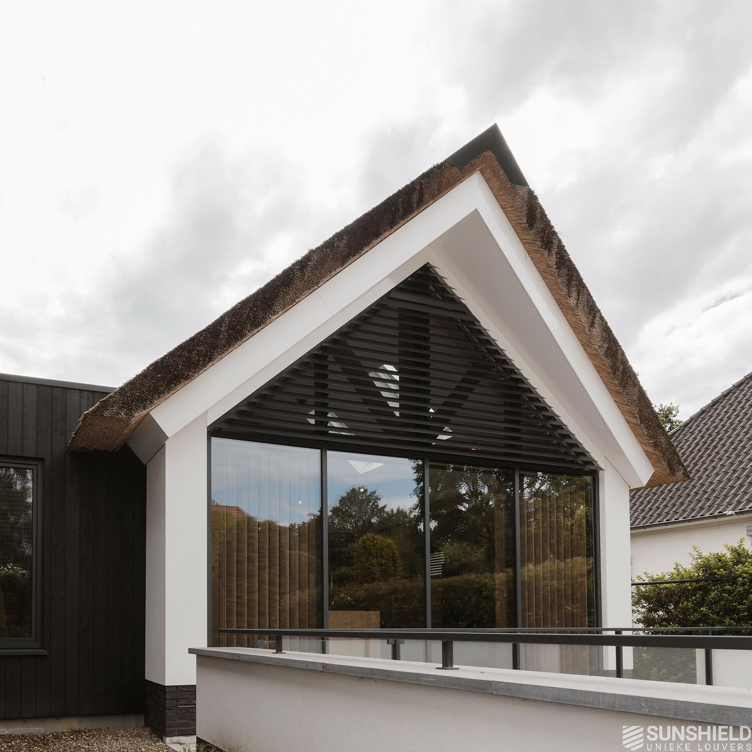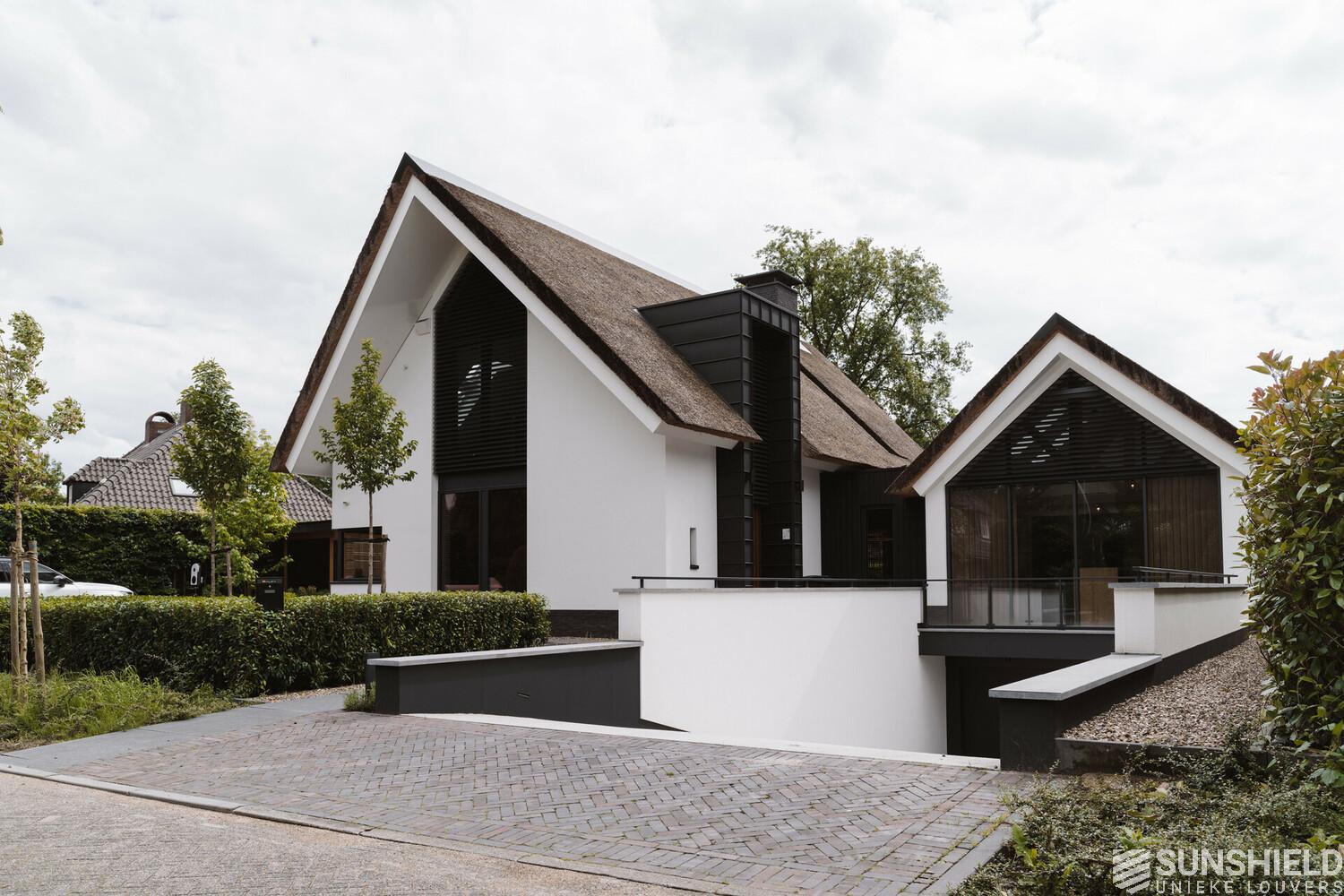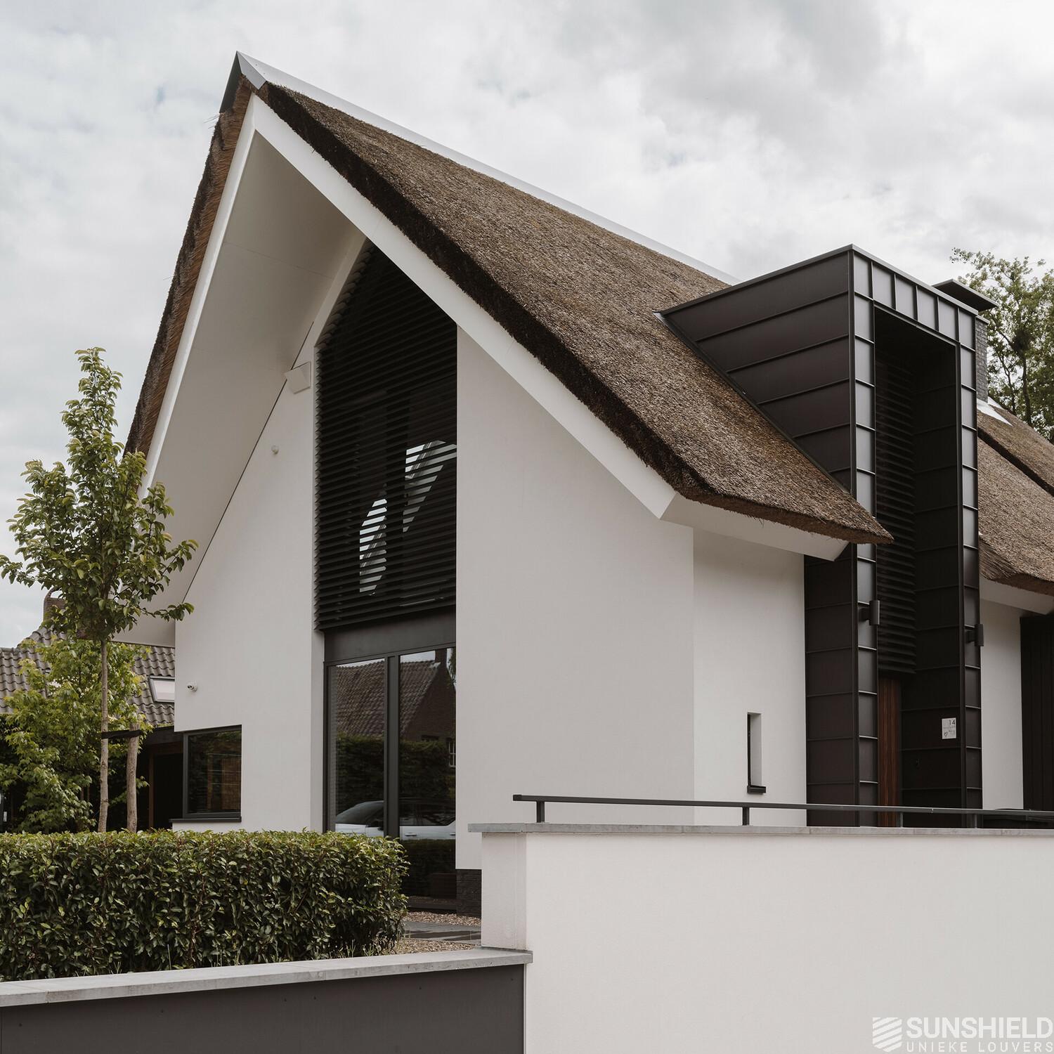 Here, three facades of a residential villa have been fitted with unique louvers. By Sunshield, in collaboration with construction company Stempel in Leende (NL).