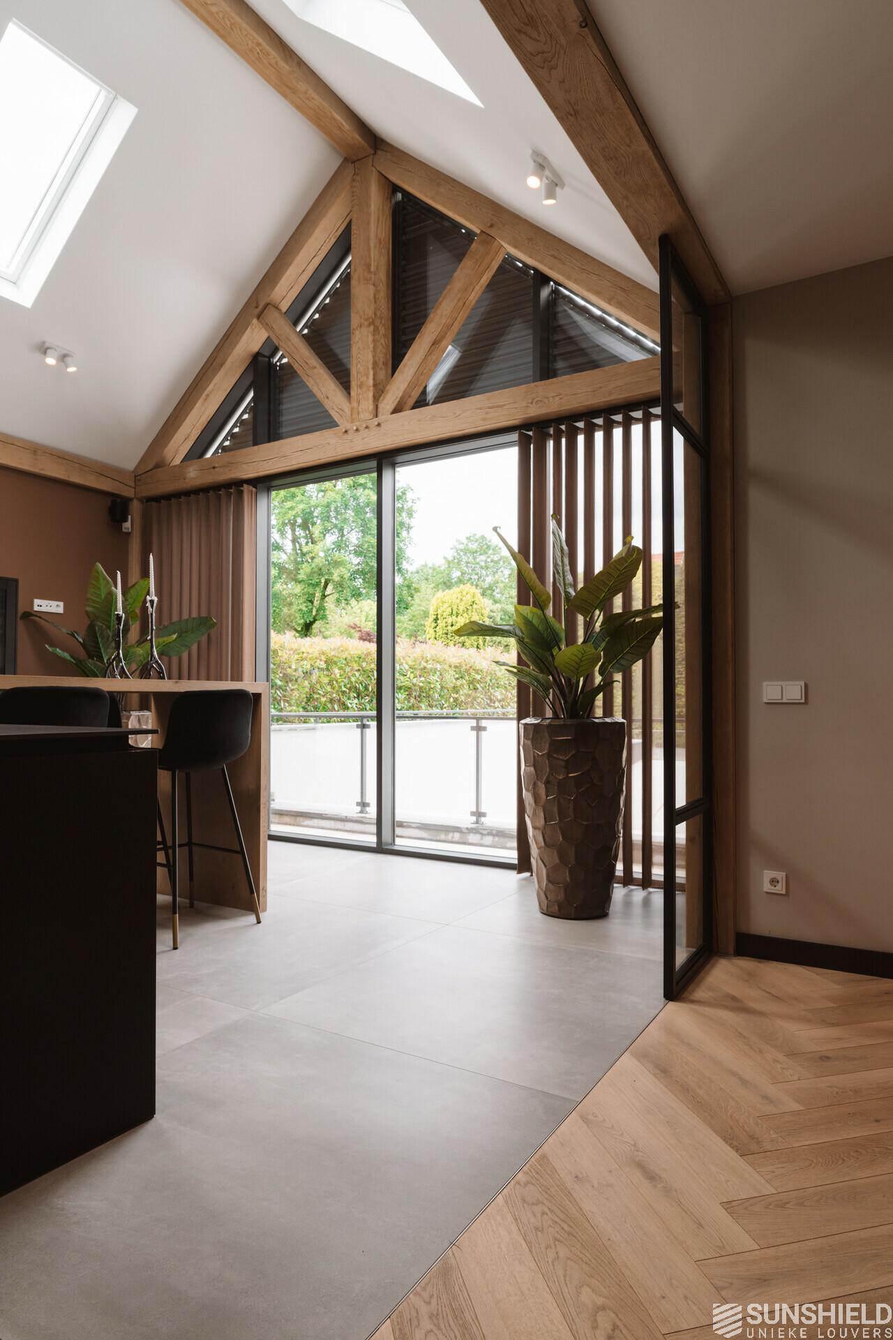 On the first floor of the main building, there is a bedroom situated at the front. The window of this bedroom has a louver system that starts at the base as a rectangle. After more than three meters, the sun protection transforms into a triangle that ends in the ridge of the roof.