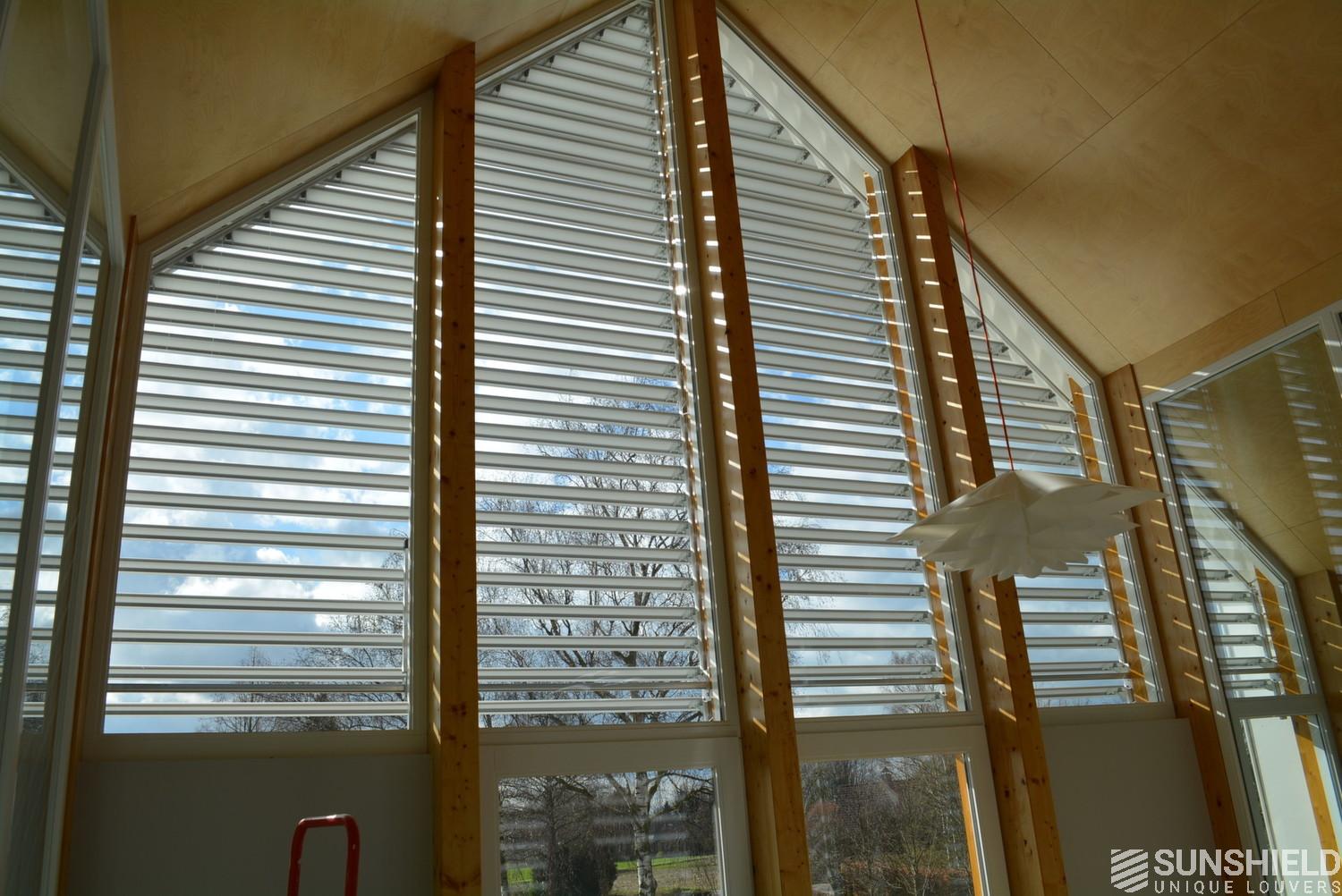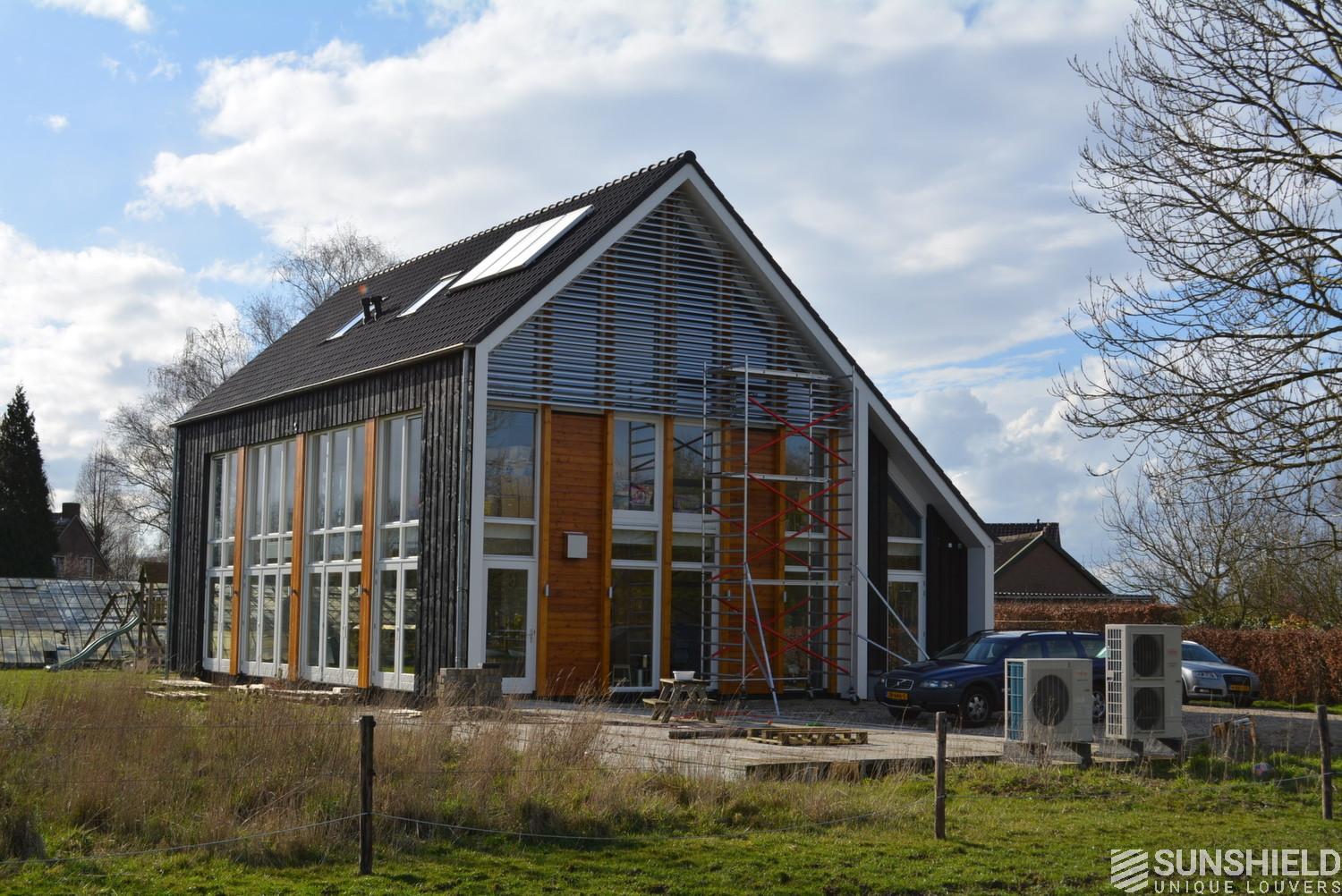 This modern country house has a fantastic light everywhere in the house. The only disadvantage was the heating. Even when it was freezing the air conditioning was needed when the sun was shining. With Sunshield louvers this is solved. When fully closed the Sunshield louvers bring enough darkening for the 3 bed rooms, so no interiors blinds needed, what brings of course a signficant cost saving.