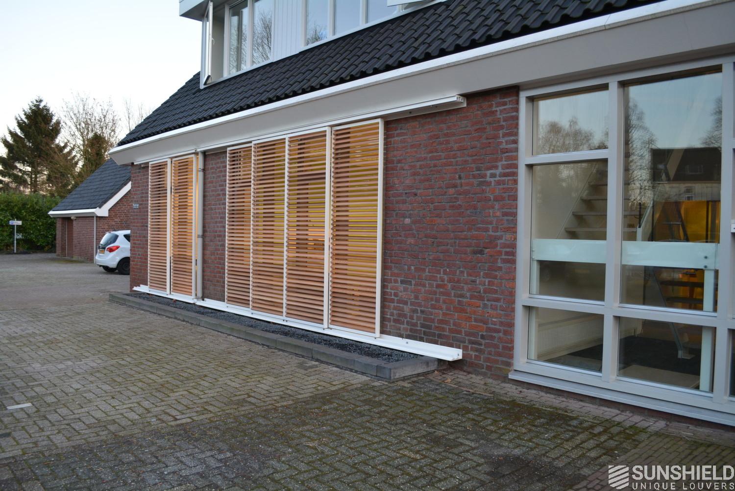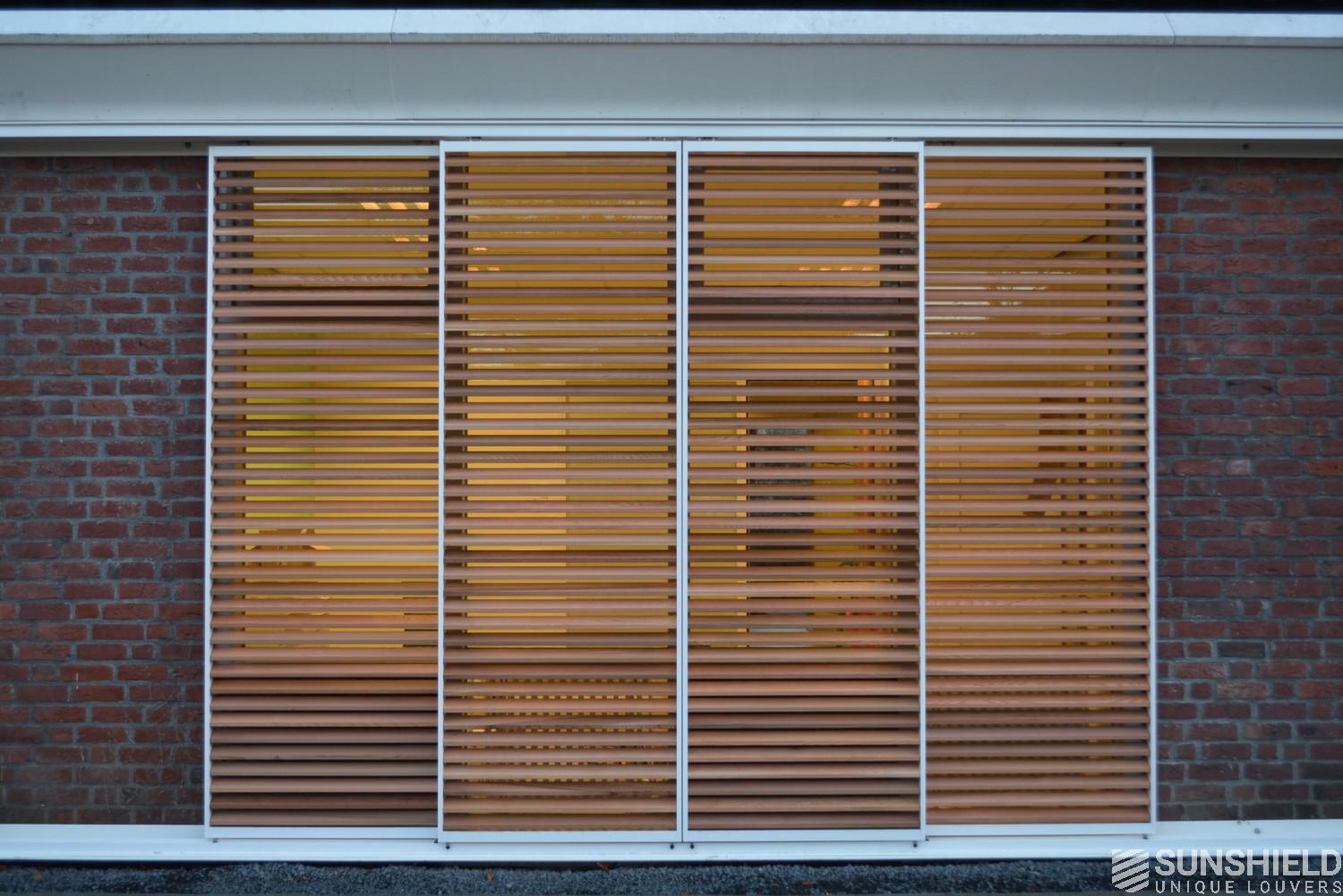 Met de houten 68W louver zijn hier glijdende zonneschermen geïnstalleerd. Een glijdend scherm bevindt zich voor een deur (of een raam) en staat in een geleider. Een dergelijk scherm fungeert als een zonnescherm met vaste louvers. Het voordeel is dat het scherm zijwaarts kan schuiven. De deuren zijn dan vrij toegankelijk.