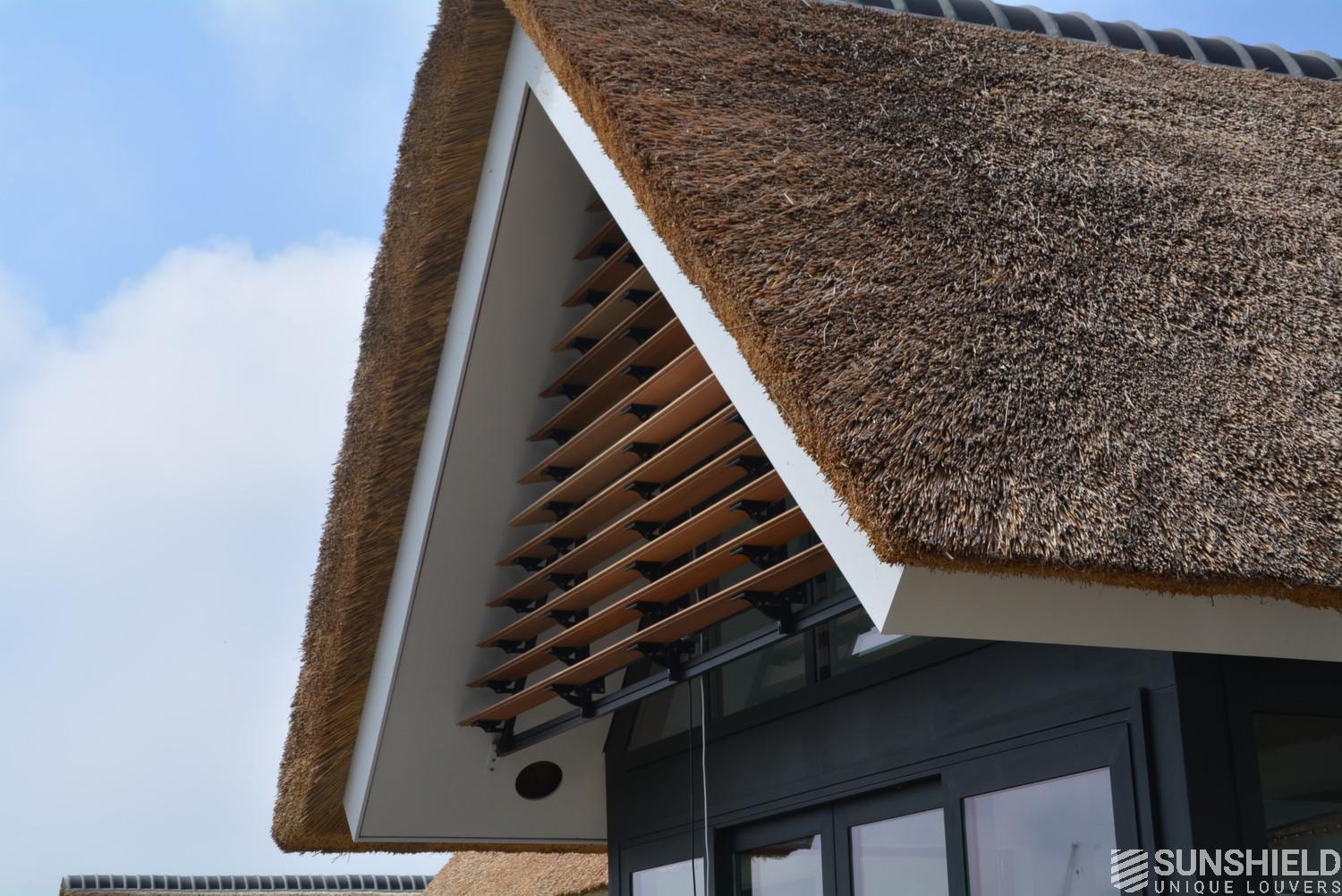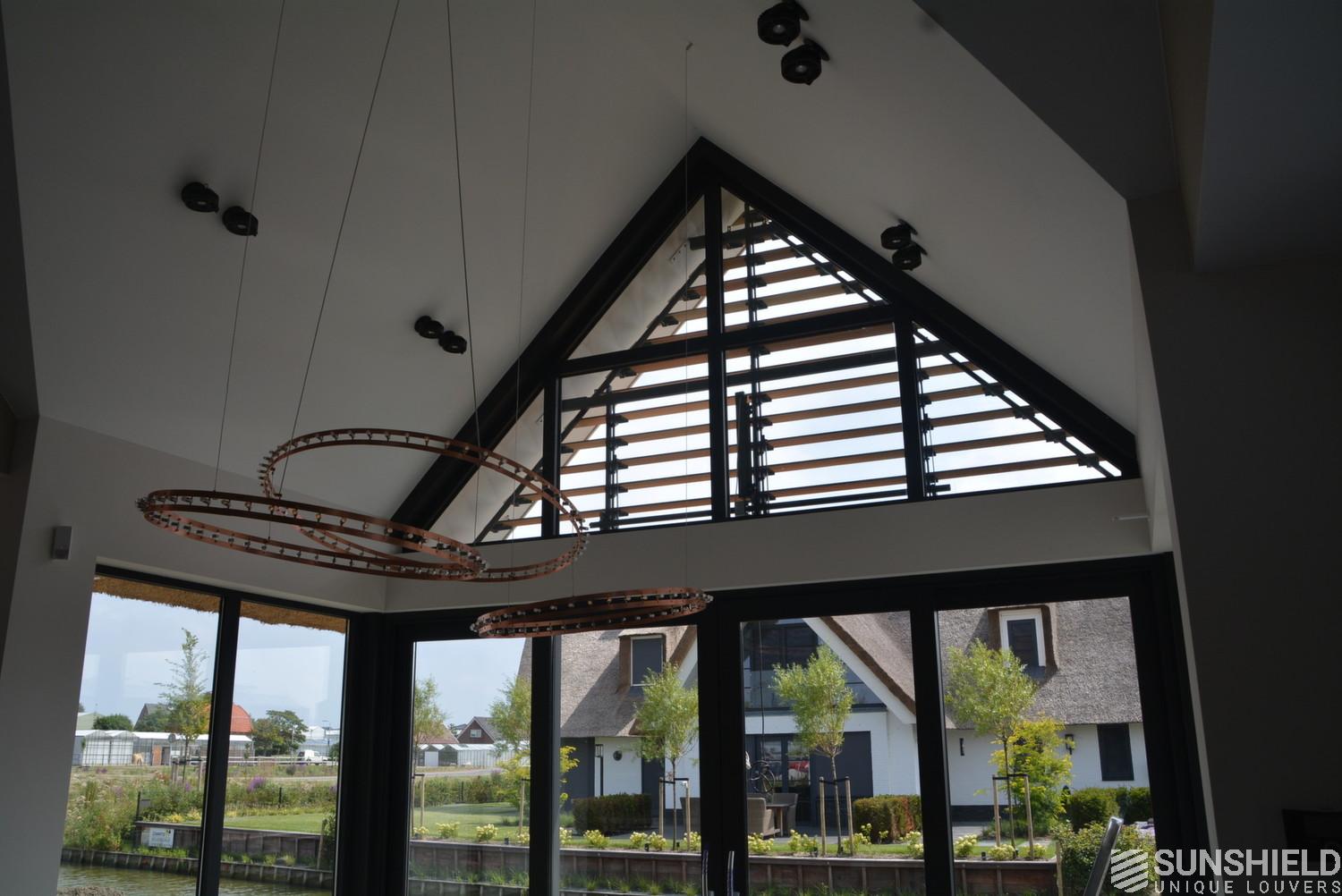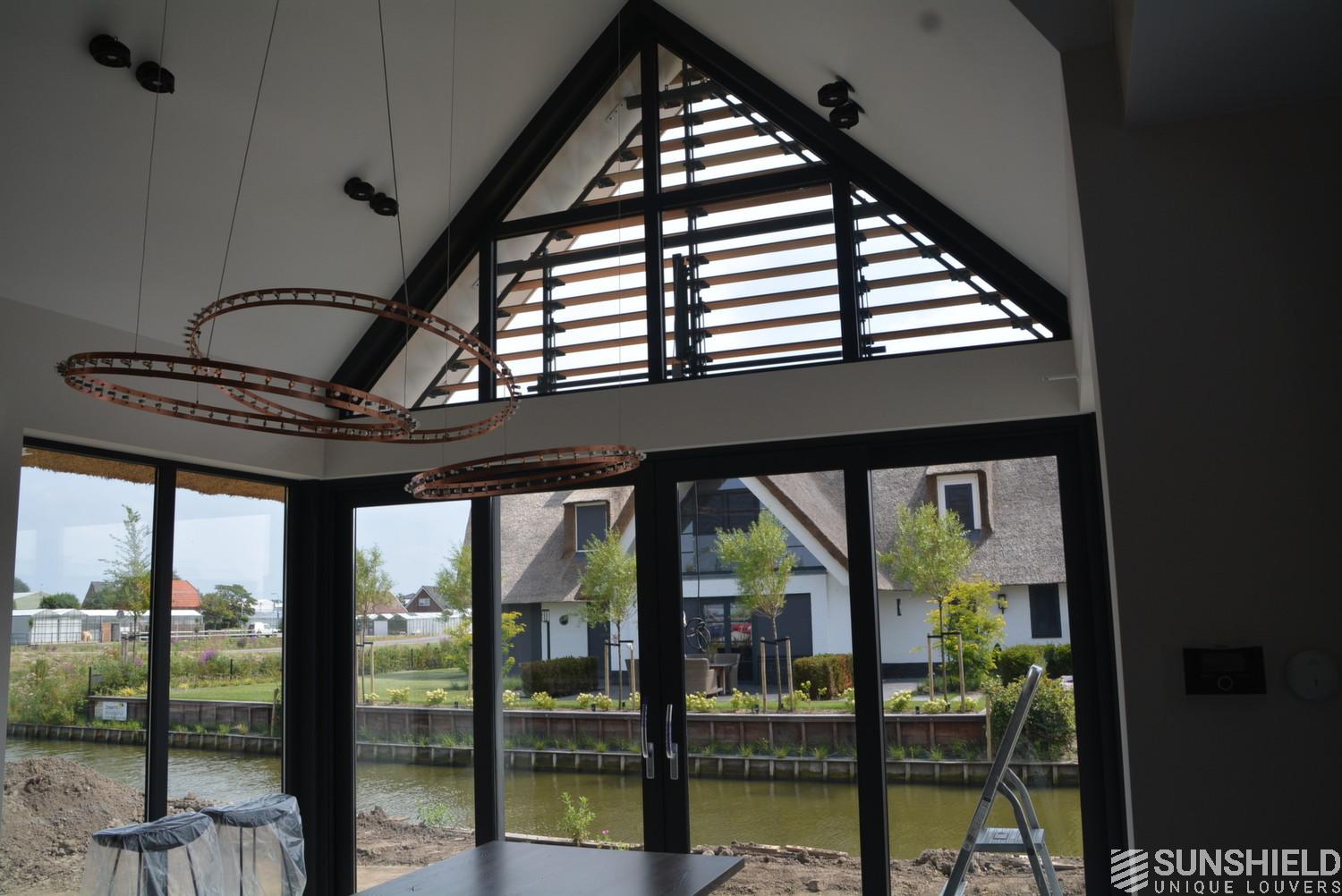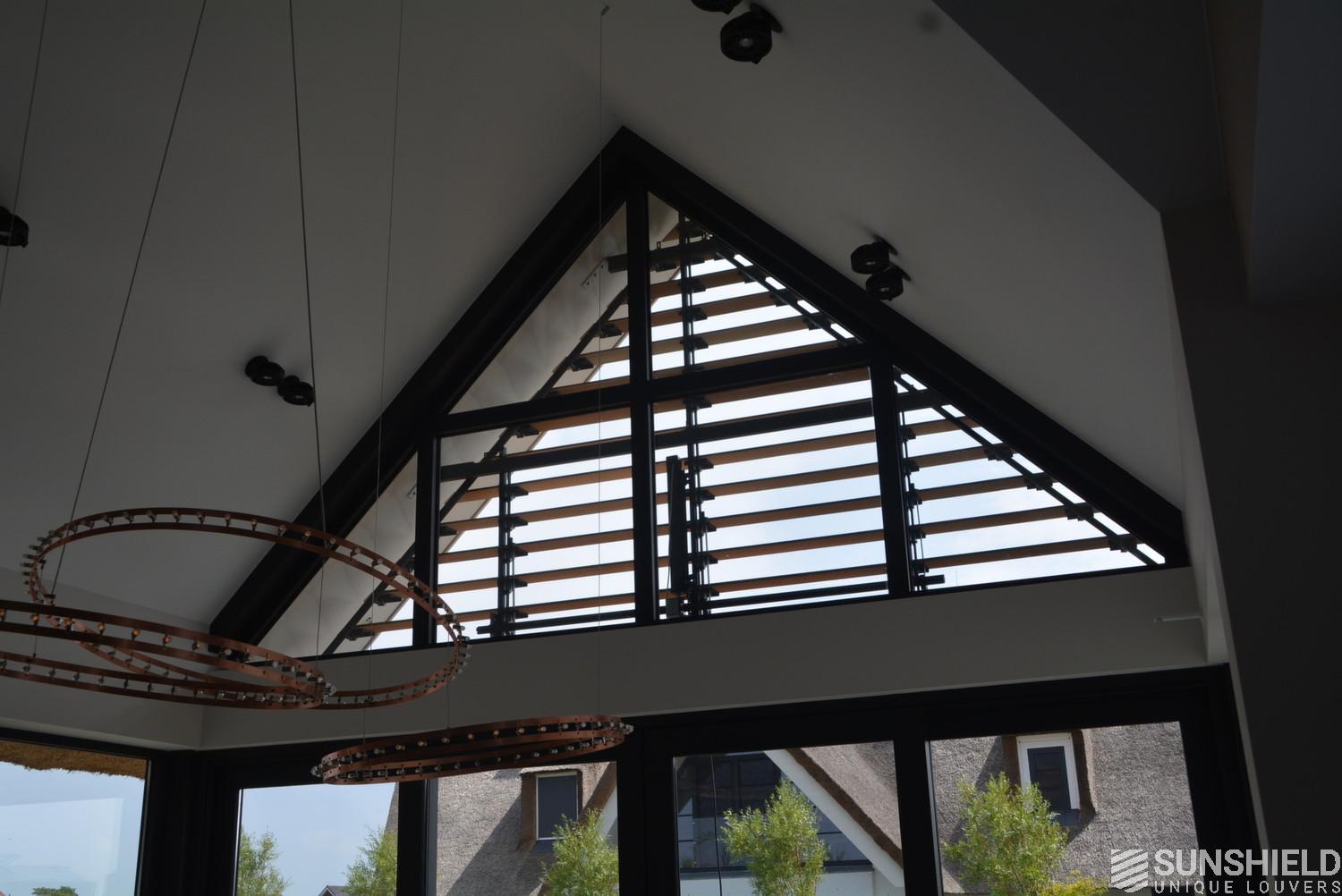 The triangular louver system has an area of a little over 3 m2. The louvers are opened and closed using a remote control. Or placed in any desired position in between, that is stepless.