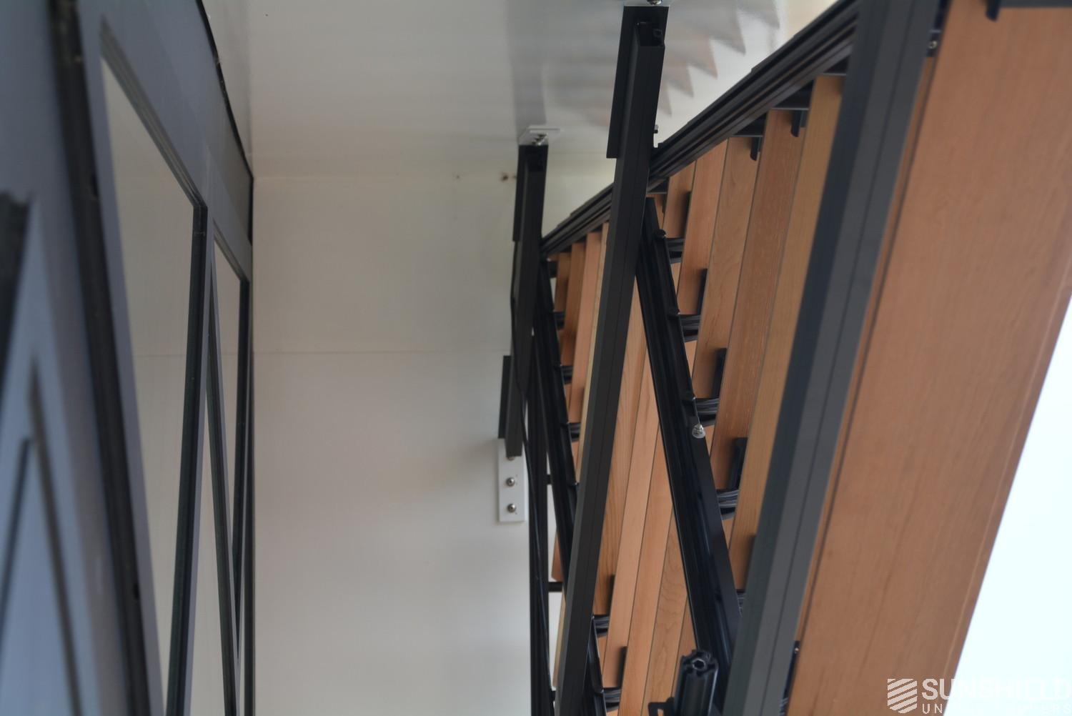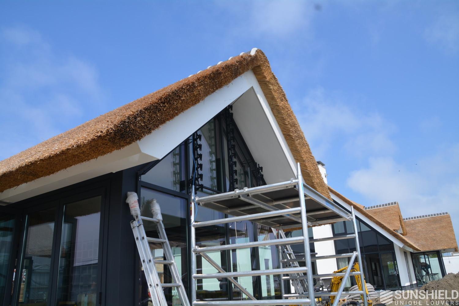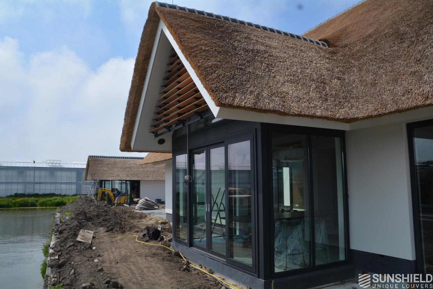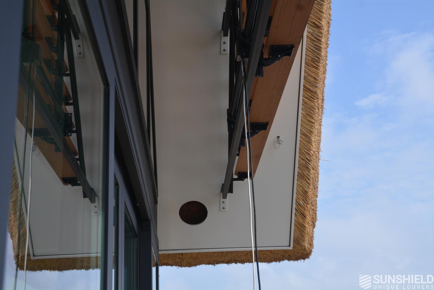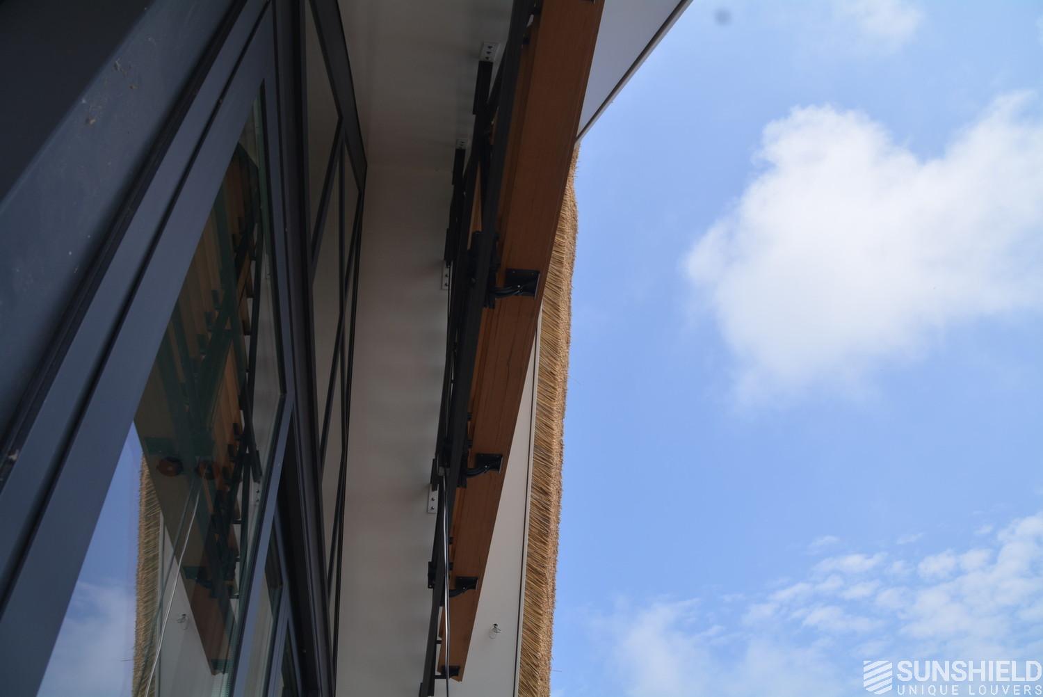 The triangular louver system has an area of a little over 3 m2. The louvers are opened and closed using a remote control. Or placed in any desired position in between, that is stepless.