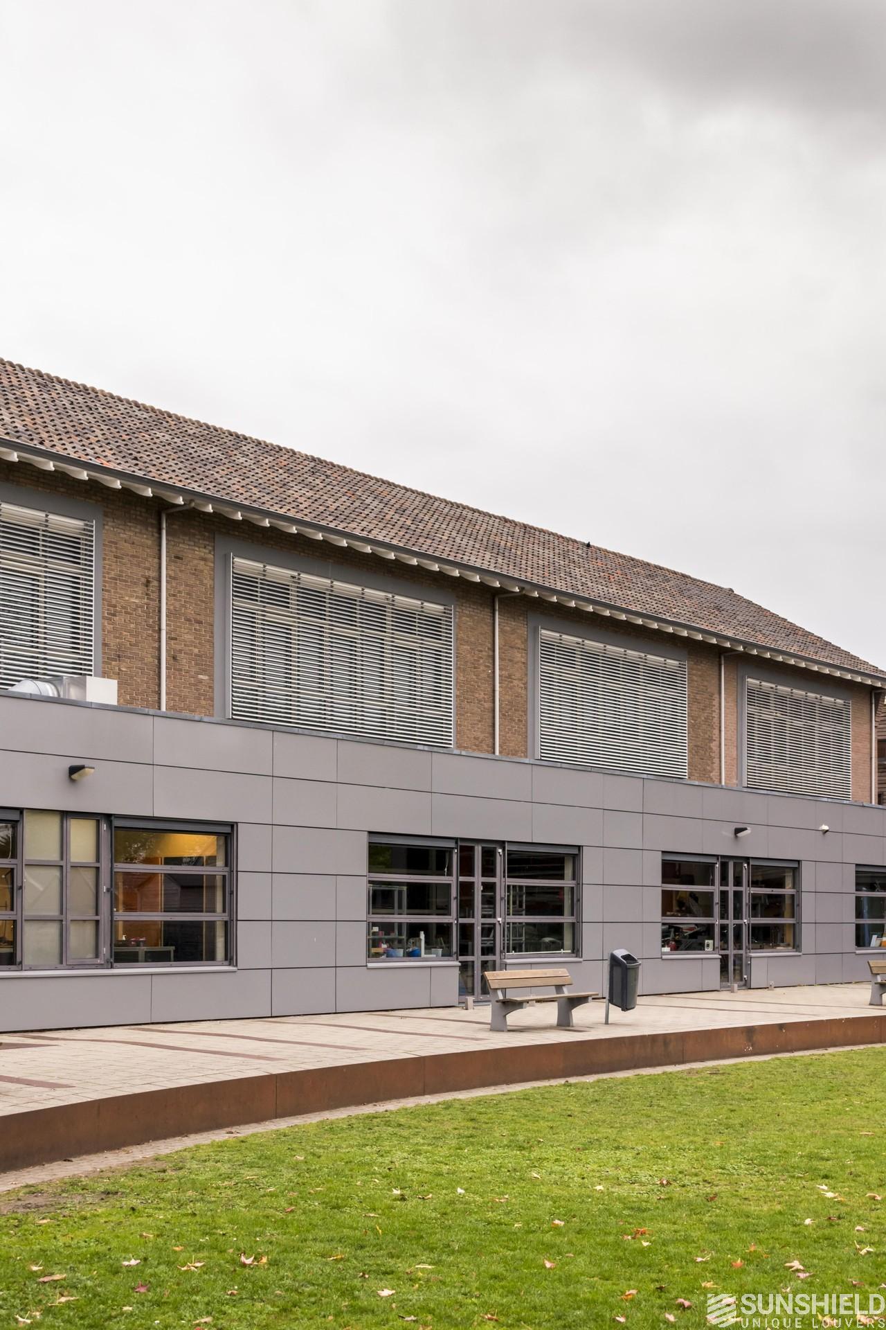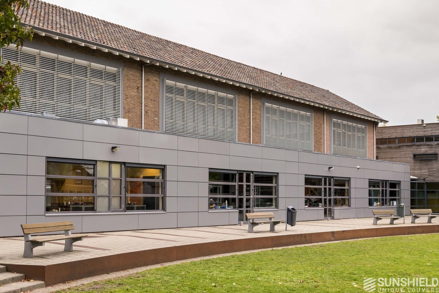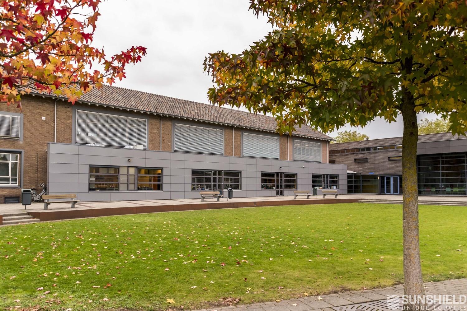 The front facade of the school building of CSO De Boog in Apeldoorn (NL) faces south. Teachers and students in the classes on the first floor were often bothered by the sun. In the form of light, warmth and glare.