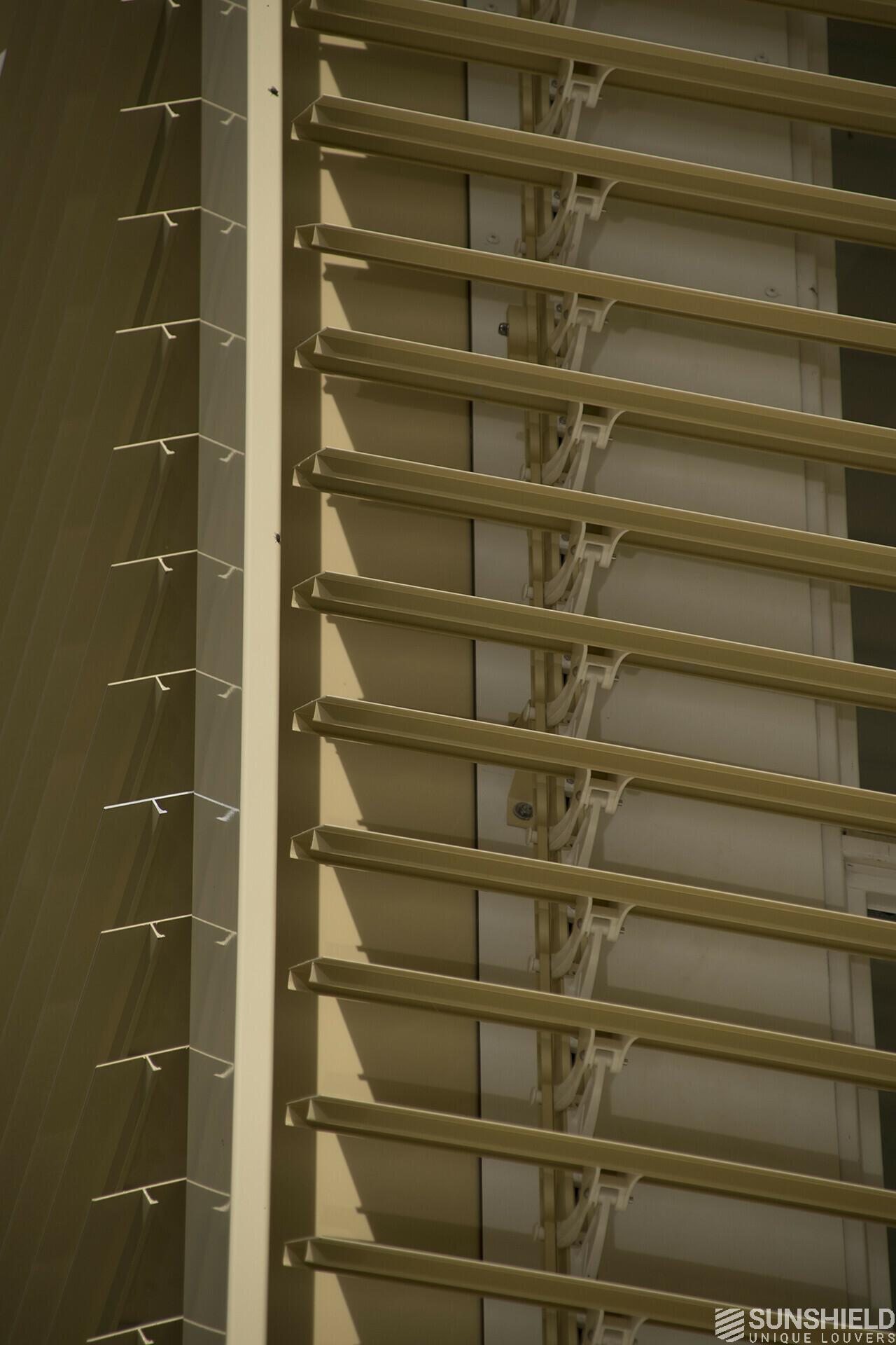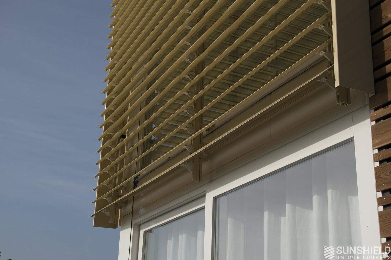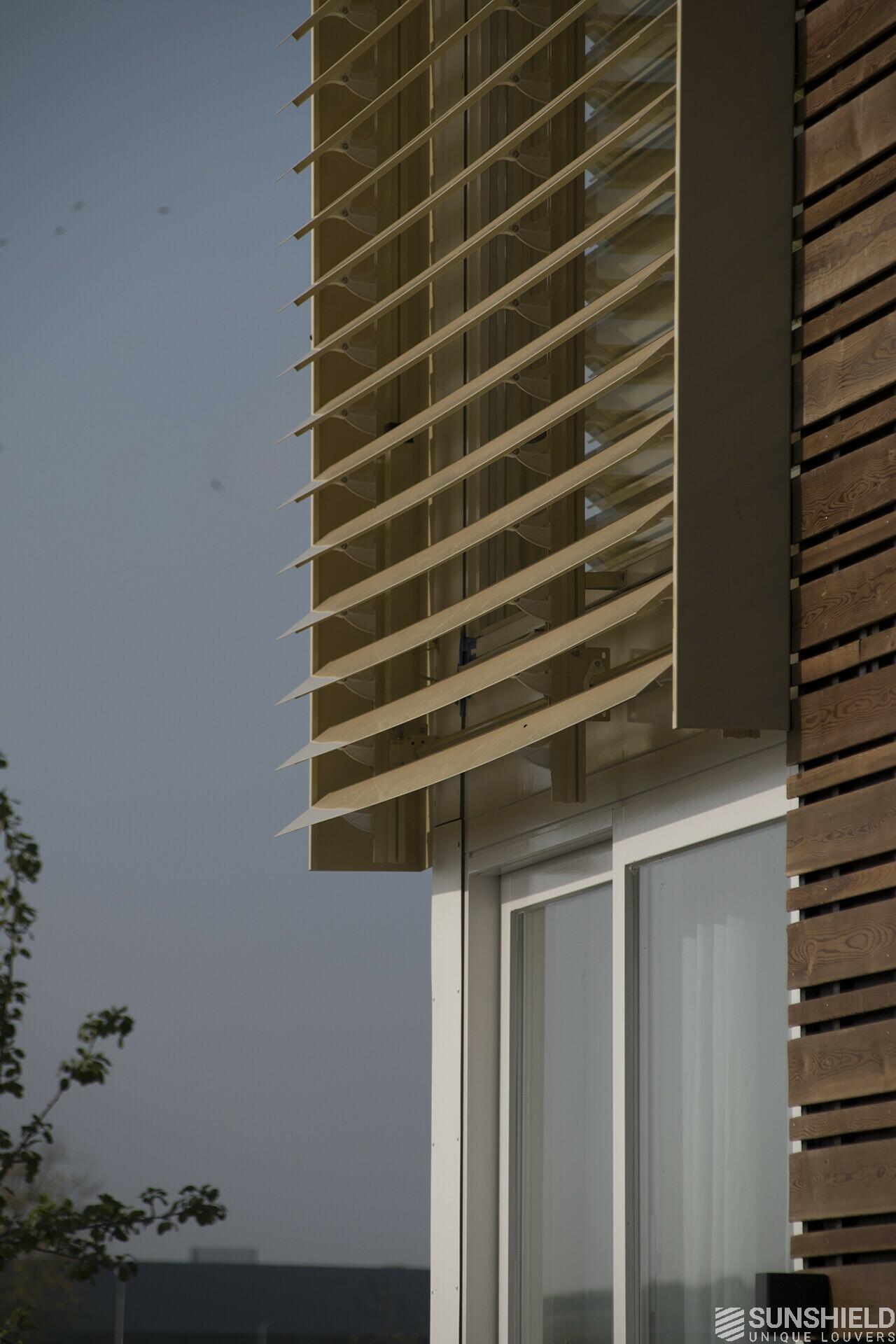 Both louver systems have a high and a low side. The high side of the system in the west borders the high side of the system in the south. The residents can both operate independently of each other.