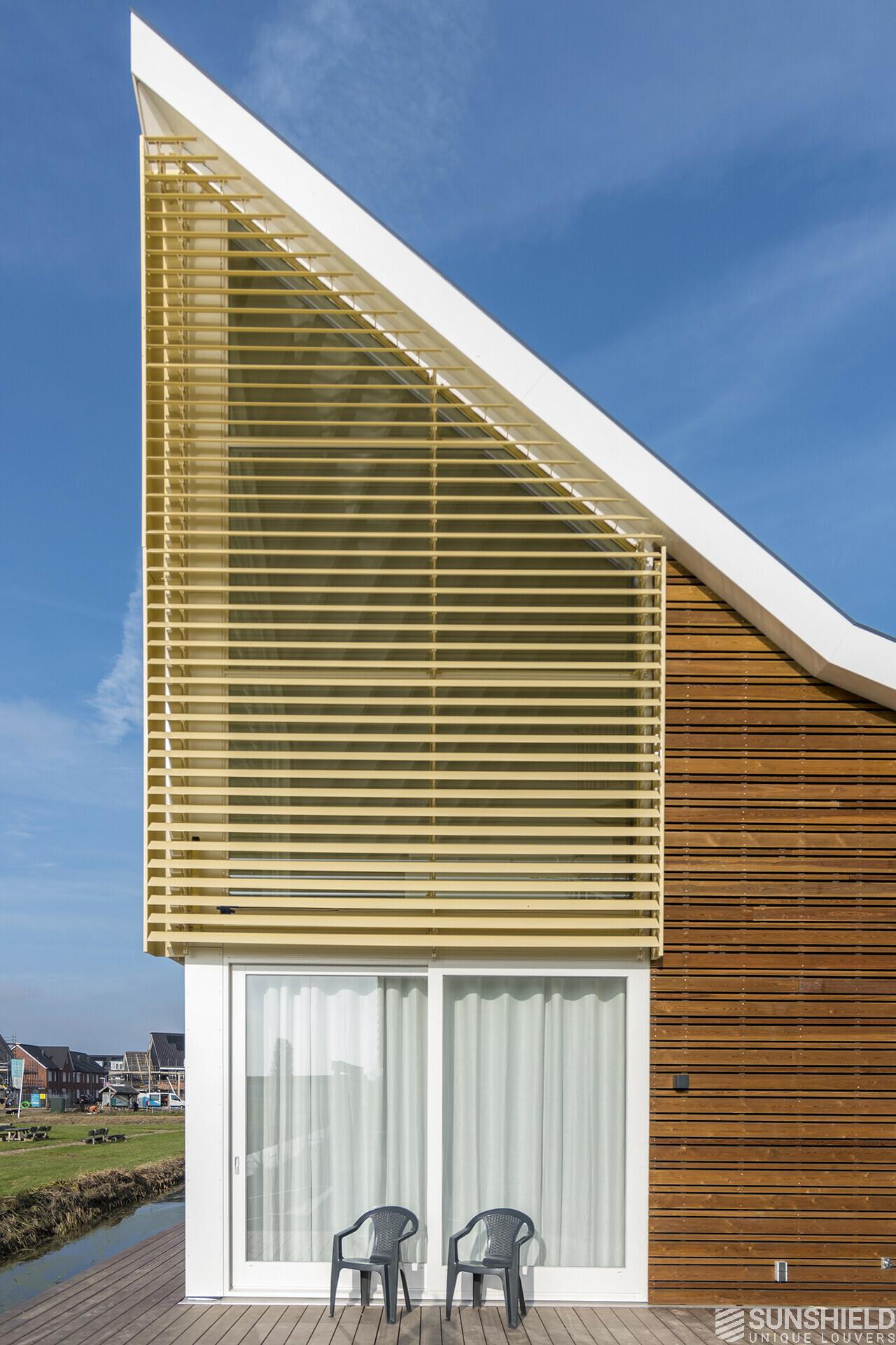 Hagestein, in the province of Utrecht (NL), owes its name to the Hagestein castle. Here, in the vicinity of the meandering Lek, Sunshield was commissioned by Douzebouw to provide a striking house with two trapezoidal sun blinds.
