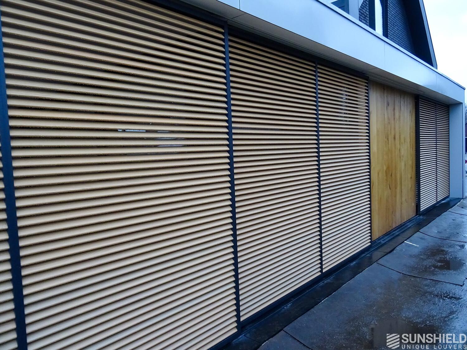 All slats are made of wood print of the type Oak. The other aluminium parts, like the frames of the sliding panels and the rack arms of the louvers, are coated in RAL 7021. This provides a really nice contrast.