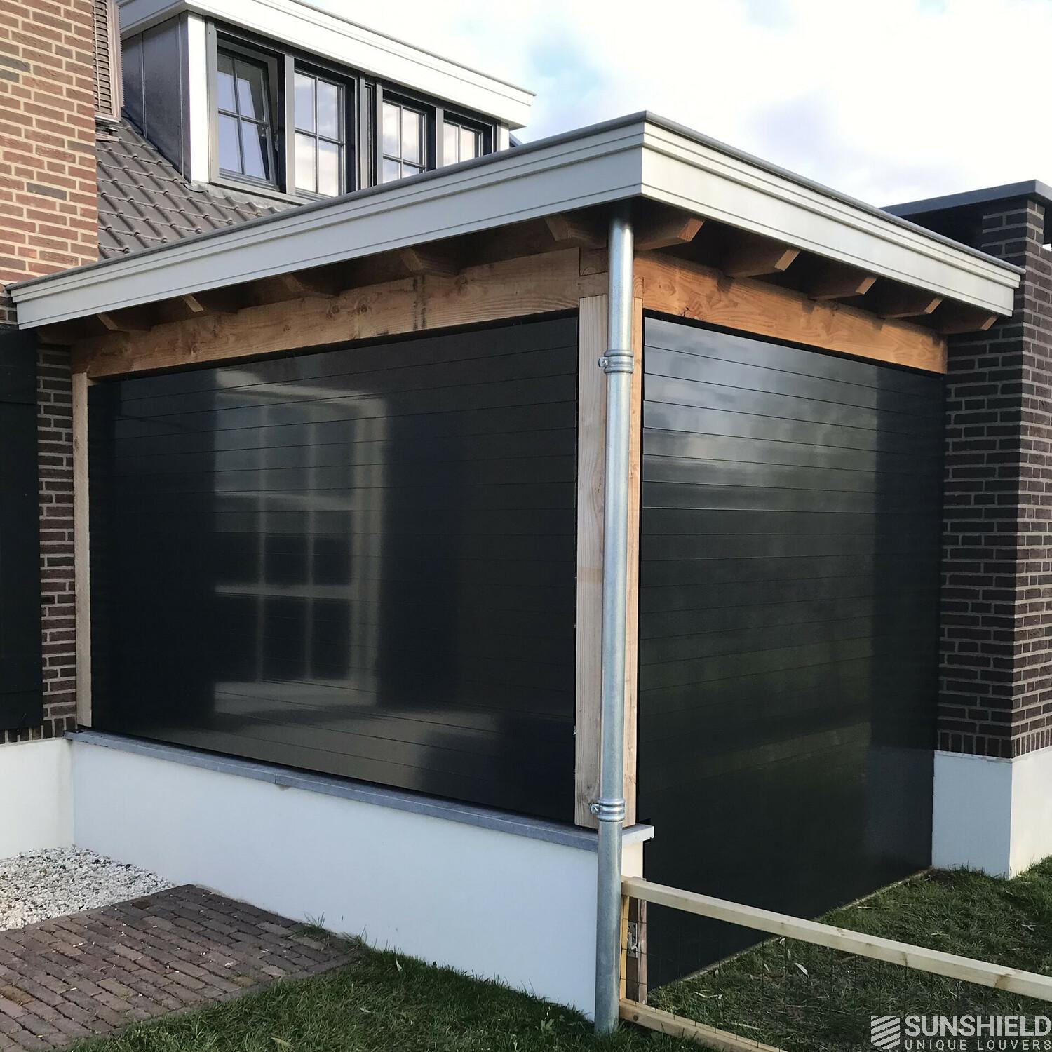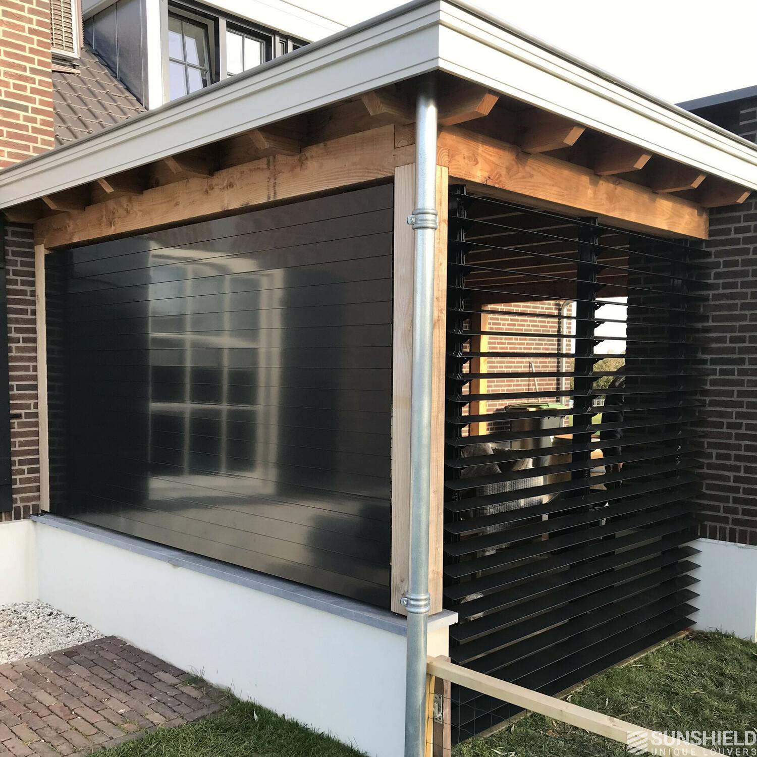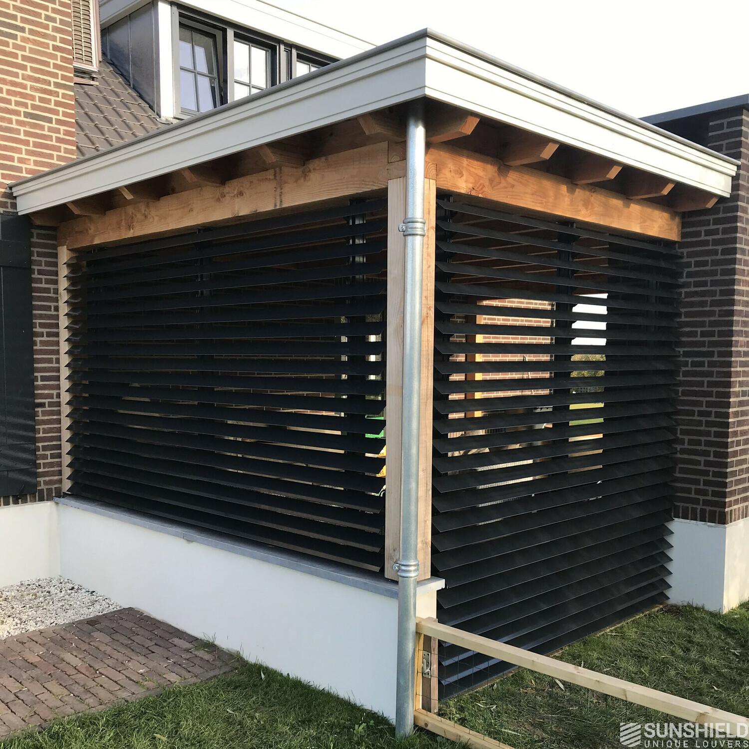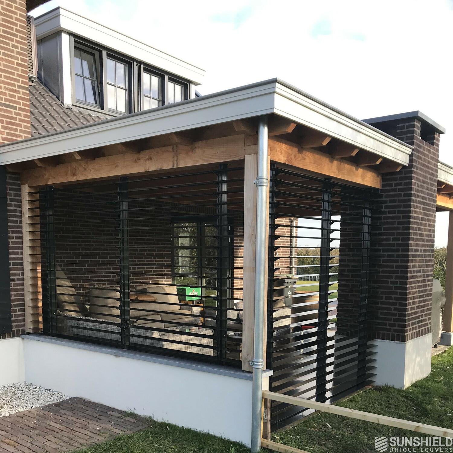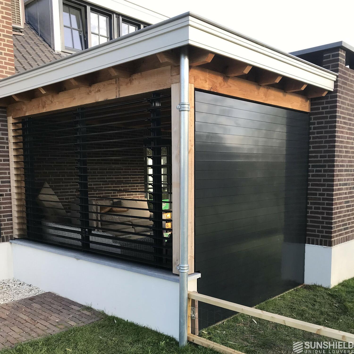 Here is the terrace of a characteristic, detached house fitted with two slatted walls. By Sunshield. With these louver systems, each nearly 6 m2, an outdoor space is transformed into a garden room.