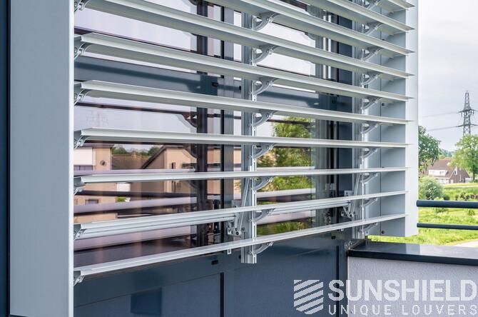 The aluminum parts, including the slats, are coated in RAL 7035, light gray. The louver systems are finished with angled corner pieces, also in RAL 7035. Even the plastic components are finished in light grey.