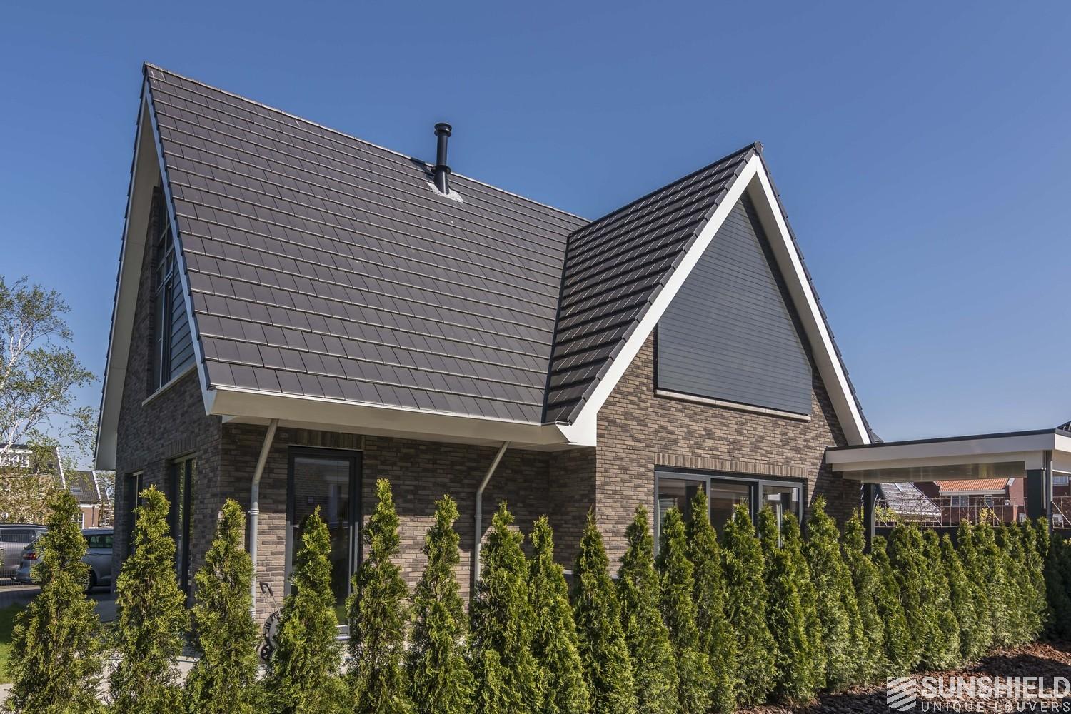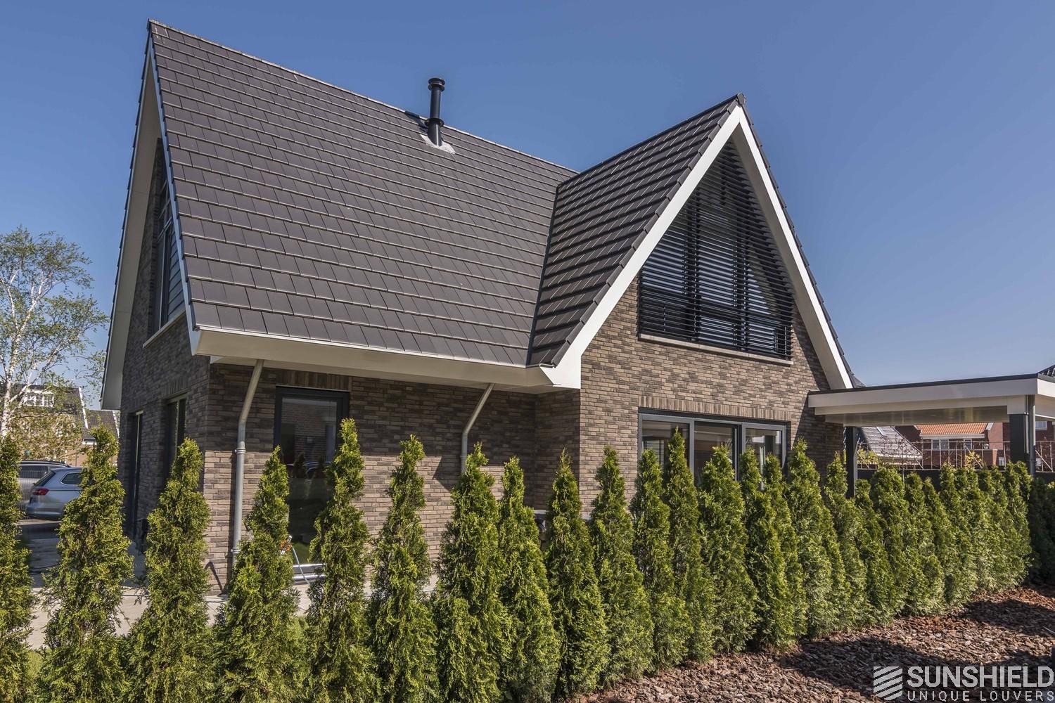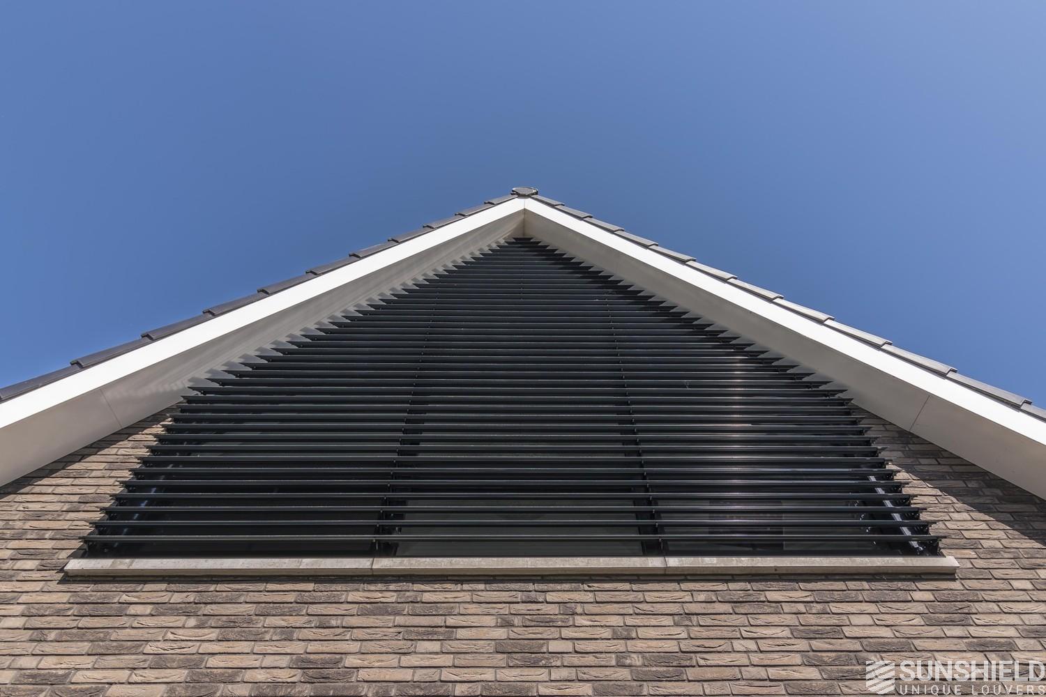 Sunshield installed a custom-made blind in front of a bedroom window. The lower part of the louver system is rectangular. Towards the ridge, the shape changes into a triangle – shapes are always distinctive.