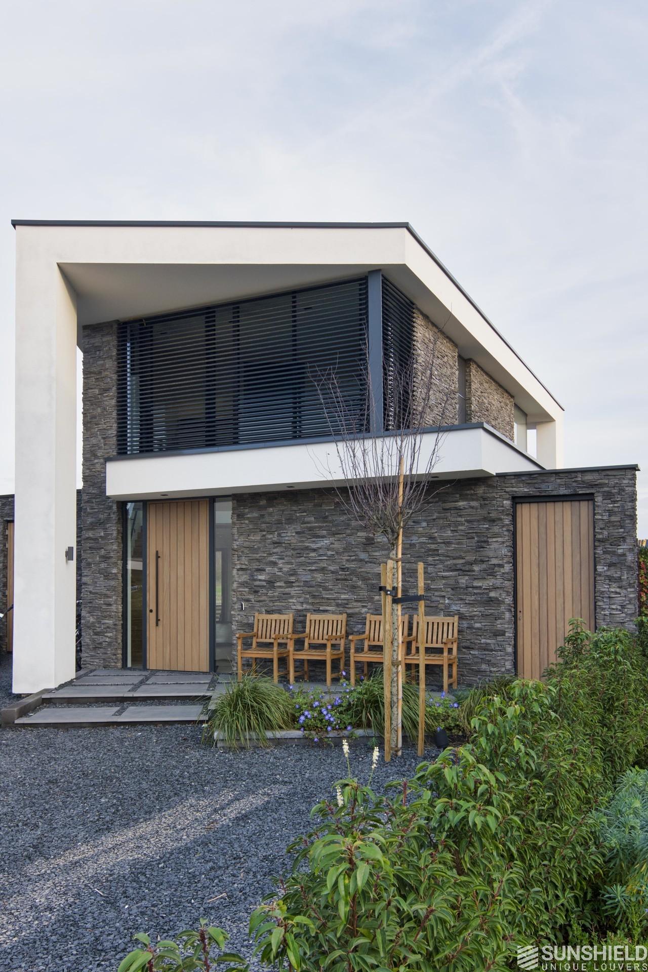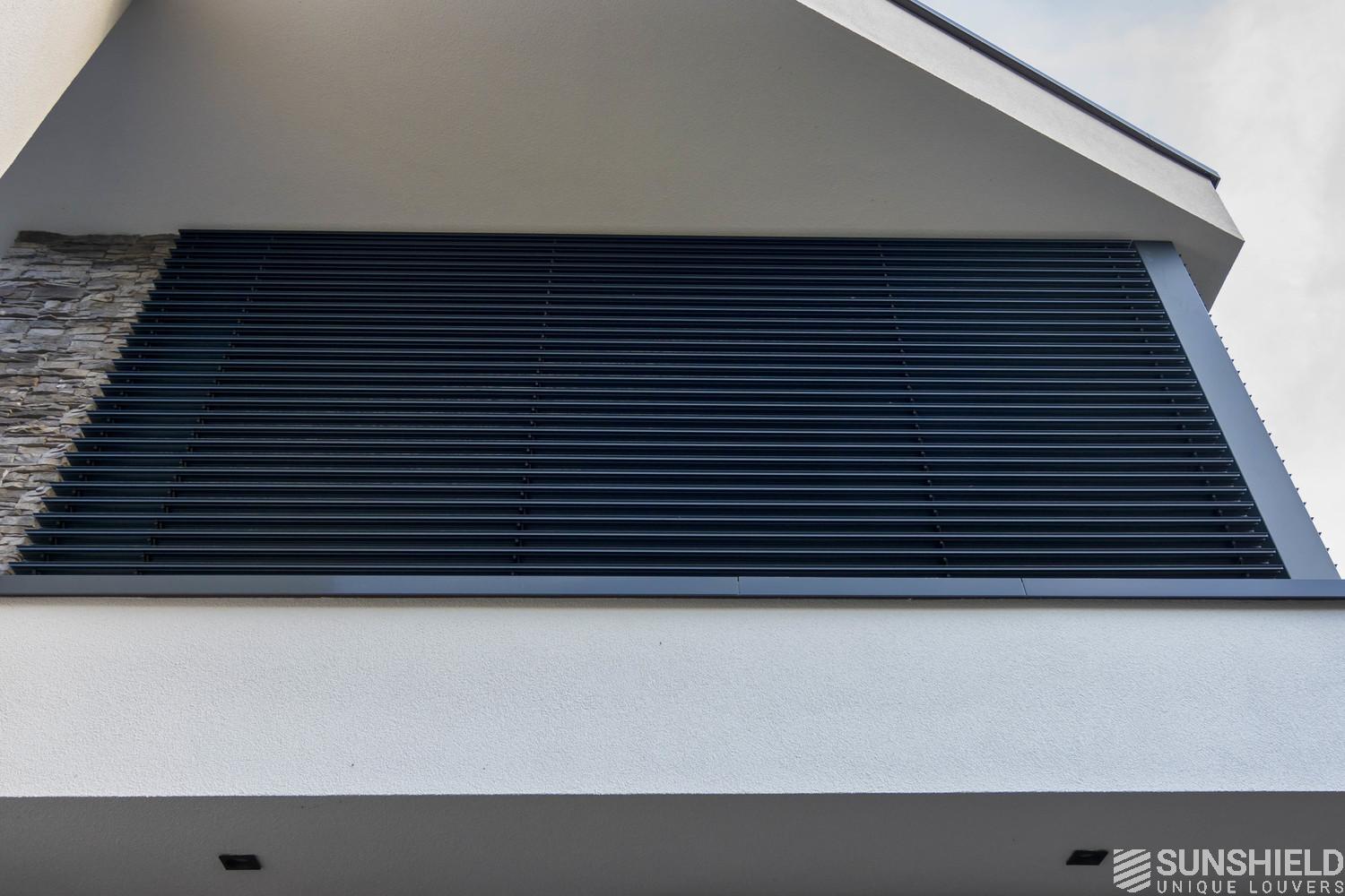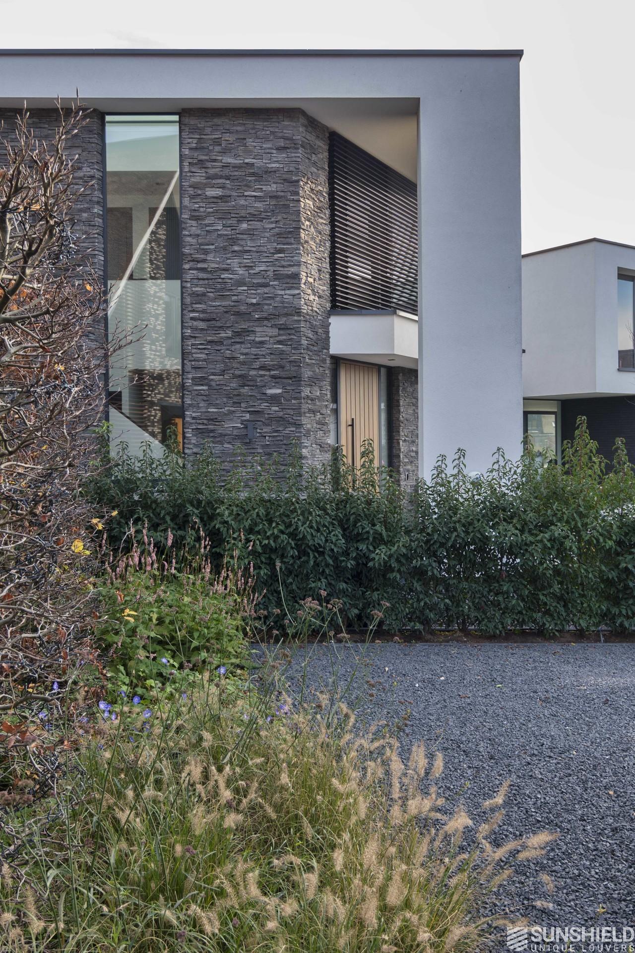 A modern detached house in Blaricum is fitted with two louver systems in a corner arrangement. A set angle profile has been placed on the corner where the two systems meet.