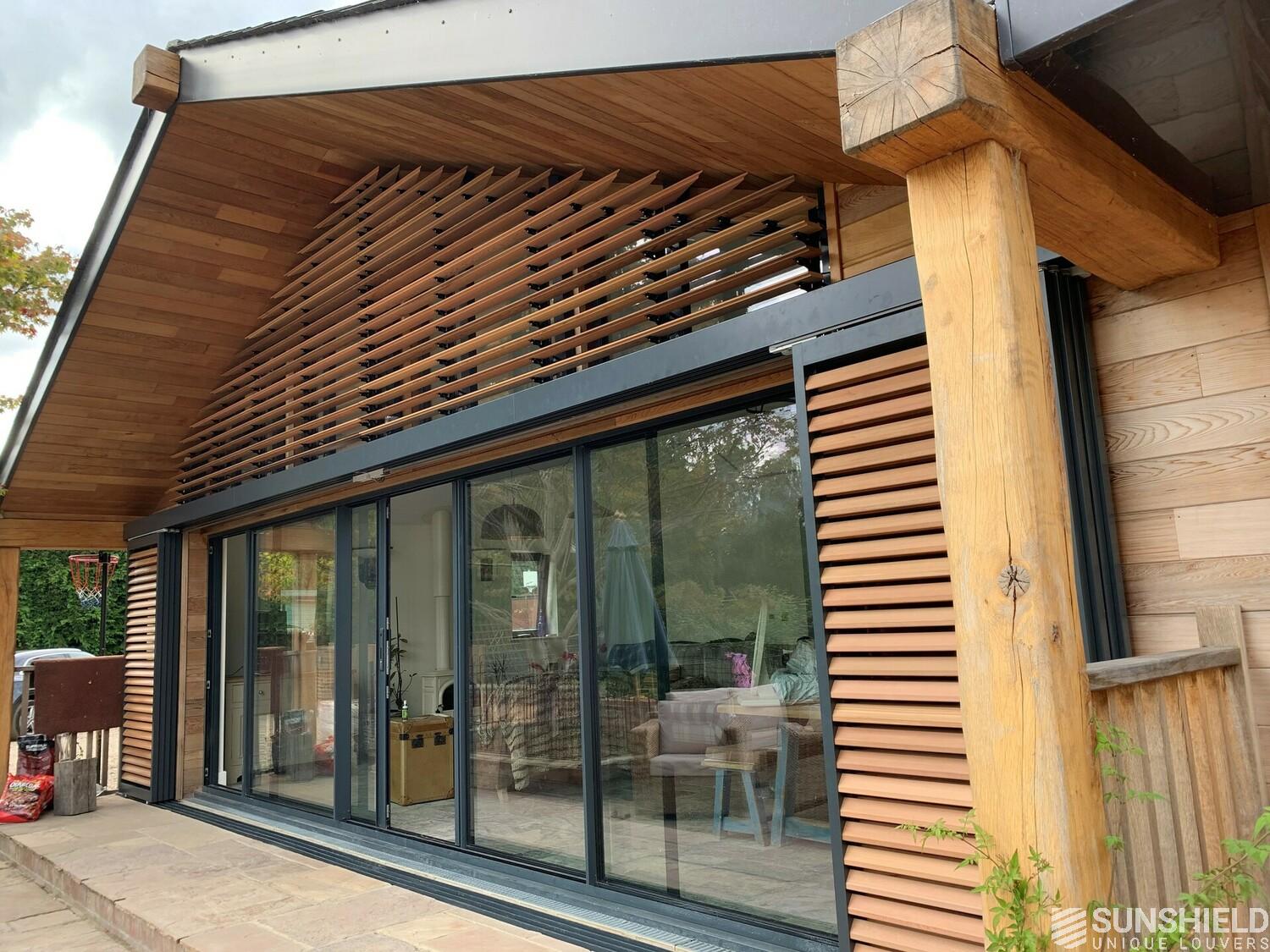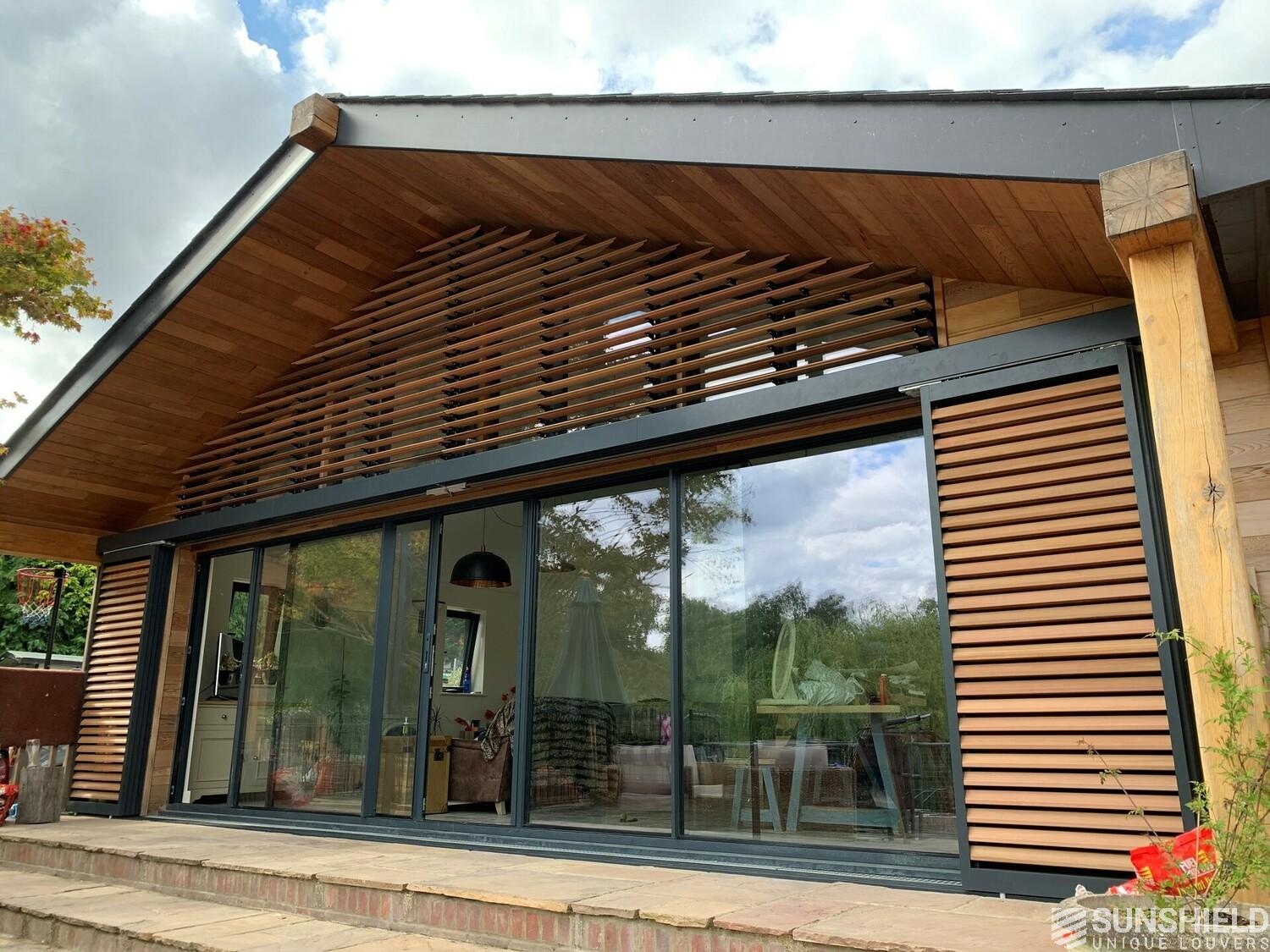 The slat of choice here, is the 98-W louver made from Western Red Cedar, Clear and Better 2. Top notch quality wood with a straight grain, lightweight, stable and durable.
