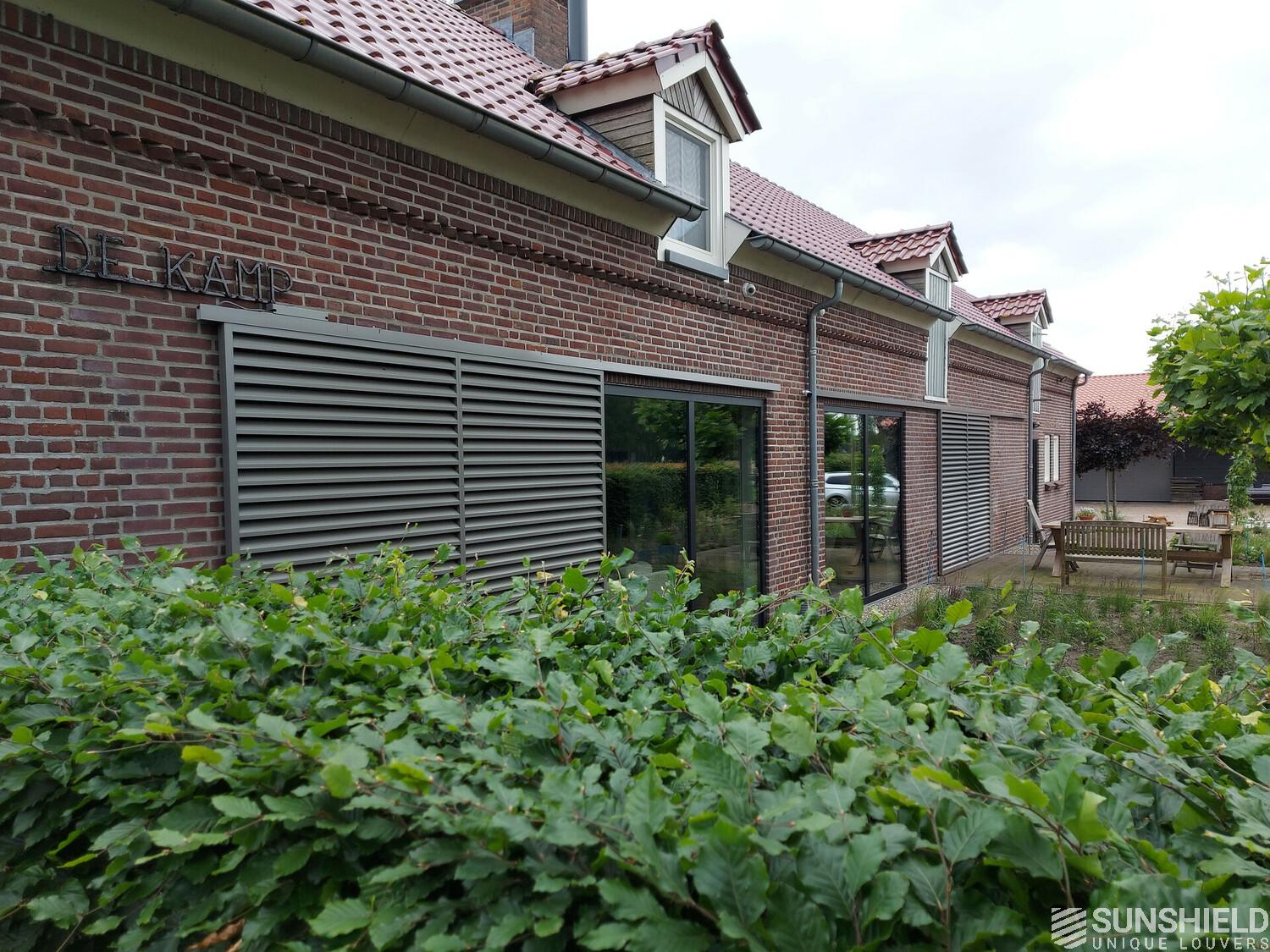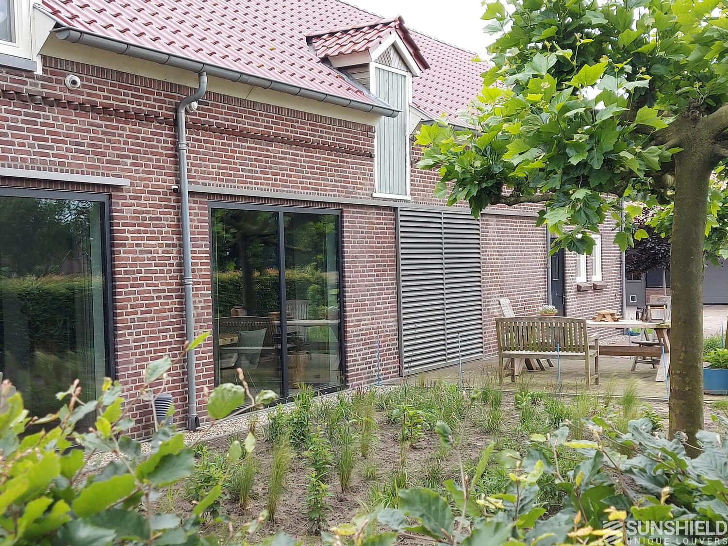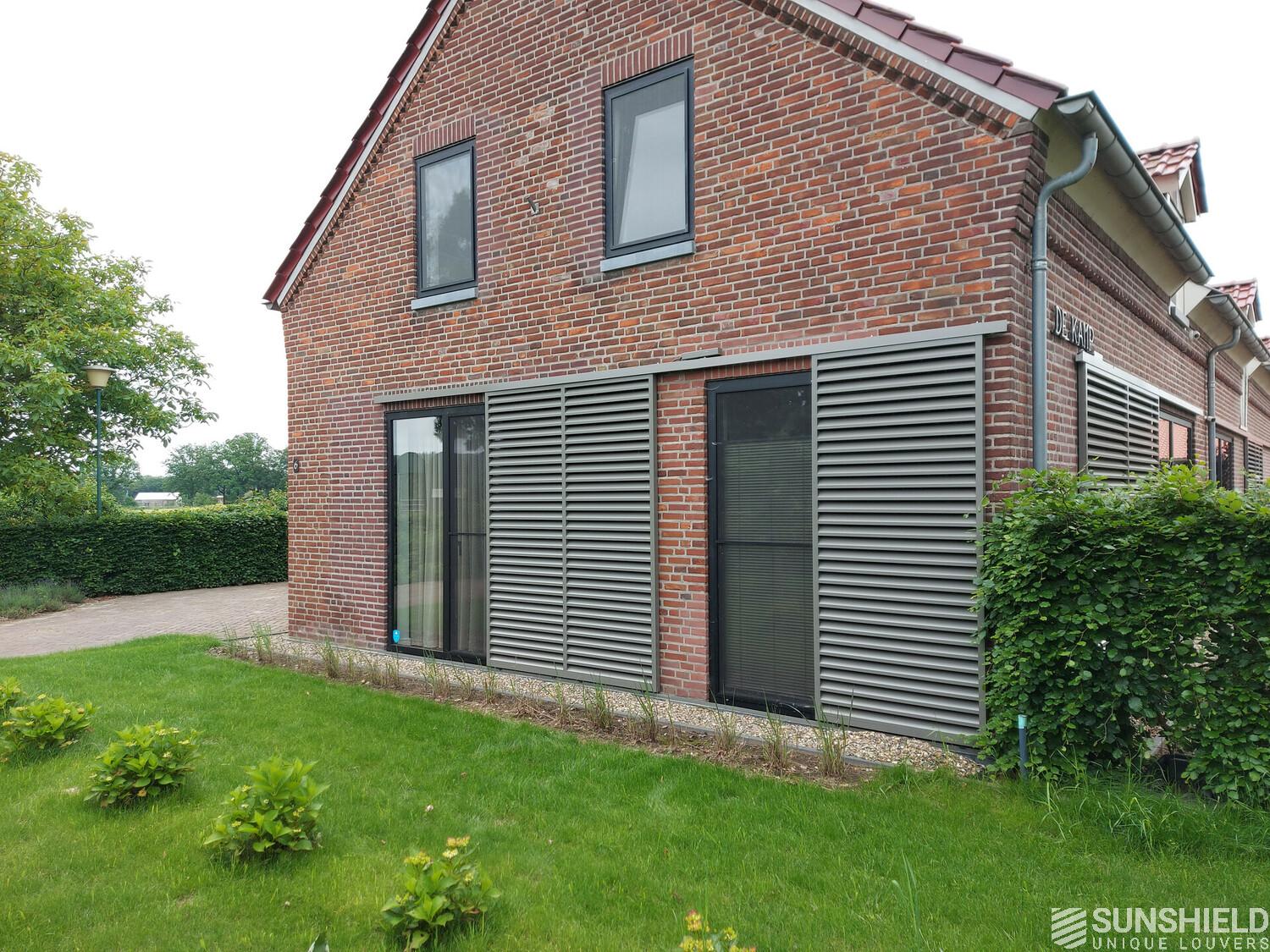 Here, two facades of a country house are equipped with sliding panels with aluminium louvers. By Sunshield, in collaboration with architectural firm Donkers Relou.
