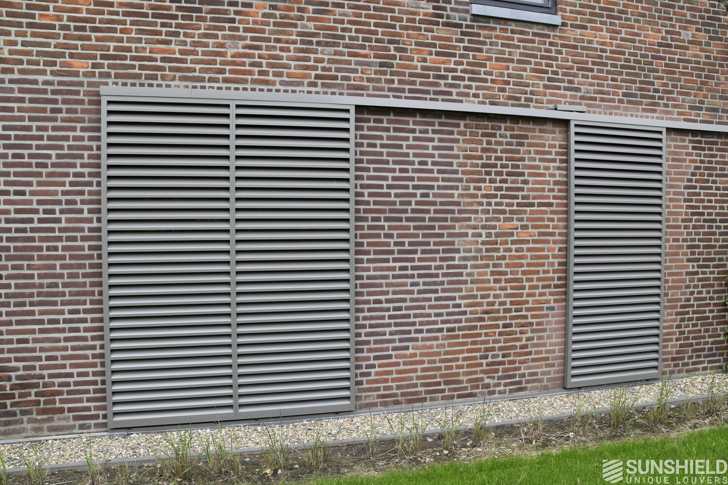 Sliding louver panels are a special application of outdoor sun protection. Panels are assembled complete with slats in the factory.