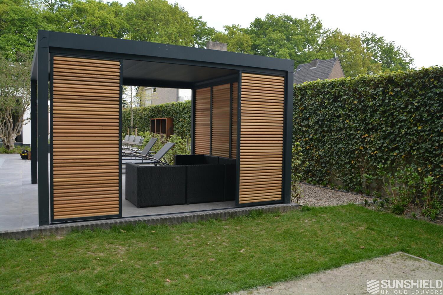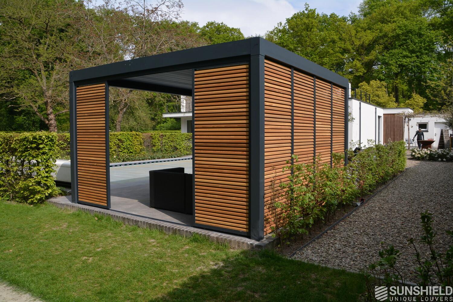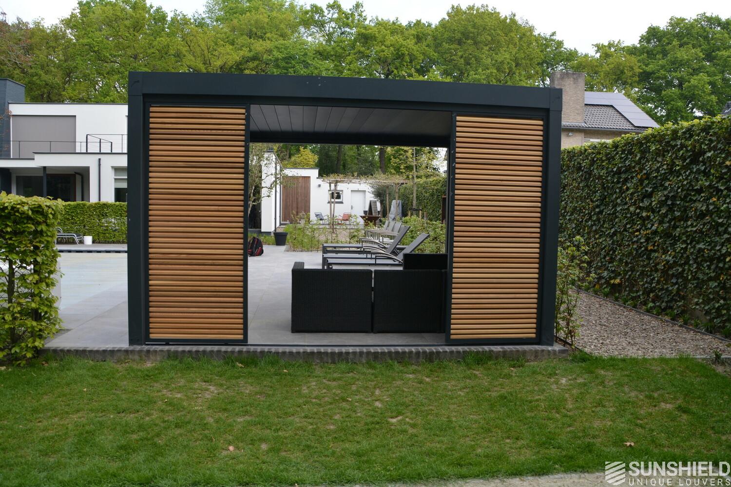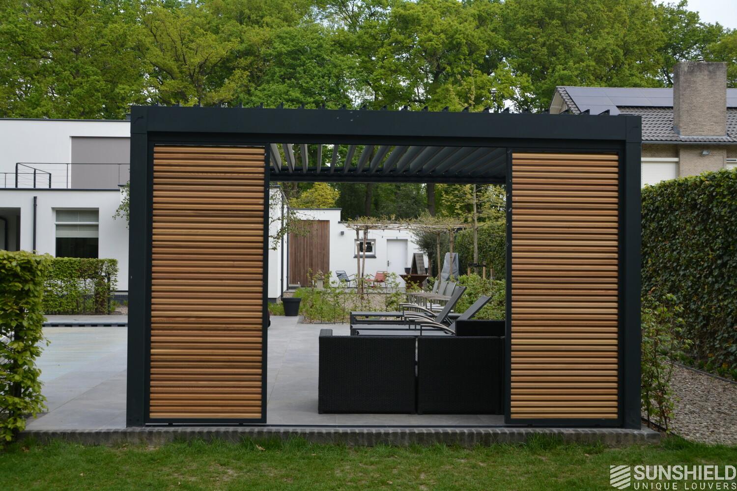 First, Sunshield created a louvered roof measuring 4 by 4 meters. Then, the rear wall was closed with four fixed panels, while two sliding panels are placed in the short wall on the outside.
