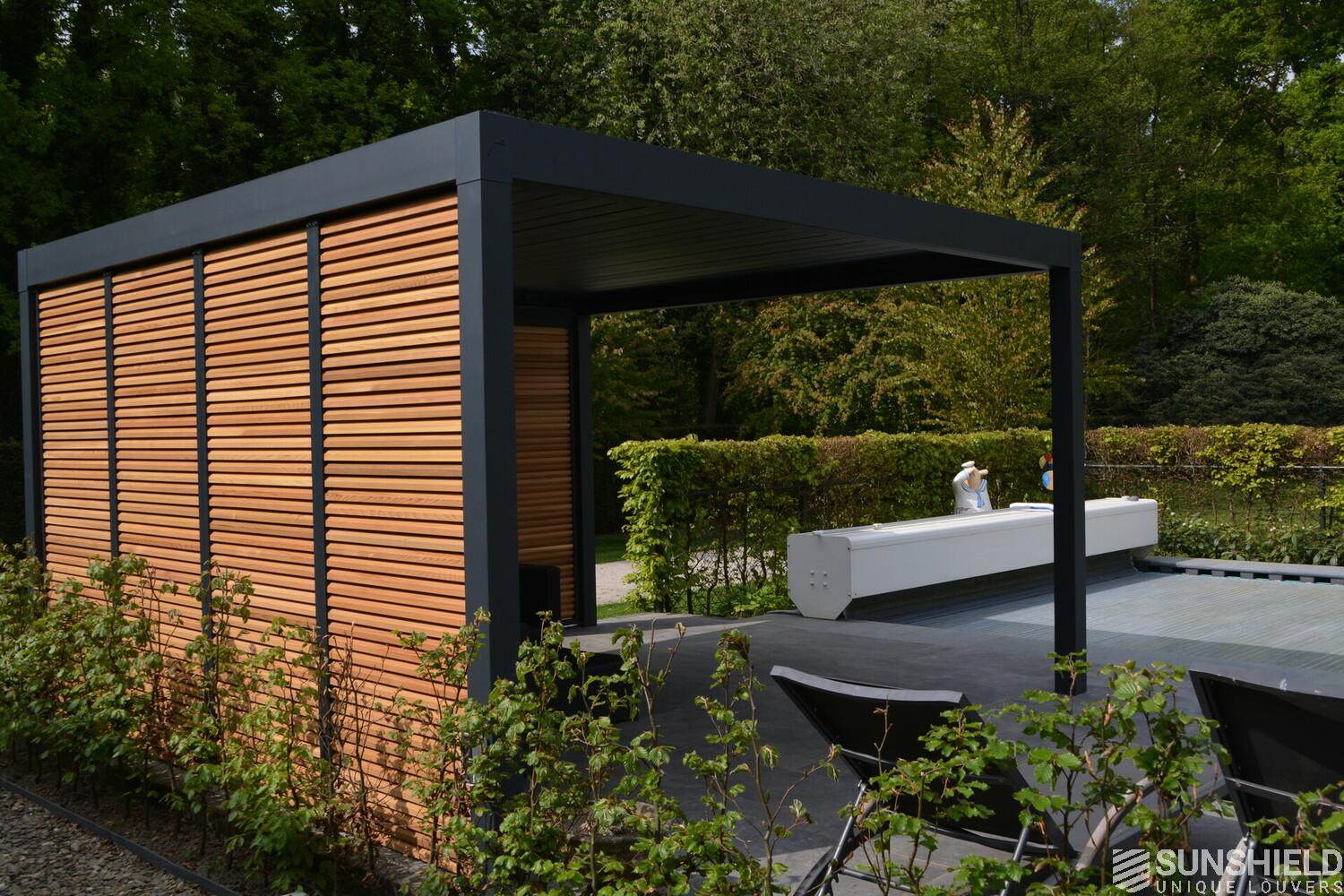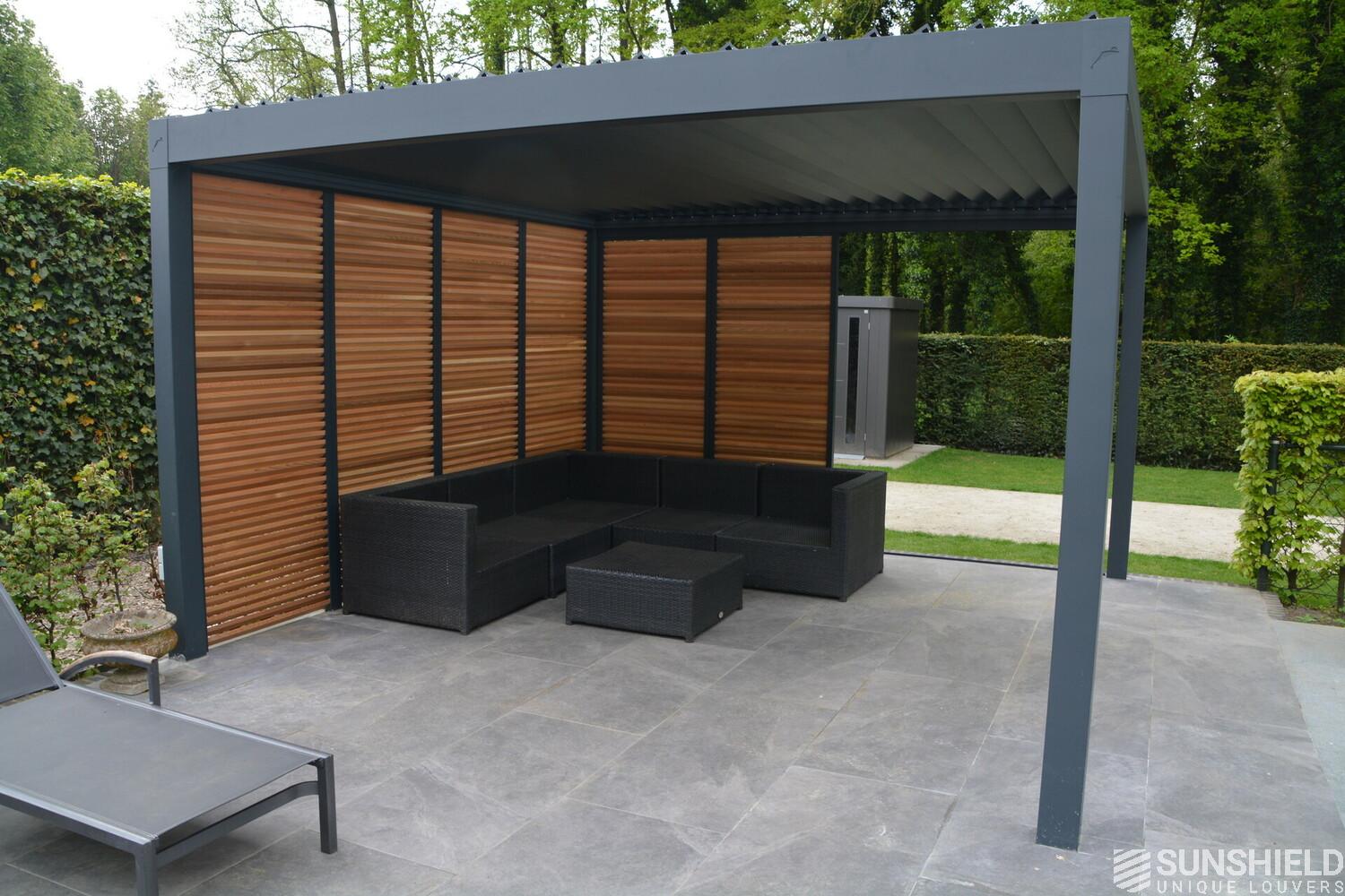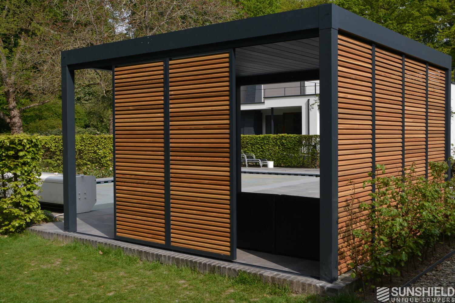 First, Sunshield created a louvered roof measuring 4 by 4 meters. Then, the rear wall was closed with four fixed panels, while two sliding panels are placed in the short wall on the outside.
