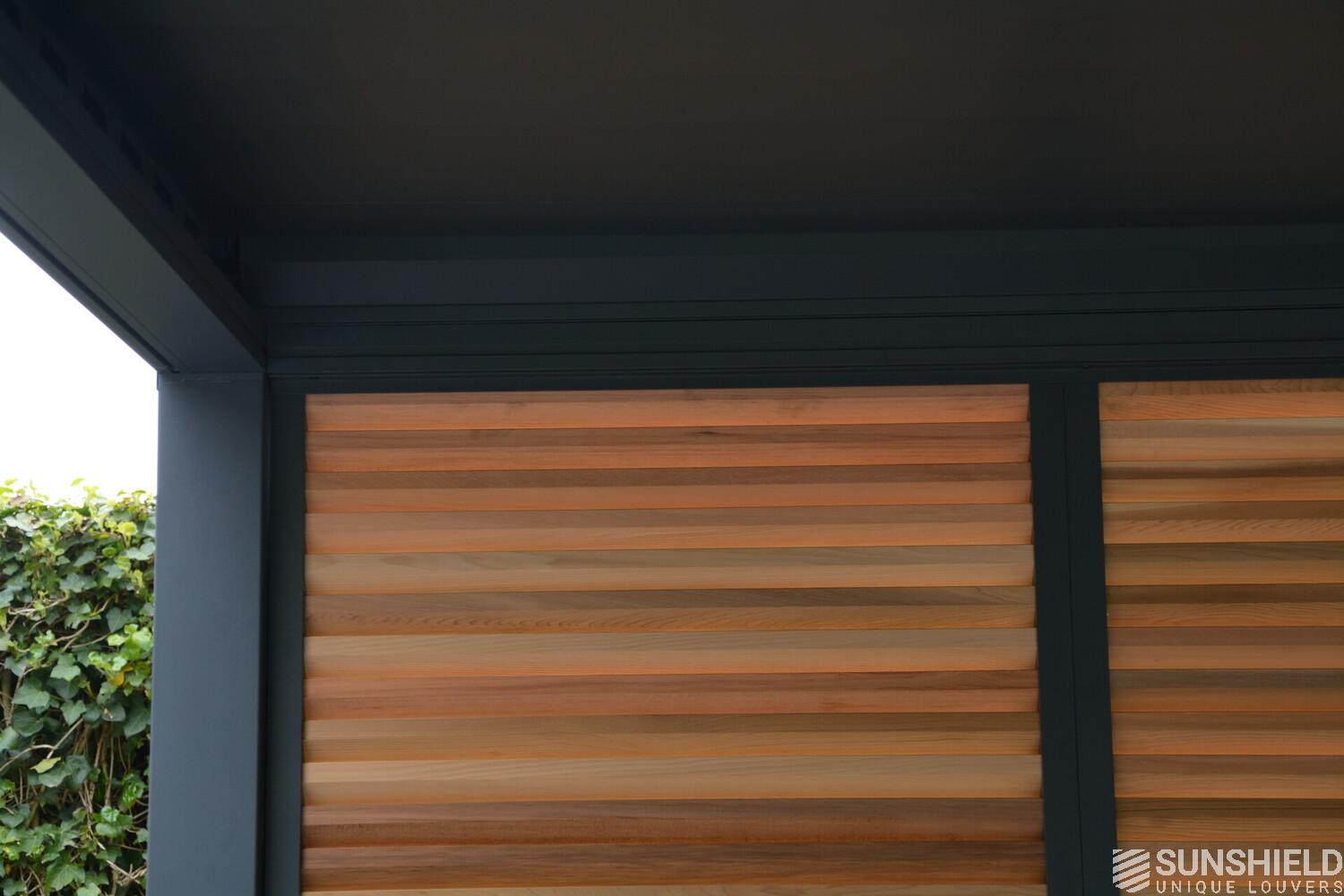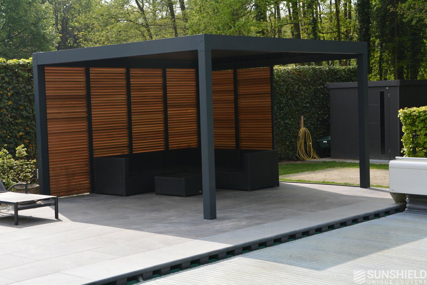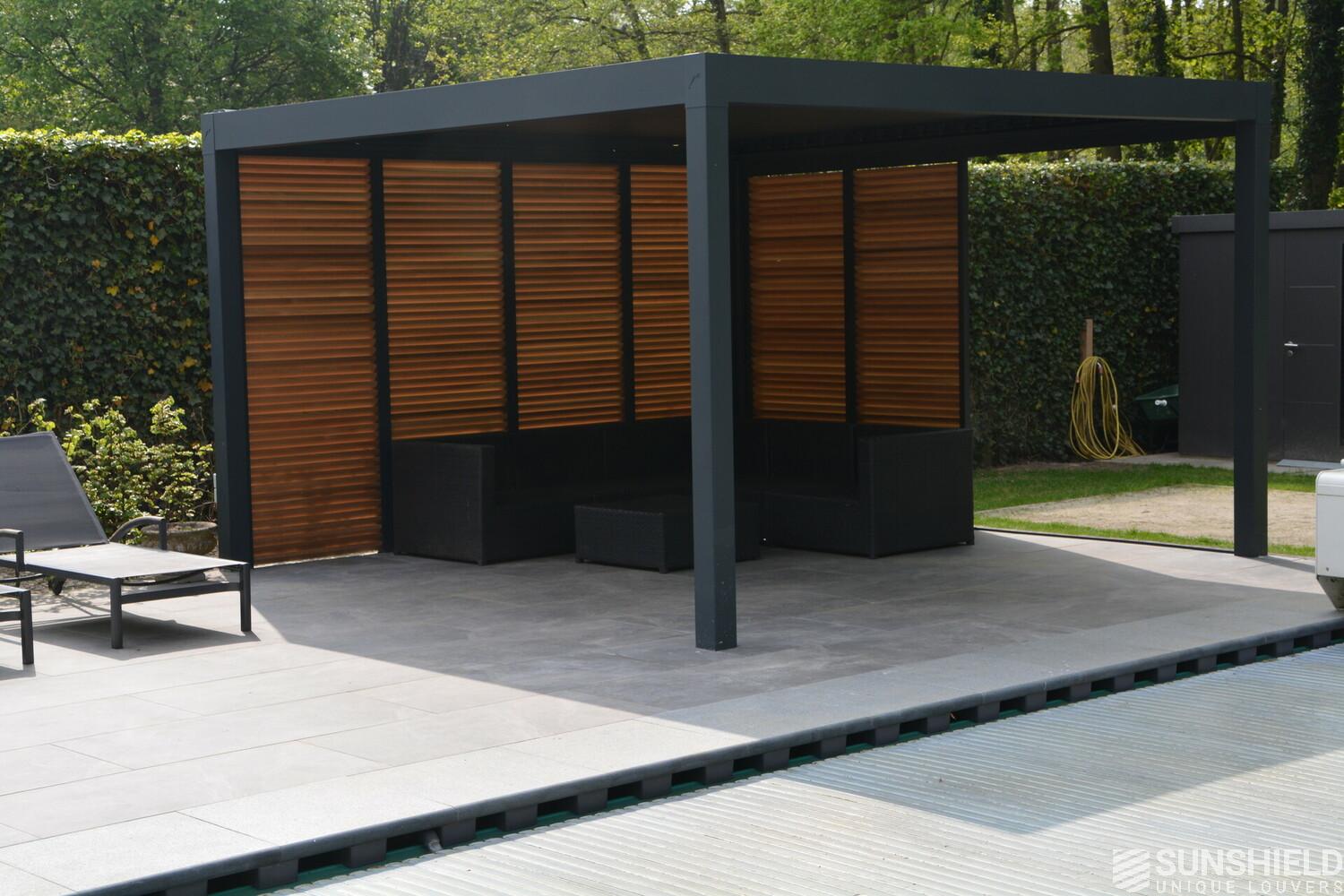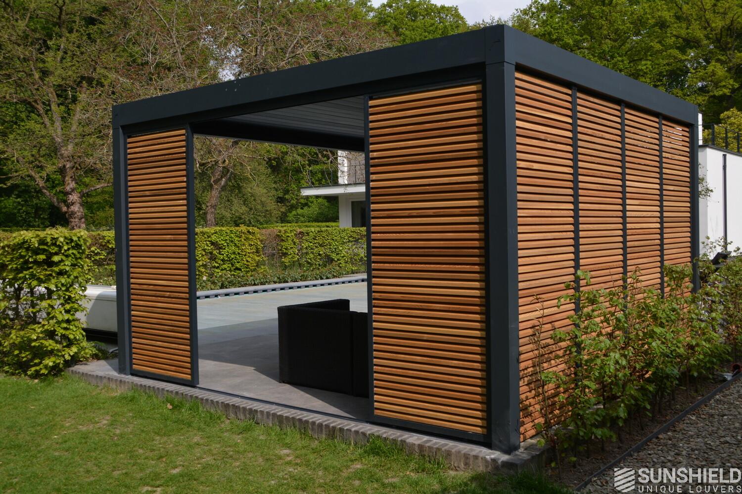 First, Sunshield created a louvered roof measuring 4 by 4 meters. Then, the rear wall was closed with four fixed panels, while two sliding panels are placed in the short wall on the outside.