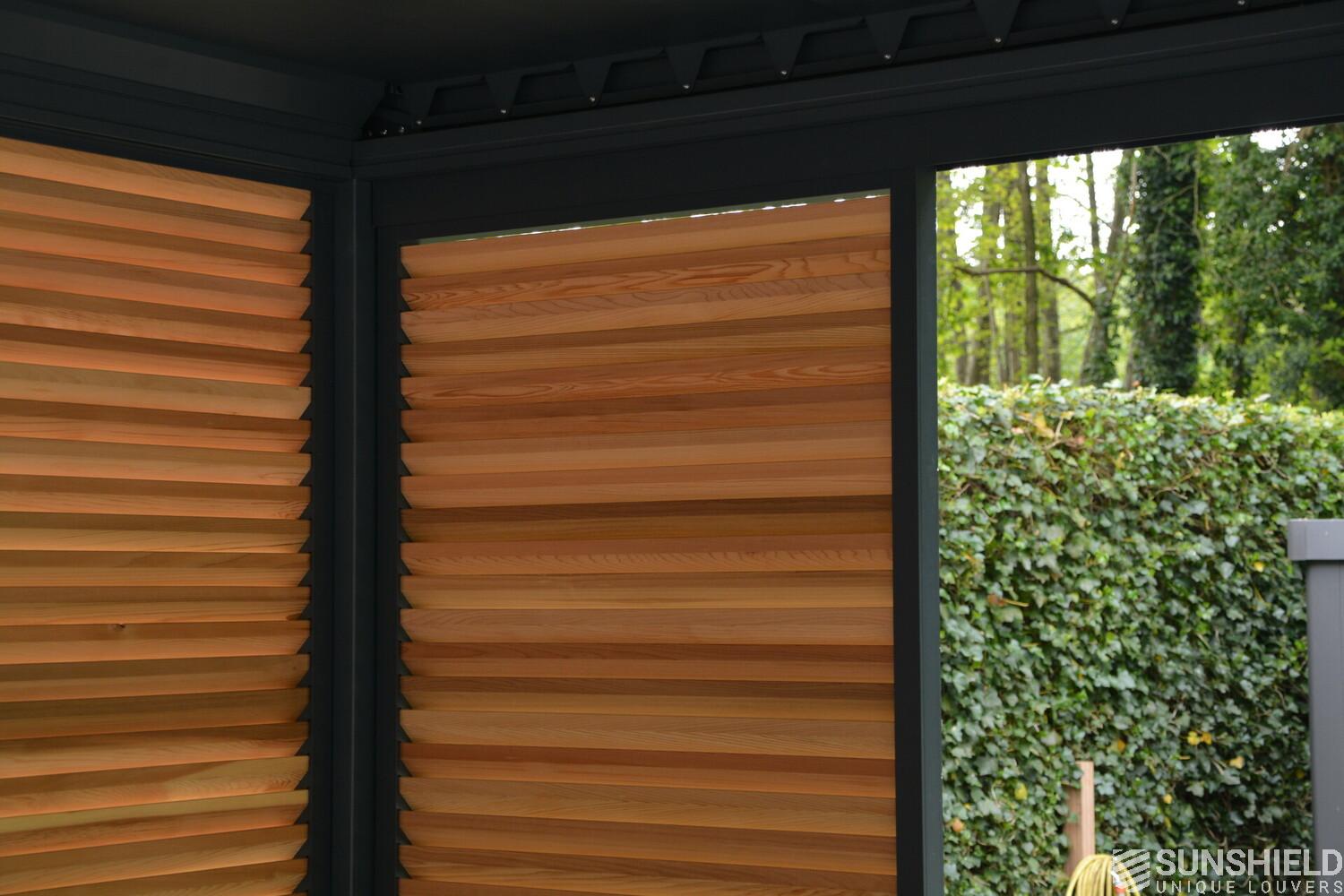 These sliding panels can be placed together or pushed apart as desired. It just depends on how you seek protection from the wind or prying eyes. Diamond-shaped rhombus slats made of Western Red Cedar wood have been placed in all panels.