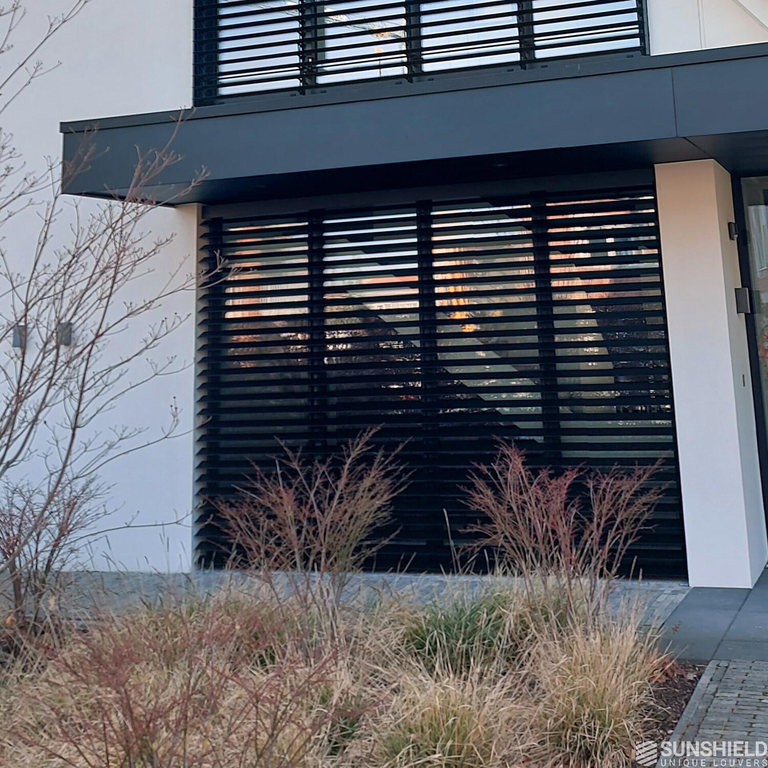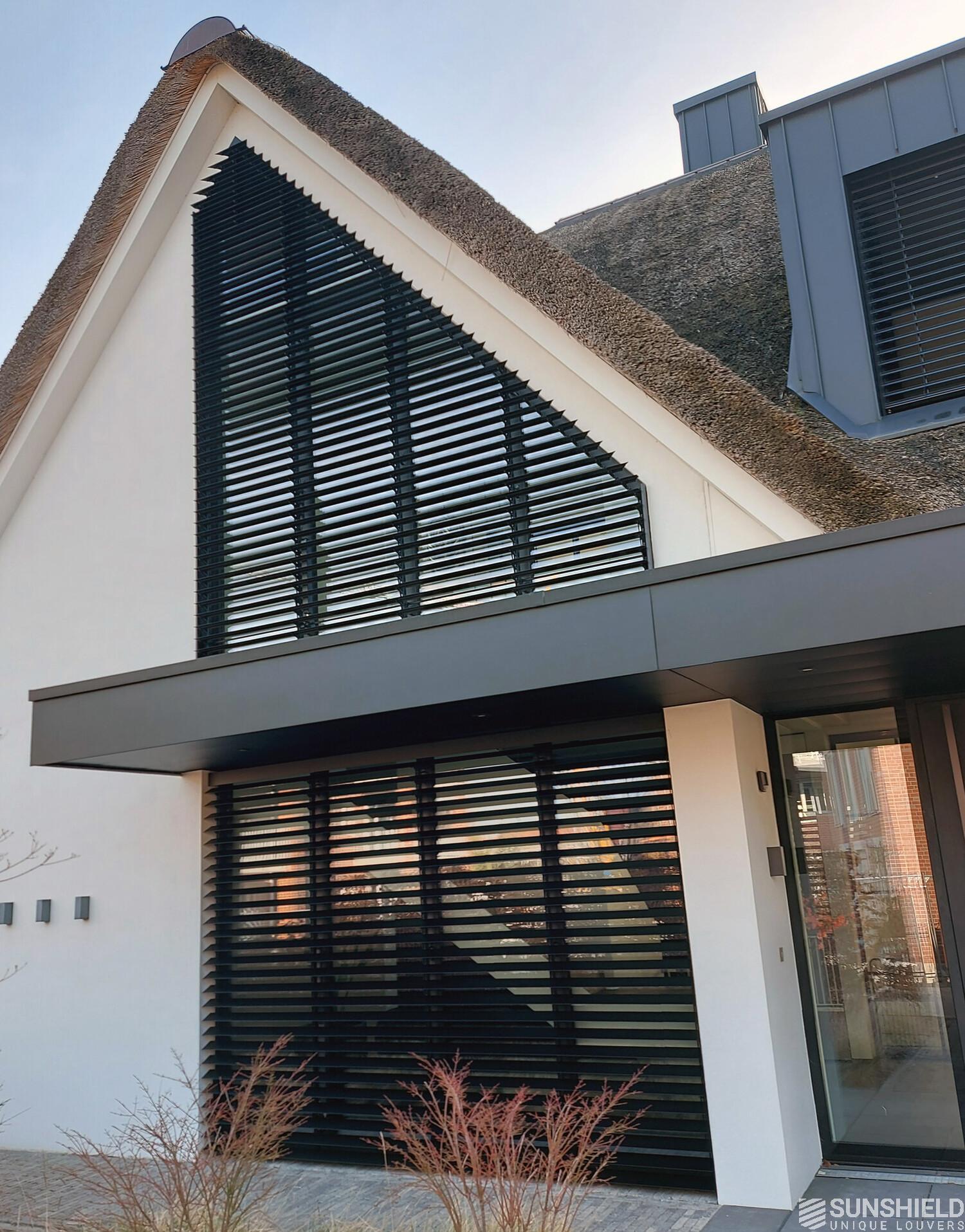 Here, a detached house has been fitted with unique louvers. By Sunshield, not only the design and production, but also the measuring and installation on site was done by their own fitters.