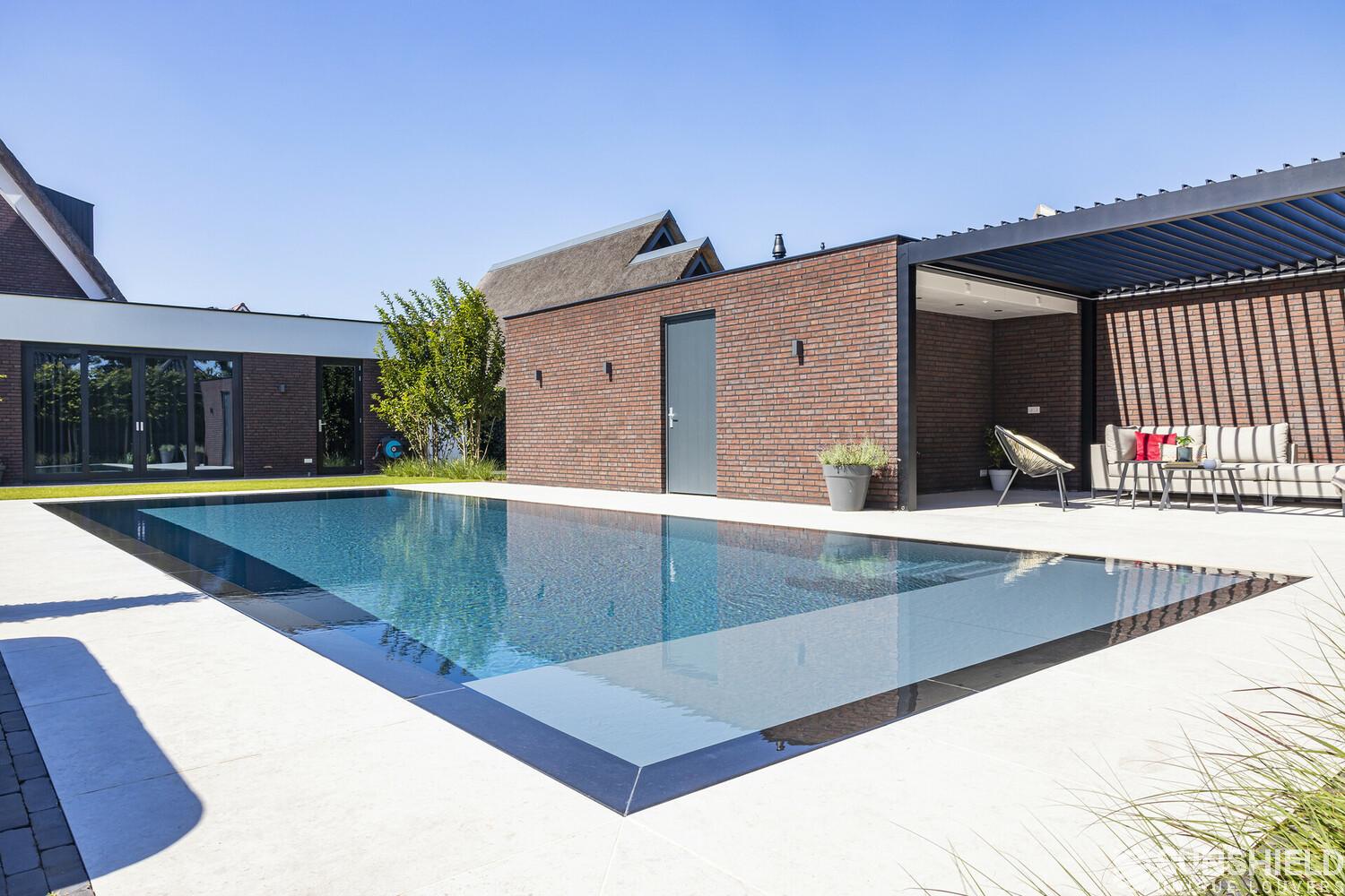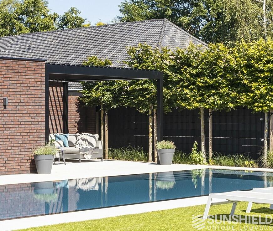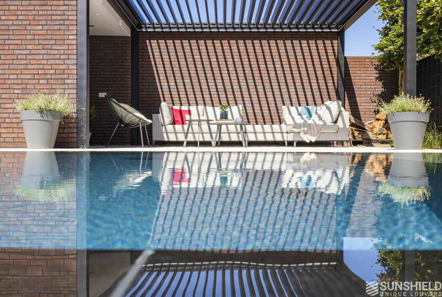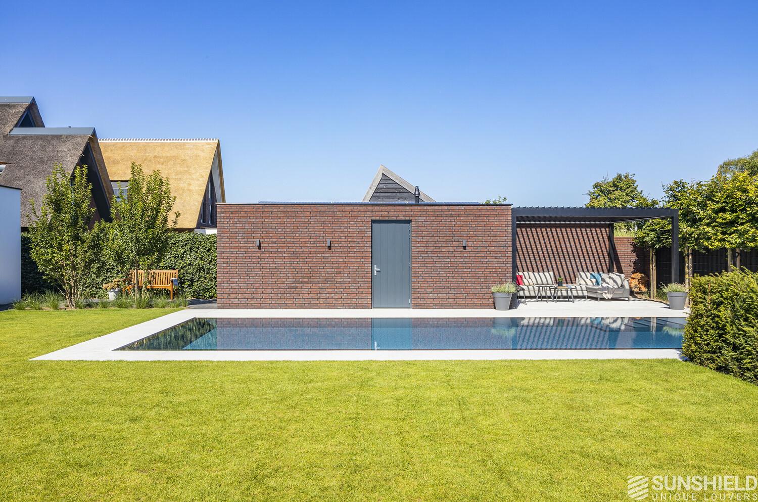 Here is a detached house fitted with a slatted roof, by Sunshield. The residents have opted for the Quadro. This louver roof owes its name to its robust, cubist appearance.