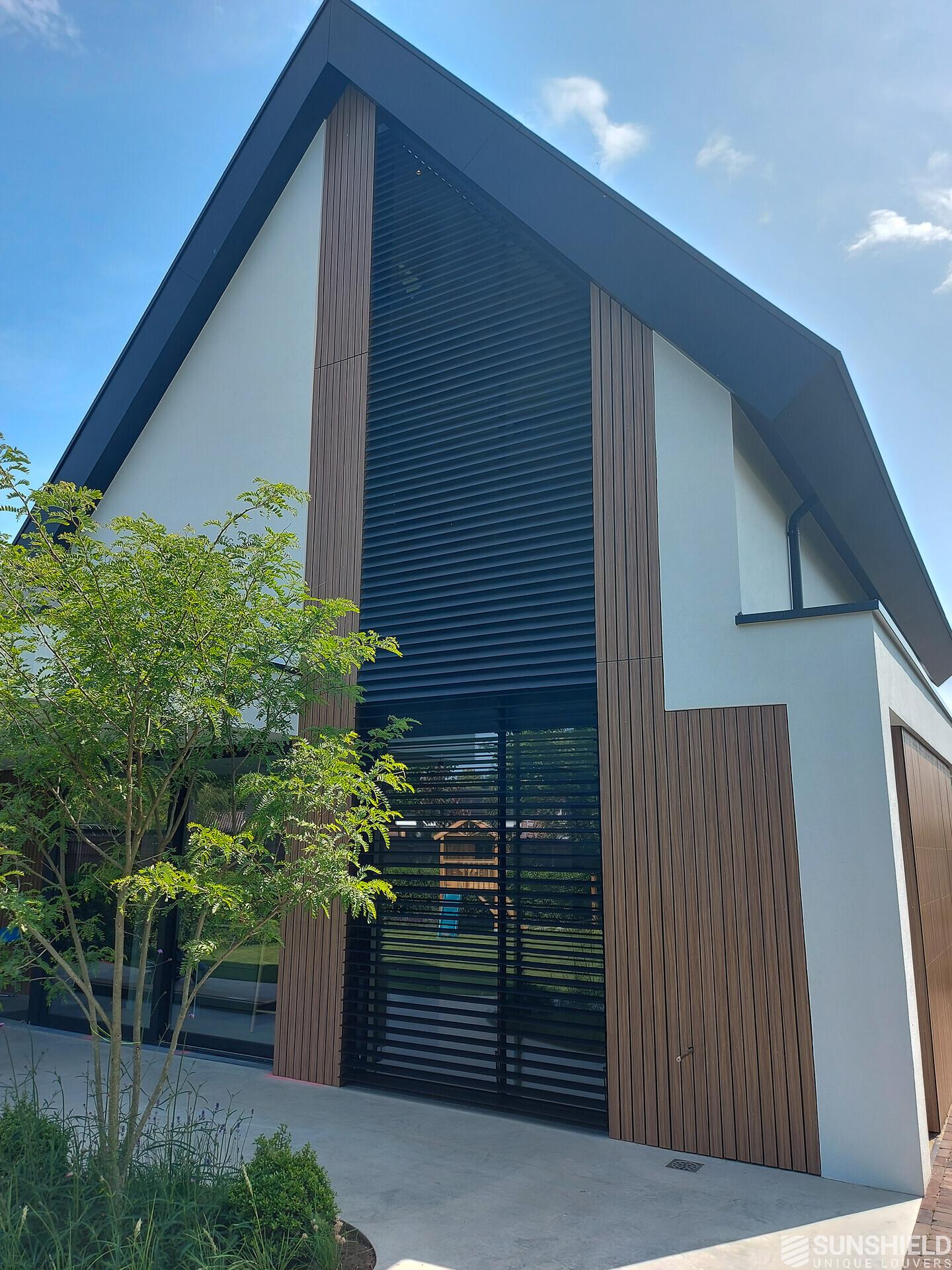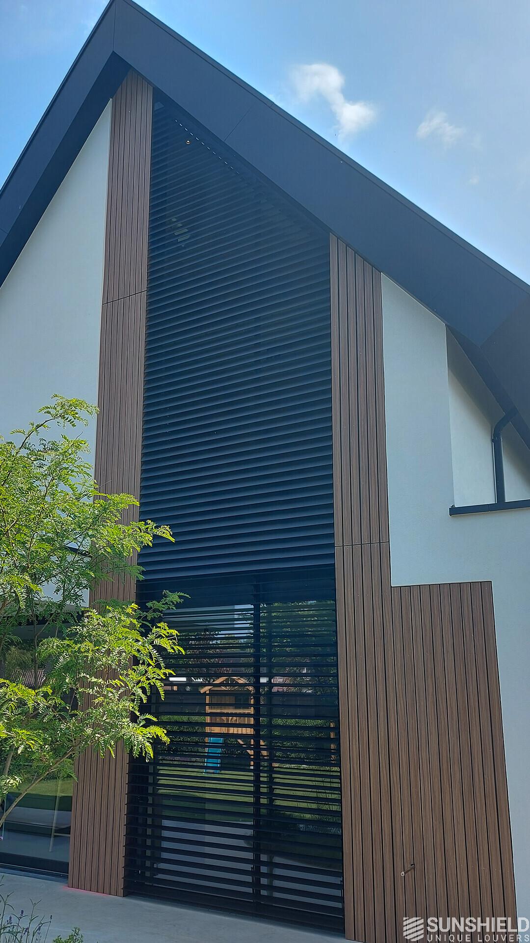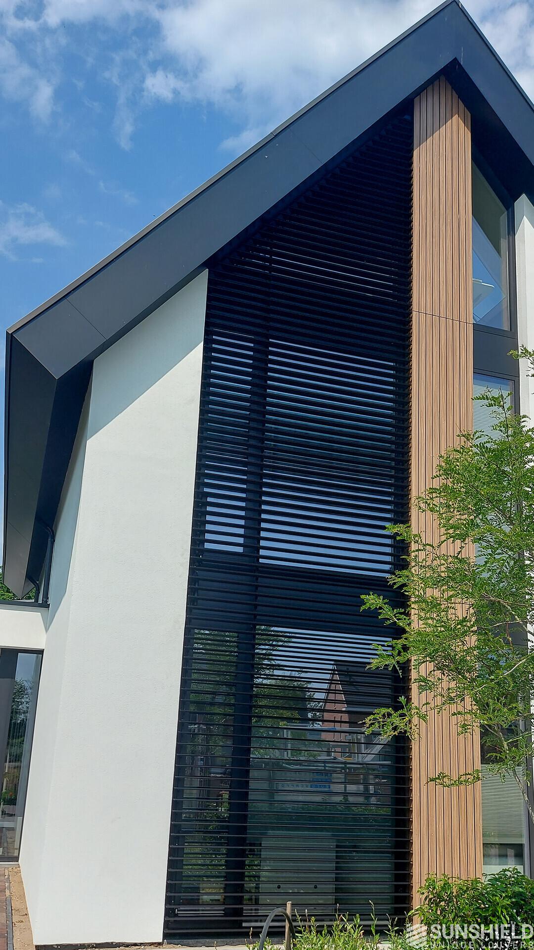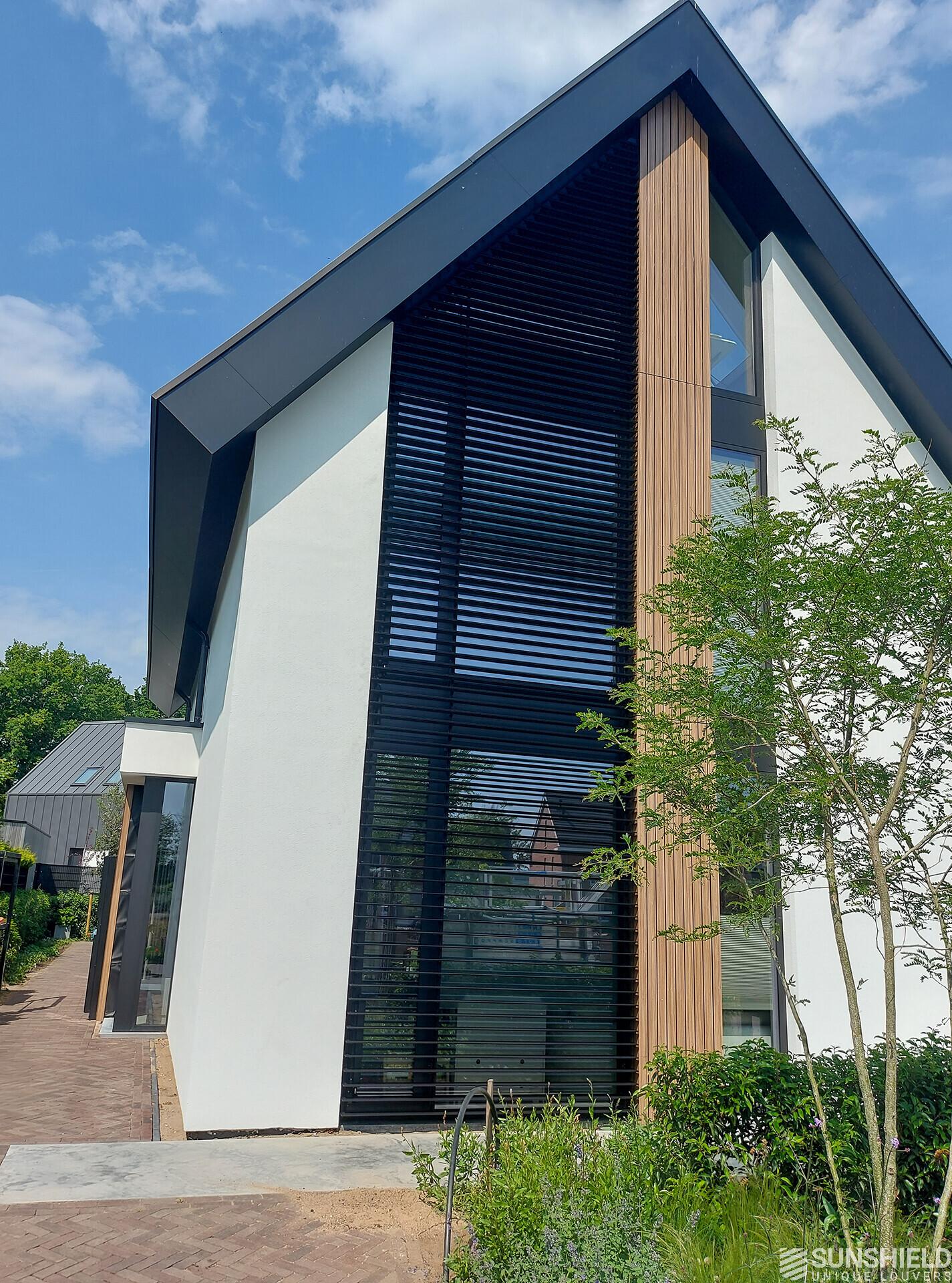 Here, the front and back facades of a detached house are equipped with unique louvers, by Sunshield. The facade on the street side faces east and the garden side faces west.